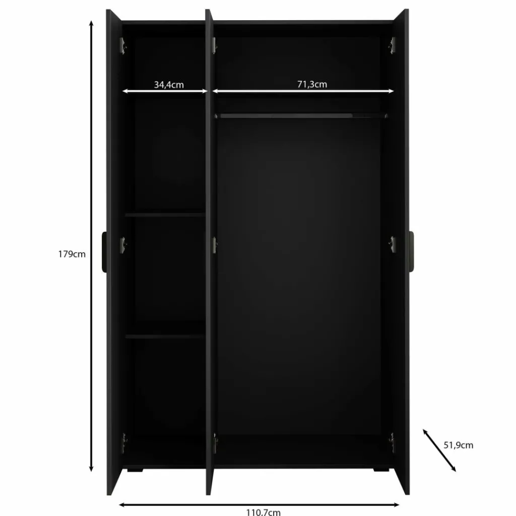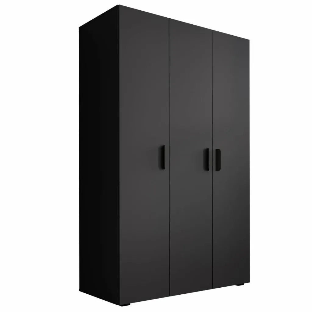 Kledingkast Brussel is uitgevoerd in strak antraciet en voorzien van drie deuren met handgrepen. De kast is 111 cm breed en 179 cm hoog, wat hem geschikt maakt voor kleinere slaapkamers of extra opbergruimte.