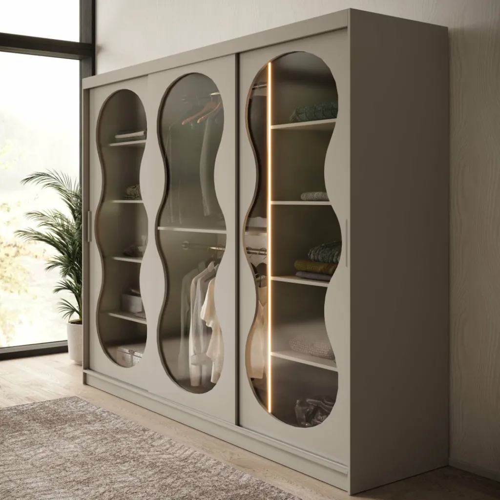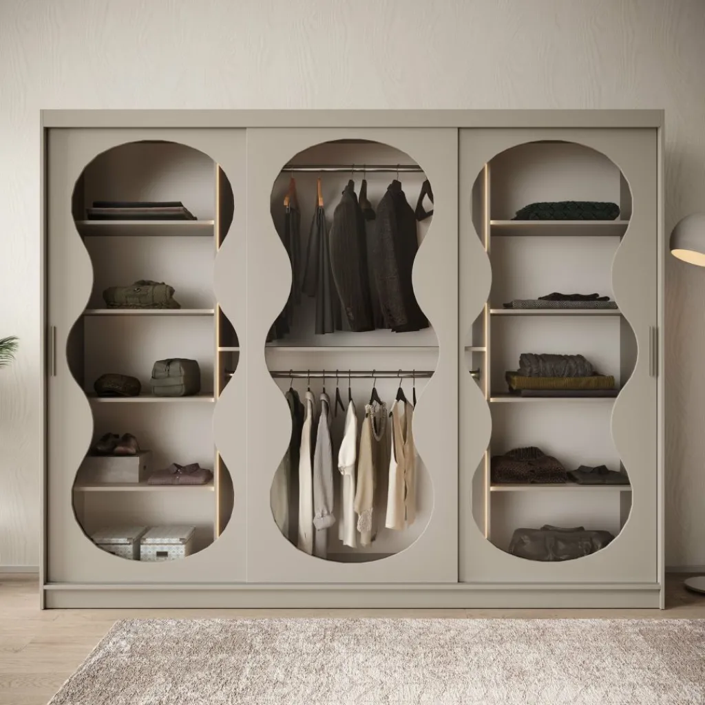 De lichte beige kleur maakt de kast geschikt voor uiteenlopende interieurstijlen en brengt een rustige, moderne sfeer in de slaapkamer. Een functionele en stijlvolle keuze voor wie veel opbergruimte zoekt zonder in te leveren op design.