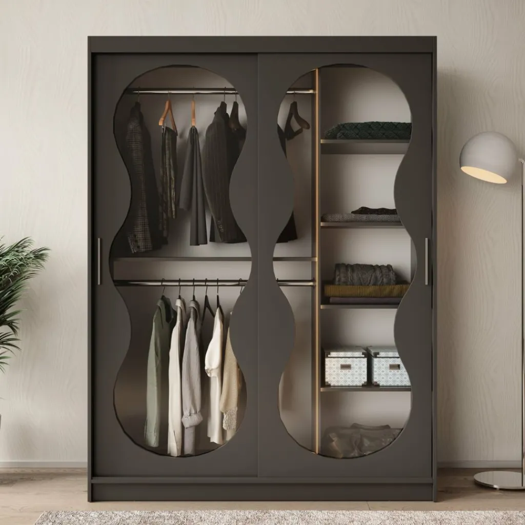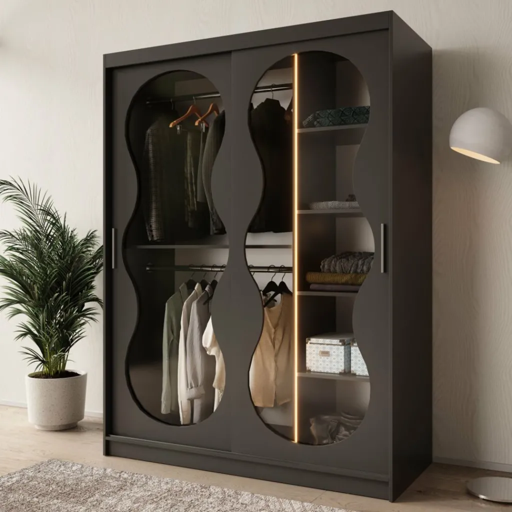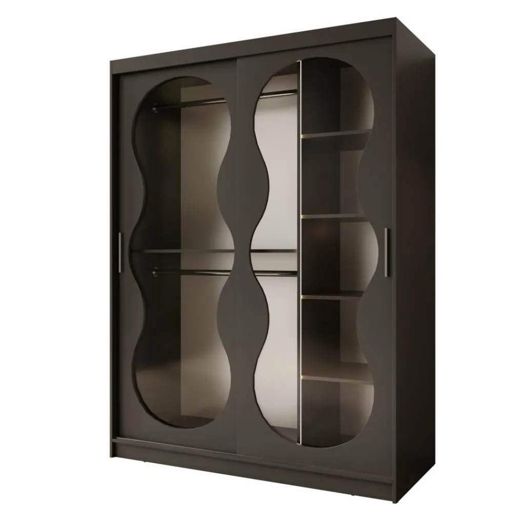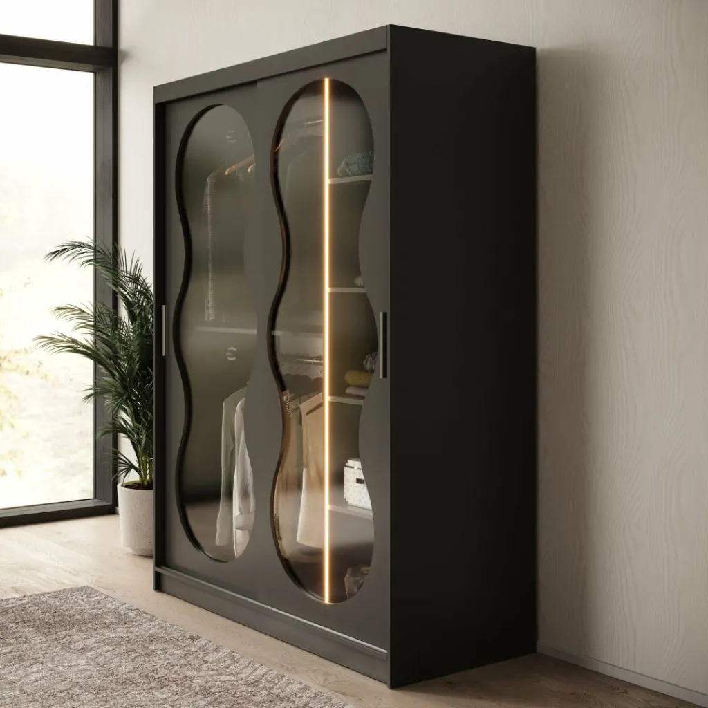 De Bunaro kledingkast in zwart is een stijlvolle kast met een modern en luxe karakter. De unieke golvende vorm van de glazen deuren geeft het ontwerp een elegante uitstraling en zorgt voor een speels lichtspel in combinatie met de geïntegreerde LED-verlichting.