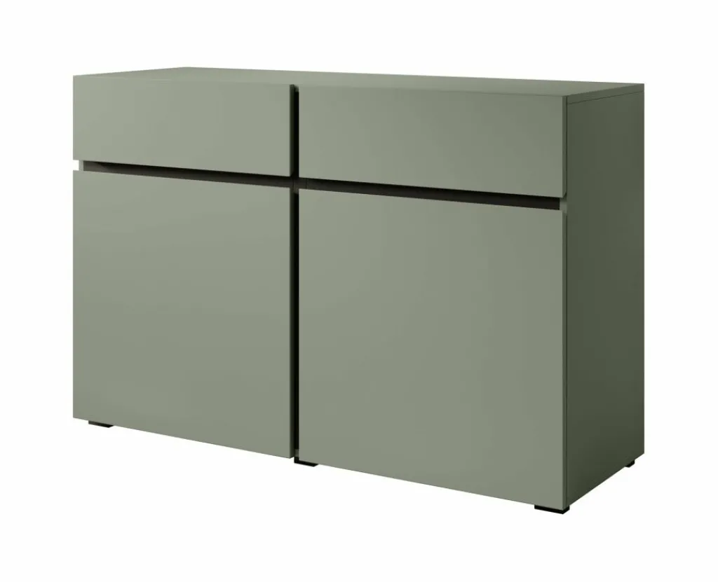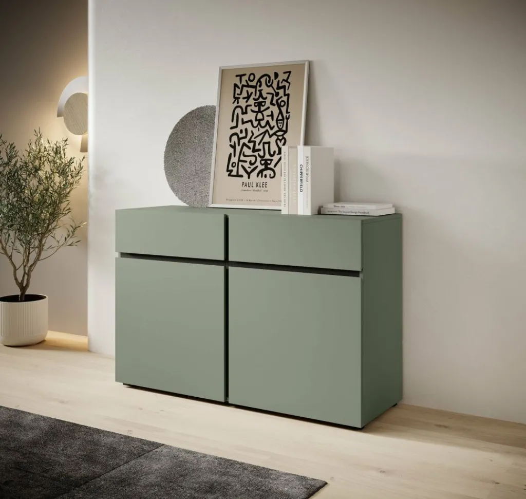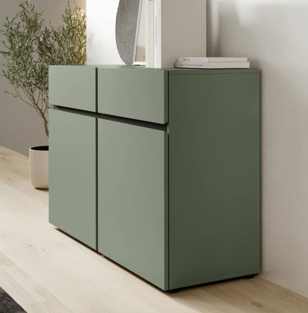 De kast heeft twee deuren met daarachter vier opbergvakken. Daarboven bevinden zich twee lades. De deuren en lades zijn greeploos en vanaf de bovenzijde via een inkeping te openen.