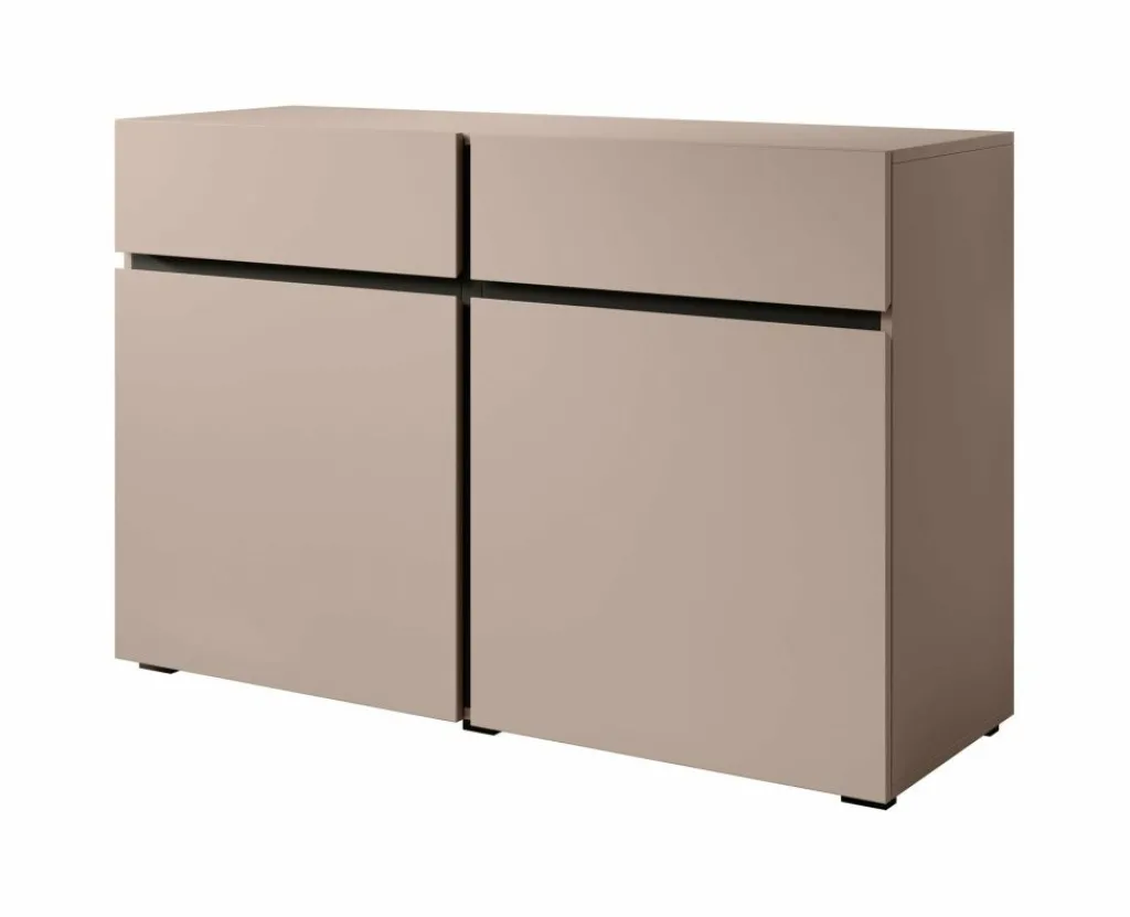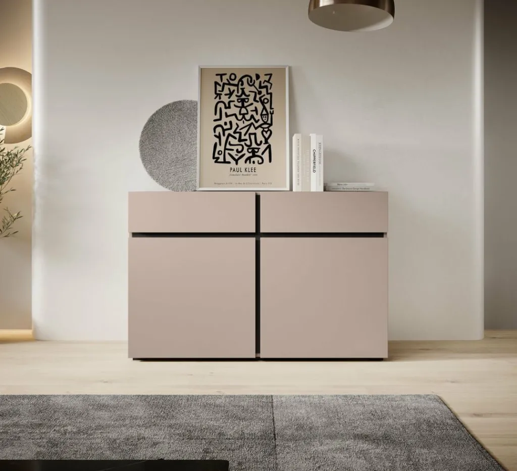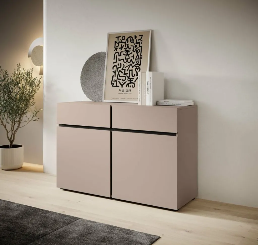 De kast heeft twee deuren met daarachter vier opbergvakken. Daarboven bevinden zich twee lades. De deuren en lades zijn greeploos en vanaf de bovenzijde via een inkeping te openen.