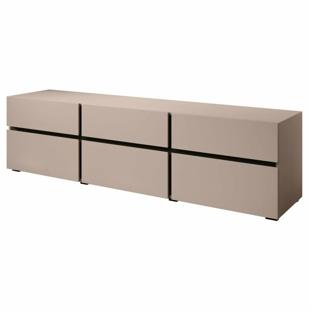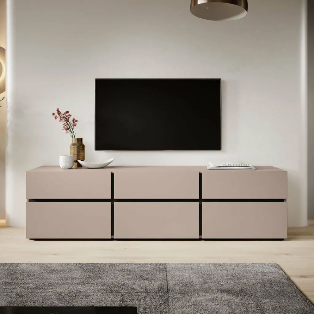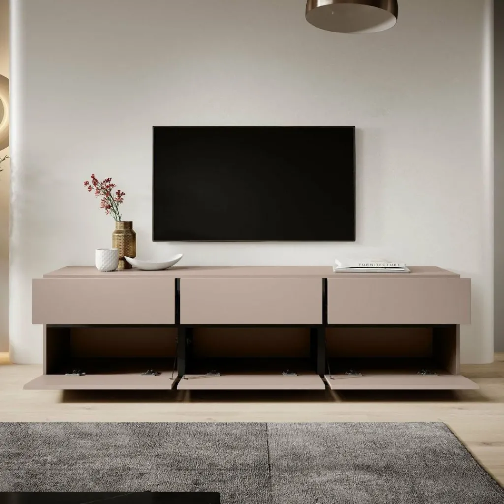 De Cainen heeft 3 kleppen. Daarachter bevinden zich 3 opbergvakken. Hierboven zitten 3 handige opberglades. De lades en kleppen zijn greeploos en via een inkeping te openen. Het tv-meubel staat op lage, zwarte pootjes.