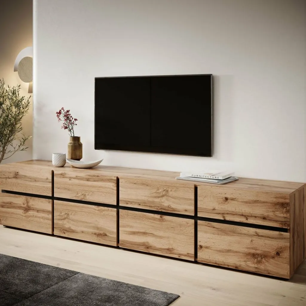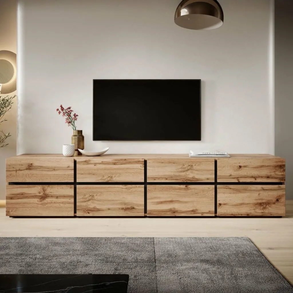 De Cainen heeft 4 kleppen. Daarachter bevinden zich 4 opbergvakken. Hierboven zitten 4 handige opberglades. De lades en kleppen zijn greeploos en via een inkeping te openen. Het tv-meubel staat op lage, zwarte pootjes.