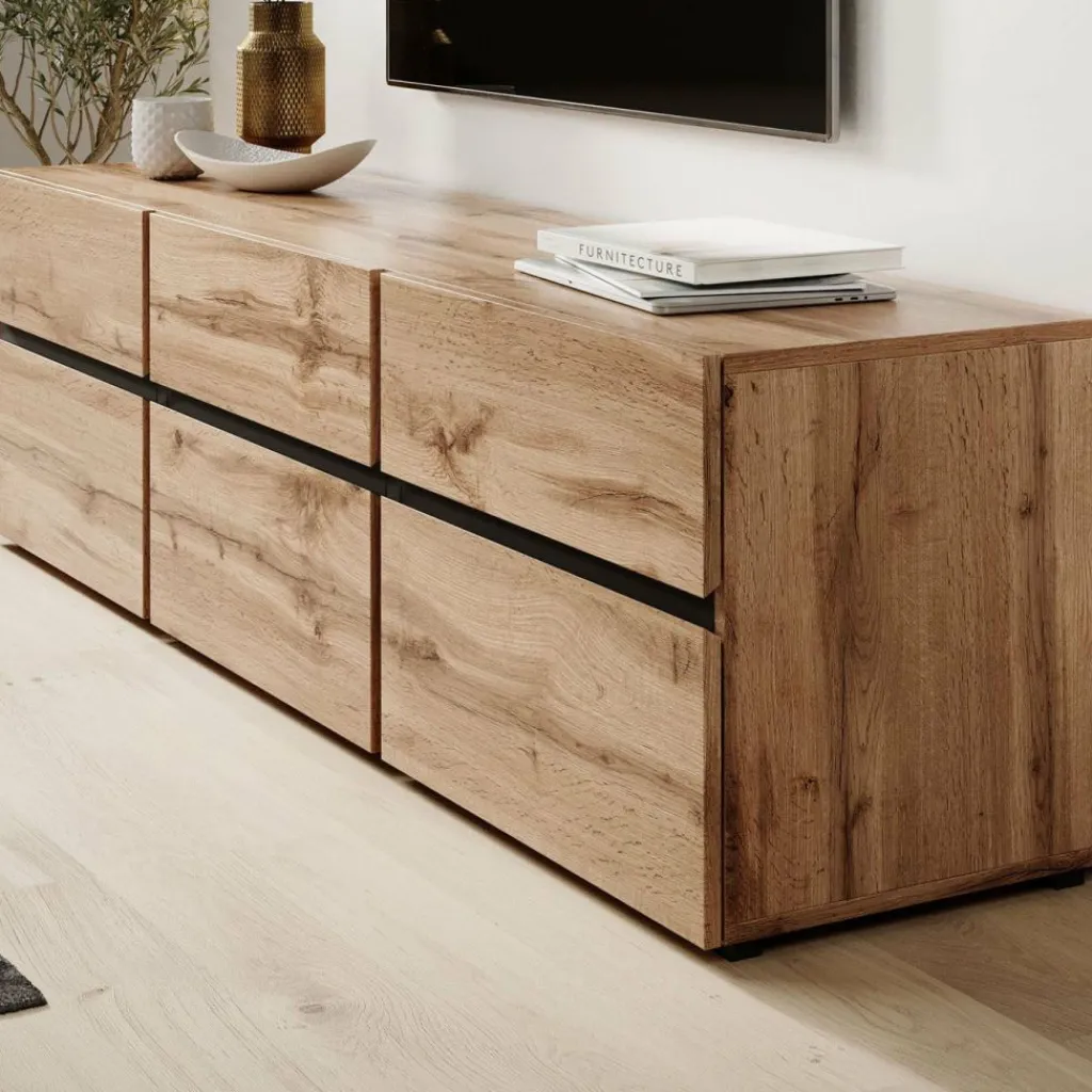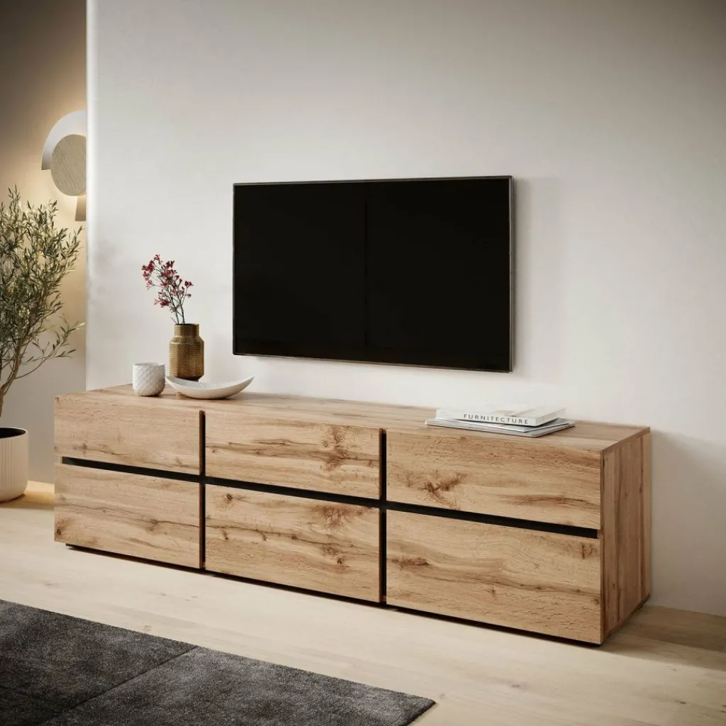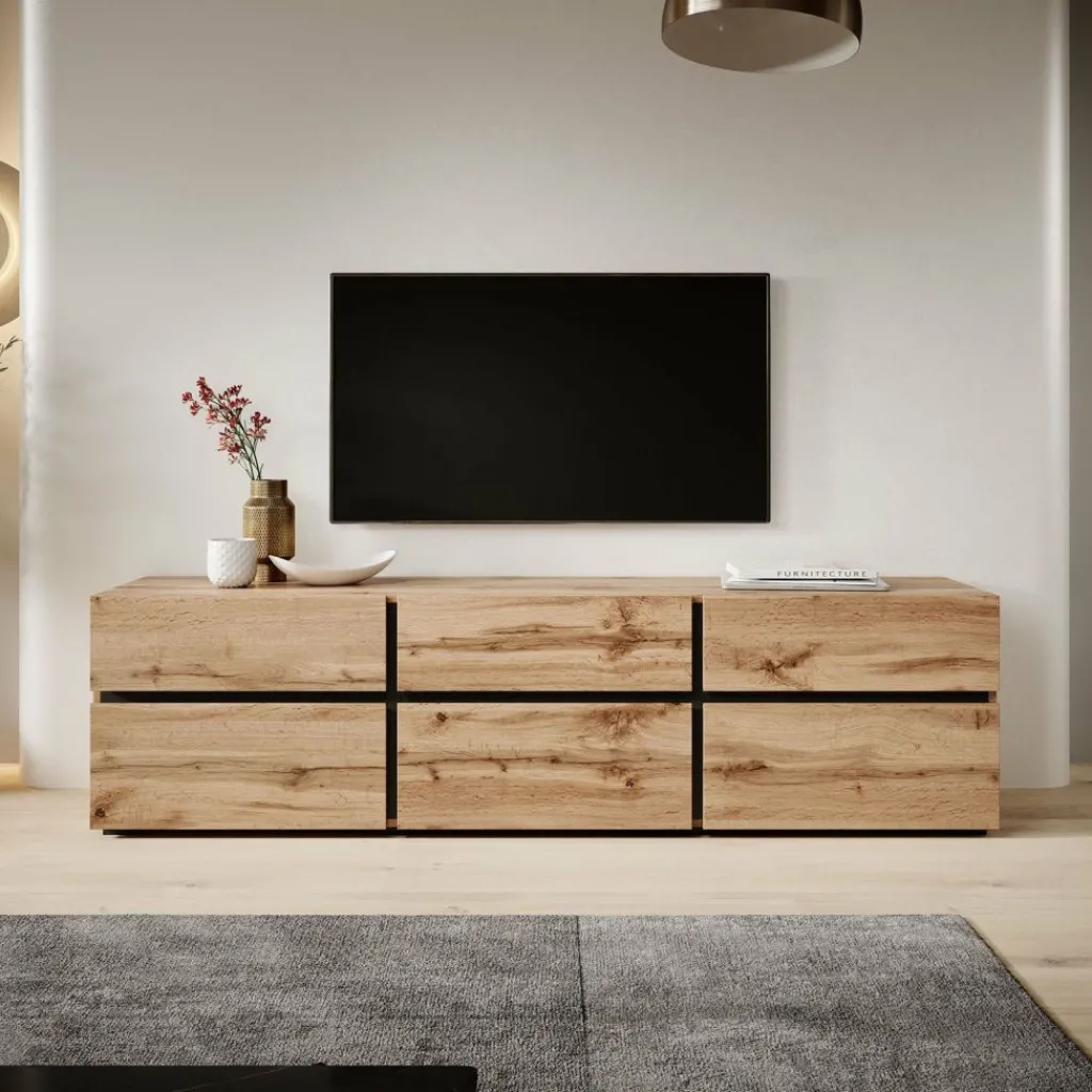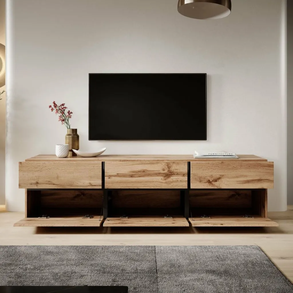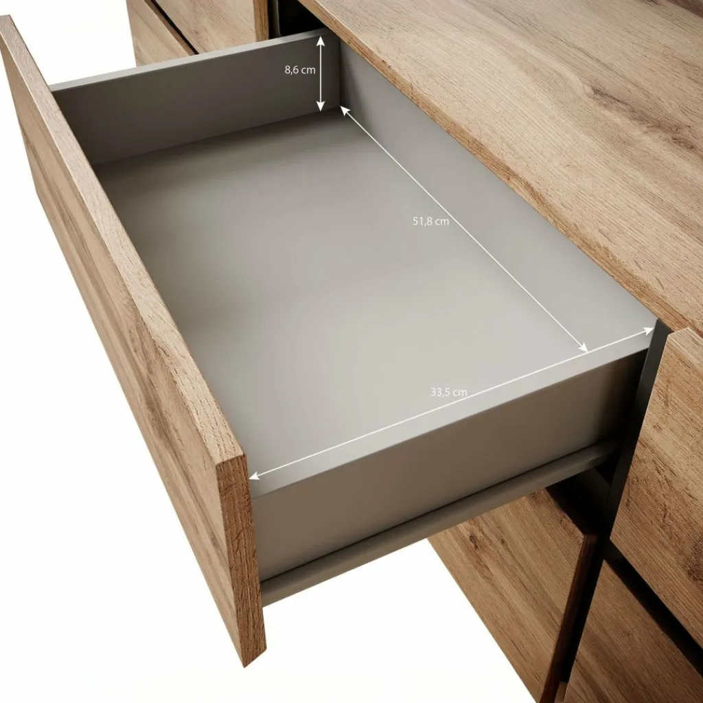 De Cainen heeft 3 kleppen. Daarachter bevinden zich 3 opbergvakken. Hierboven zitten 3 handige opberglades. De lades en kleppen zijn greeploos en via een inkeping te openen. Het tv-meubel staat op lage, zwarte pootjes.