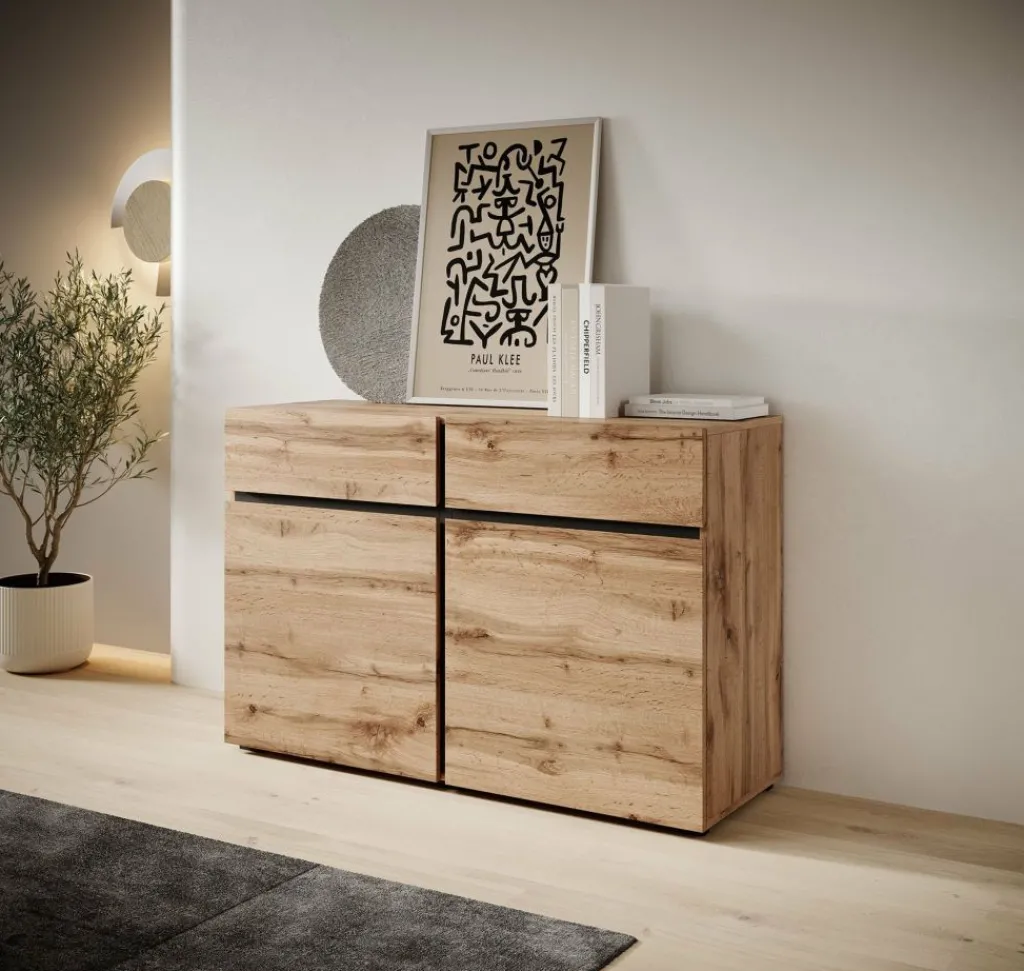 De kast heeft twee deuren met daarachter vier opbergvakken. Daarboven bevinden zich twee lades. De deuren en lades zijn greeploos en vanaf de bovenzijde via een inkeping te openen.