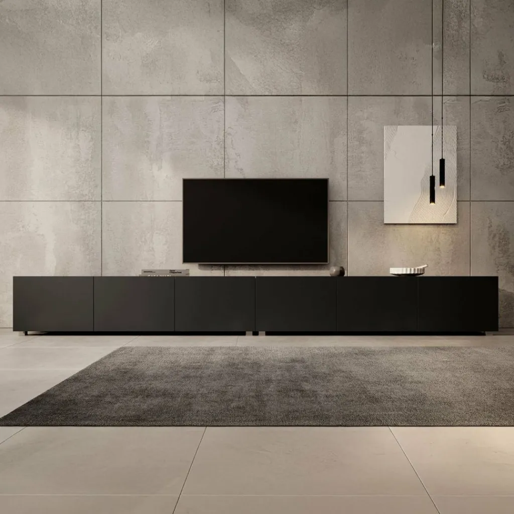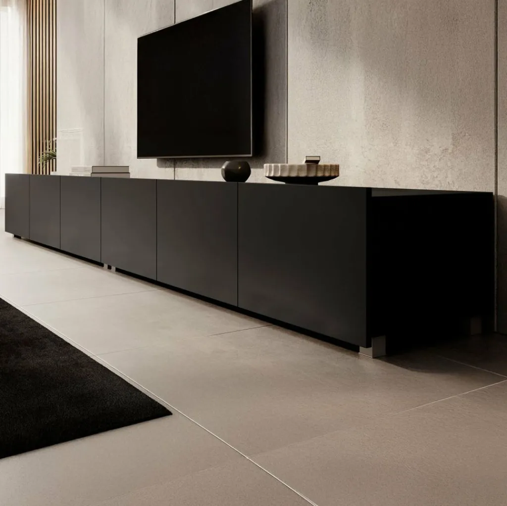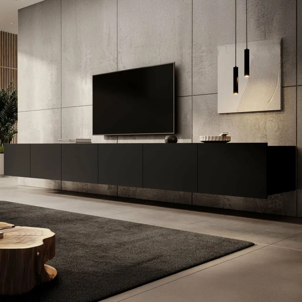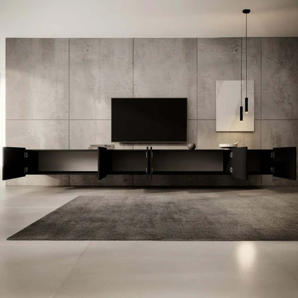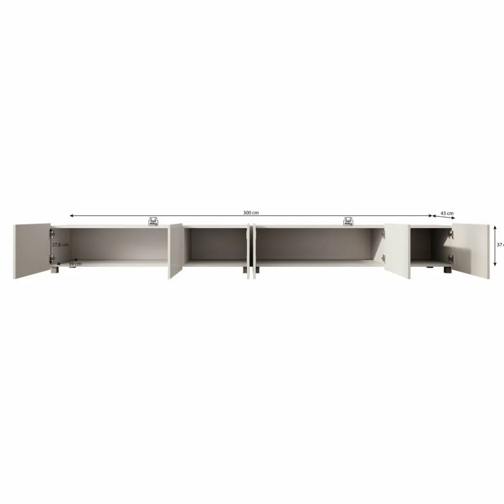Het tv-meubel Calabas is aan de muur op te hangen. Toch liever een staand model? Dat kan ook, door eenvoudig de bijgeleverde pootjes te monteren onder het meubel. De pootjes zijn zilverkleurig, gemaakt van kunststof en hebben een hoogte van 5 cm.