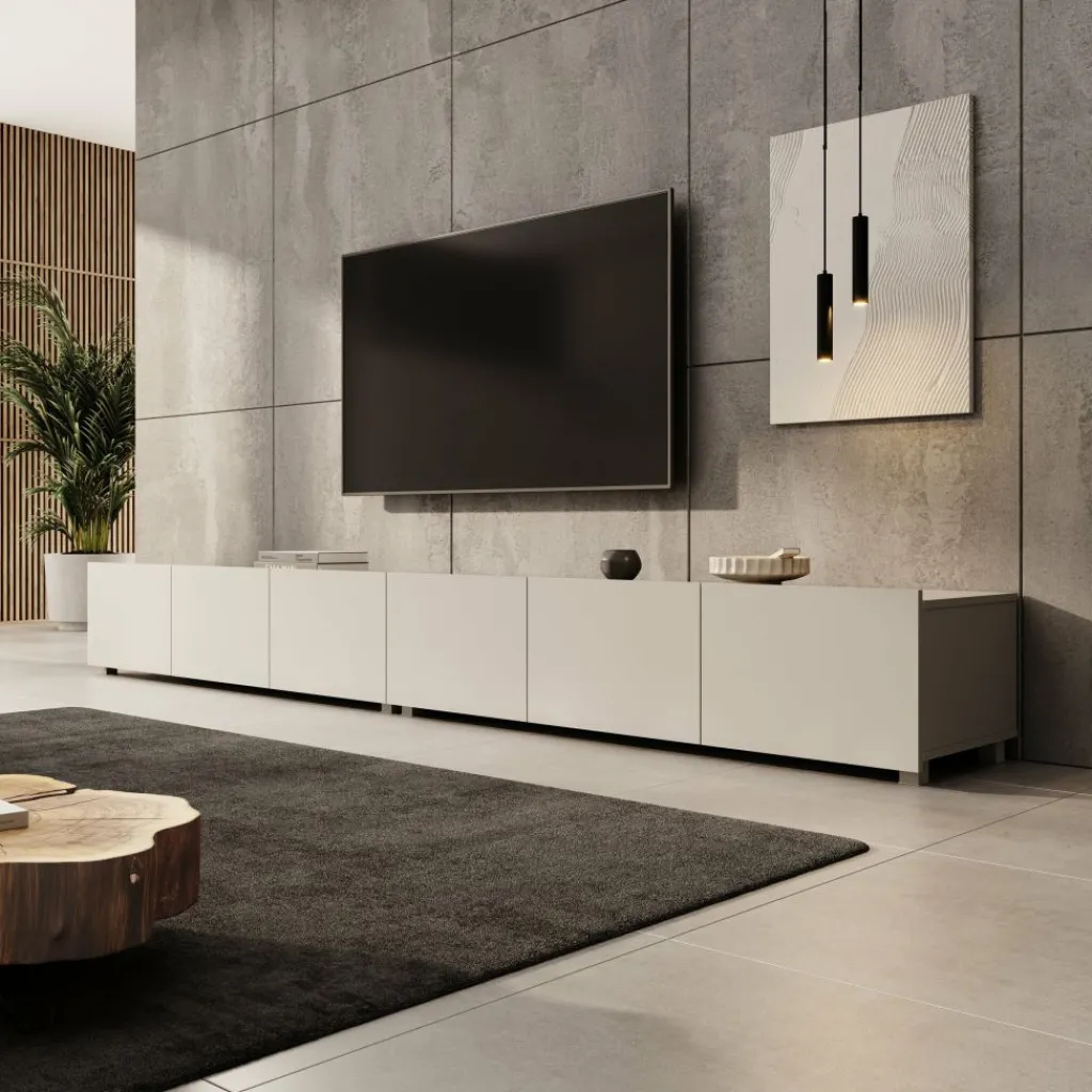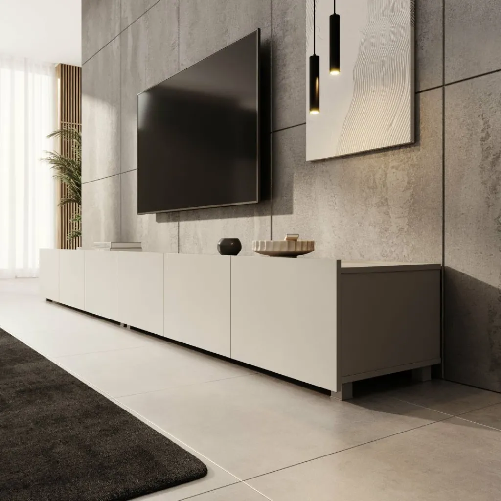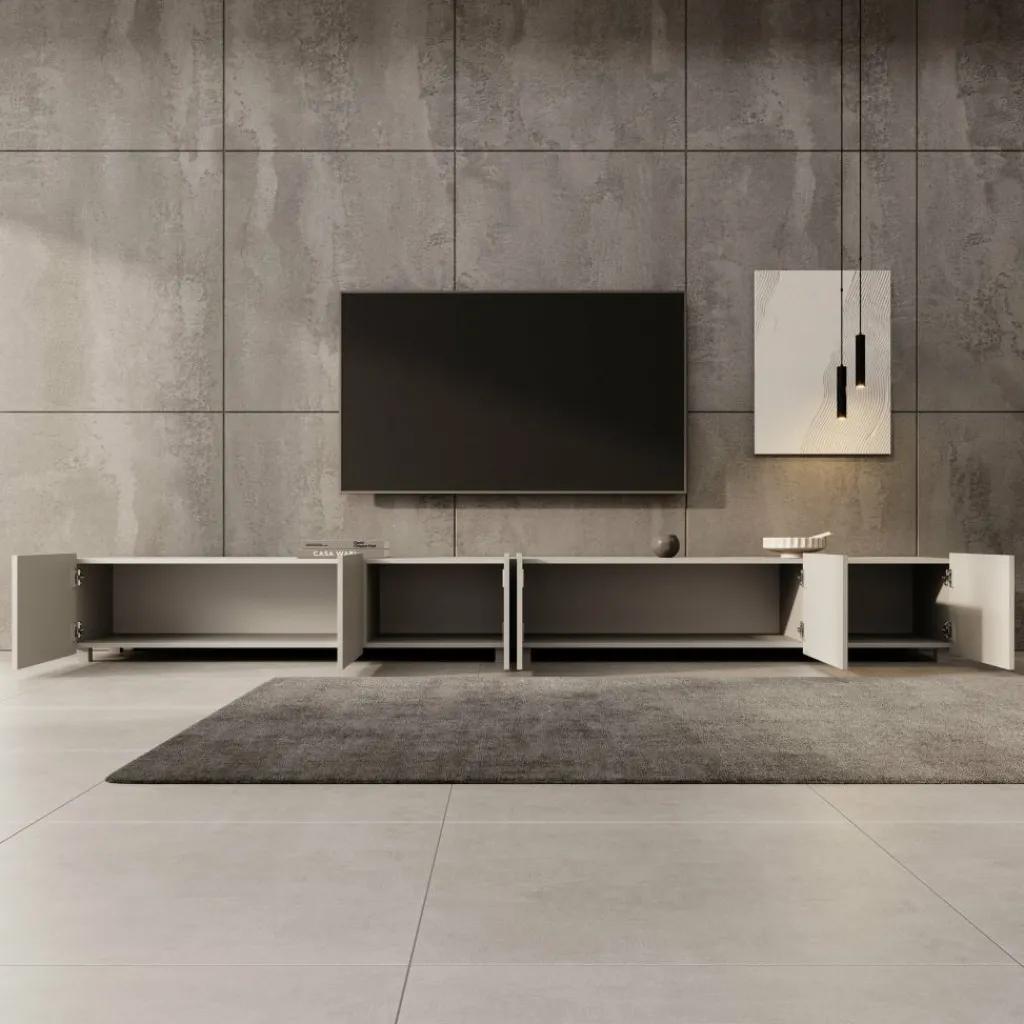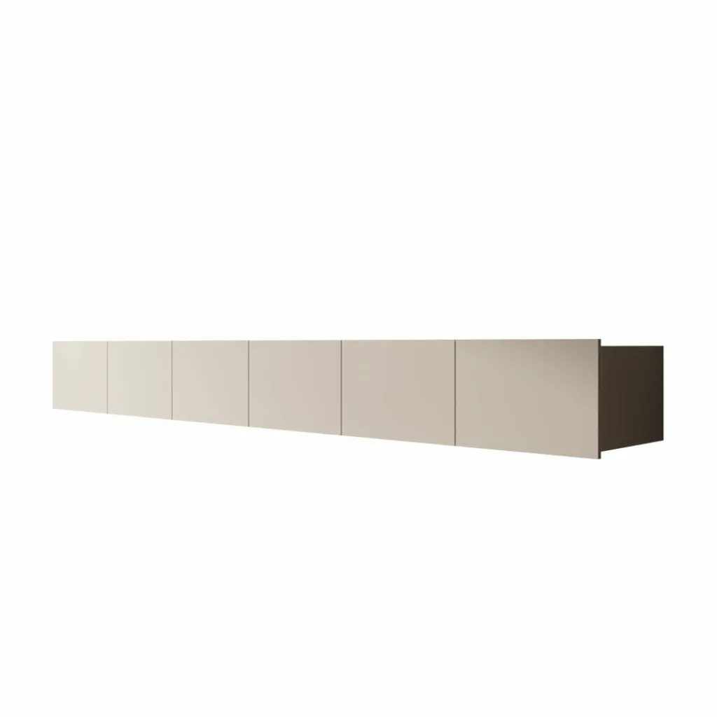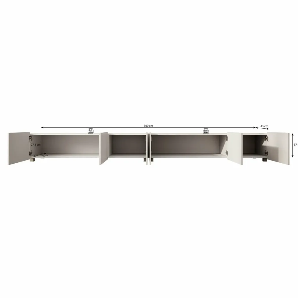TV-Meubel Calabas is een opbergkast voor onder de tv in moderne stijl. De Calabas is gemaakt van een stevige spaanplaatconstructie in een beige kleur. Het model beschikt over 6 greeploze deuren met daarachter 6 afzonderlijke opbergvakken. De deuren zijn via de boven- of onderkant te openen en houden het front strak en rustig. Dit meubel bestaat uit 2 delen van elk 150 cm breed.