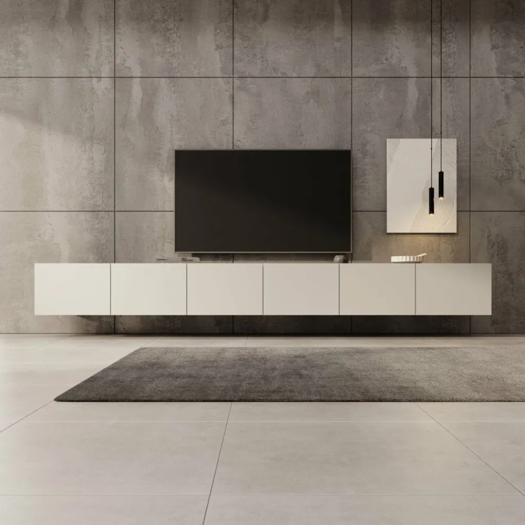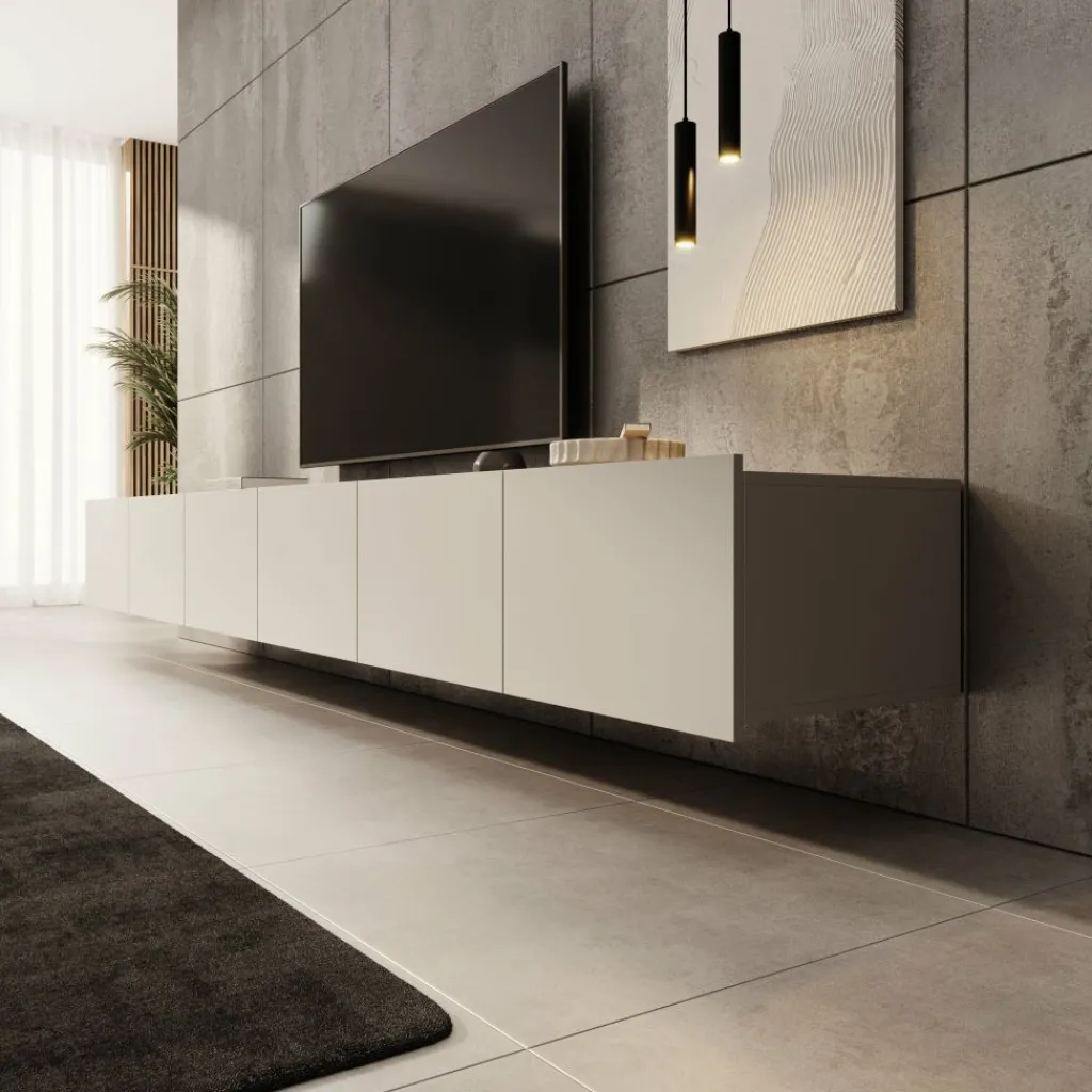 Het tv-meubel is bedoeld om aan de muur te hangen, waardoor de vloer vrij blijft en de opstelling ruimtelijk oogt. Wie het meubel liever staand gebruikt, kan de bijgeleverde pootjes eenvoudig monteren. Deze pootjes zijn zilverkleurig, gemaakt van kunststof en hebben een hoogte van 5 cm. Dankzij de zes opbergvakken is er volop ruimte om apparatuur en accessoires netjes uit het zicht op te bergen.