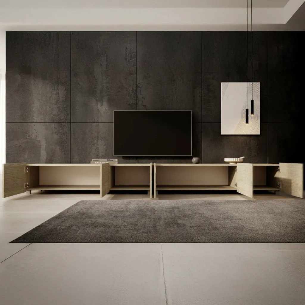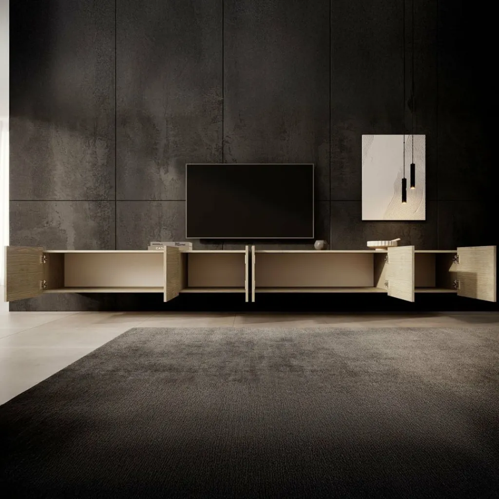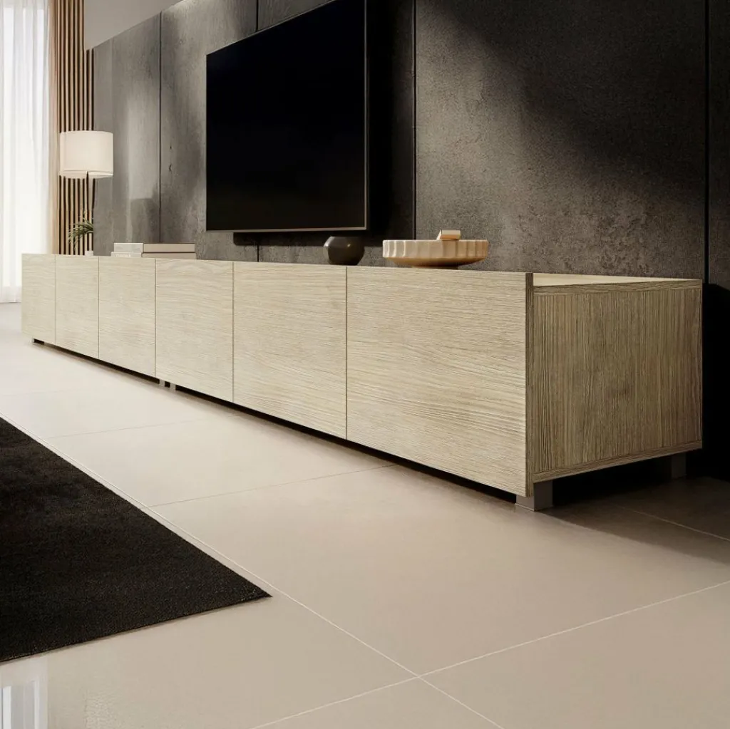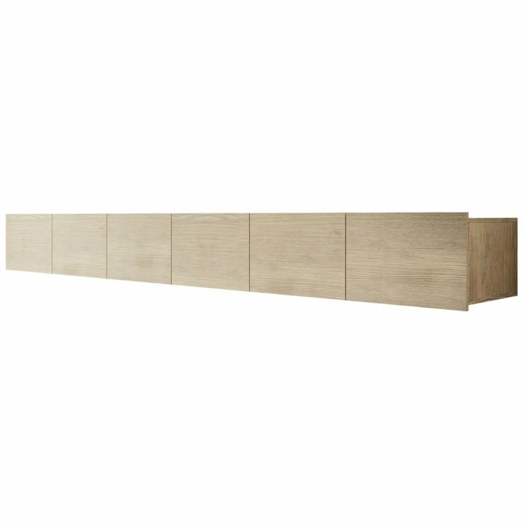 TV-Meubel Calabas is een opbergkast voor onder de tv in moderne stijl. De Calabas is gemaakt van een stevige spaanplaat constructie in een eiken kleur. Het model beschikt over 6 deuren met daarachter 6 opbergvakken. De deuren zijn greeploos en via de boven- of onderkant te openen. Dit meubel bestaat uit 2 delen van 150 cm breed.