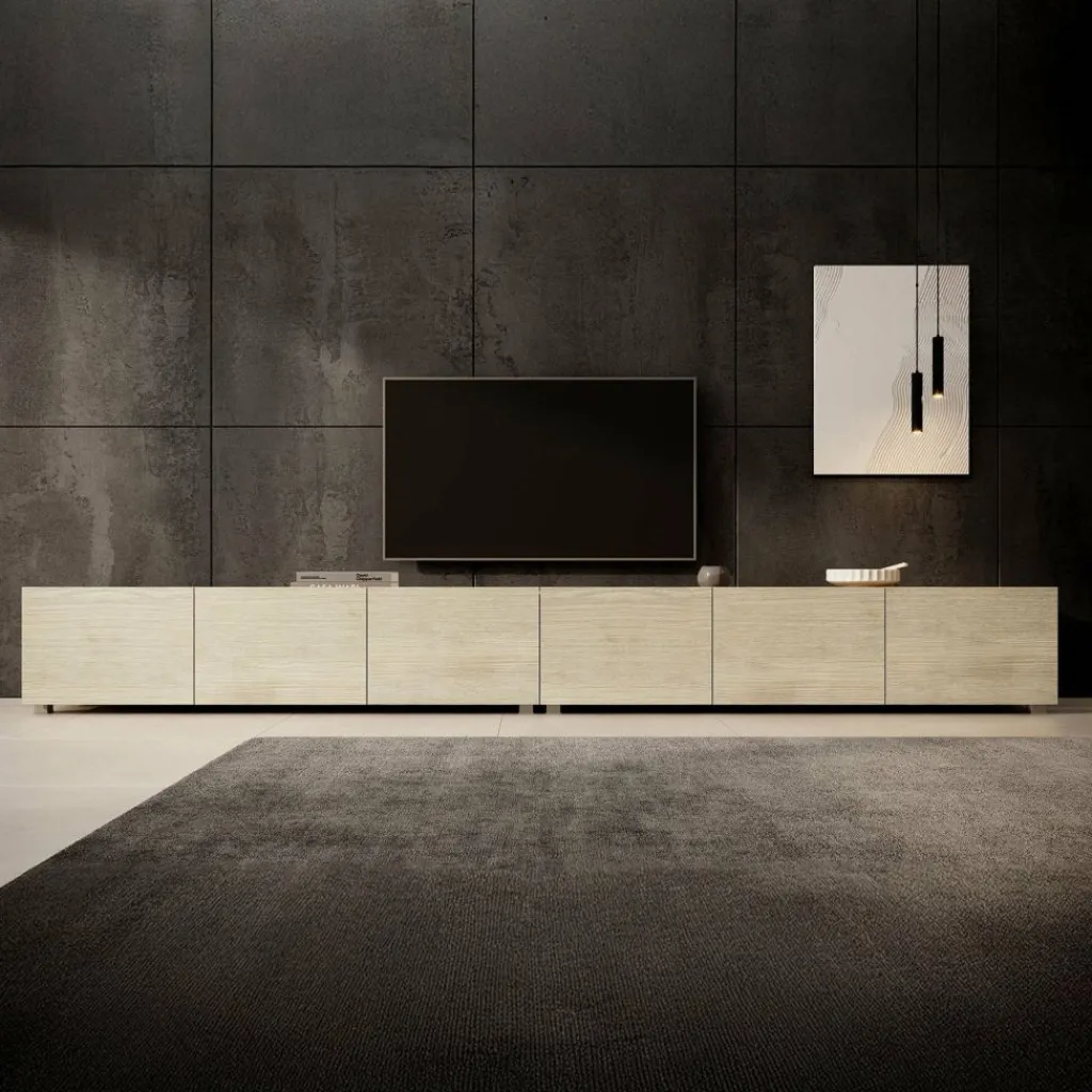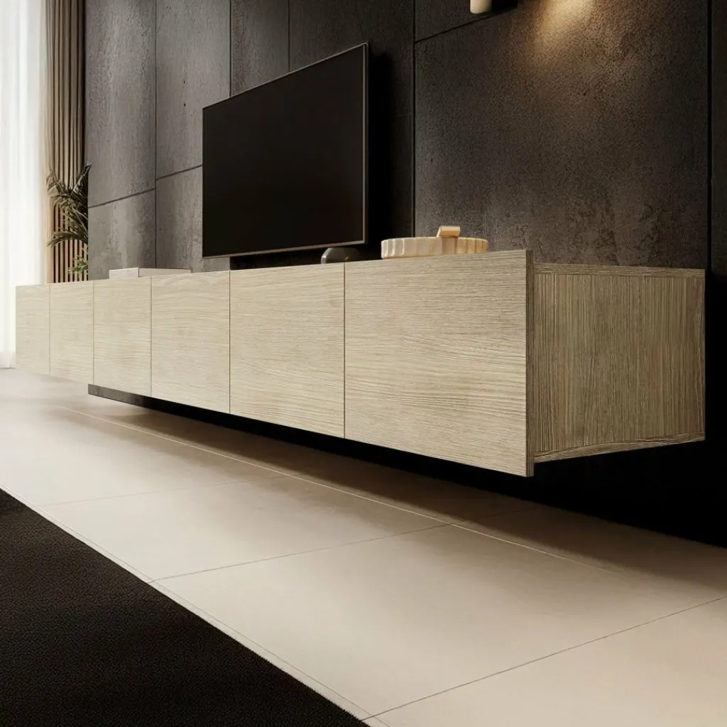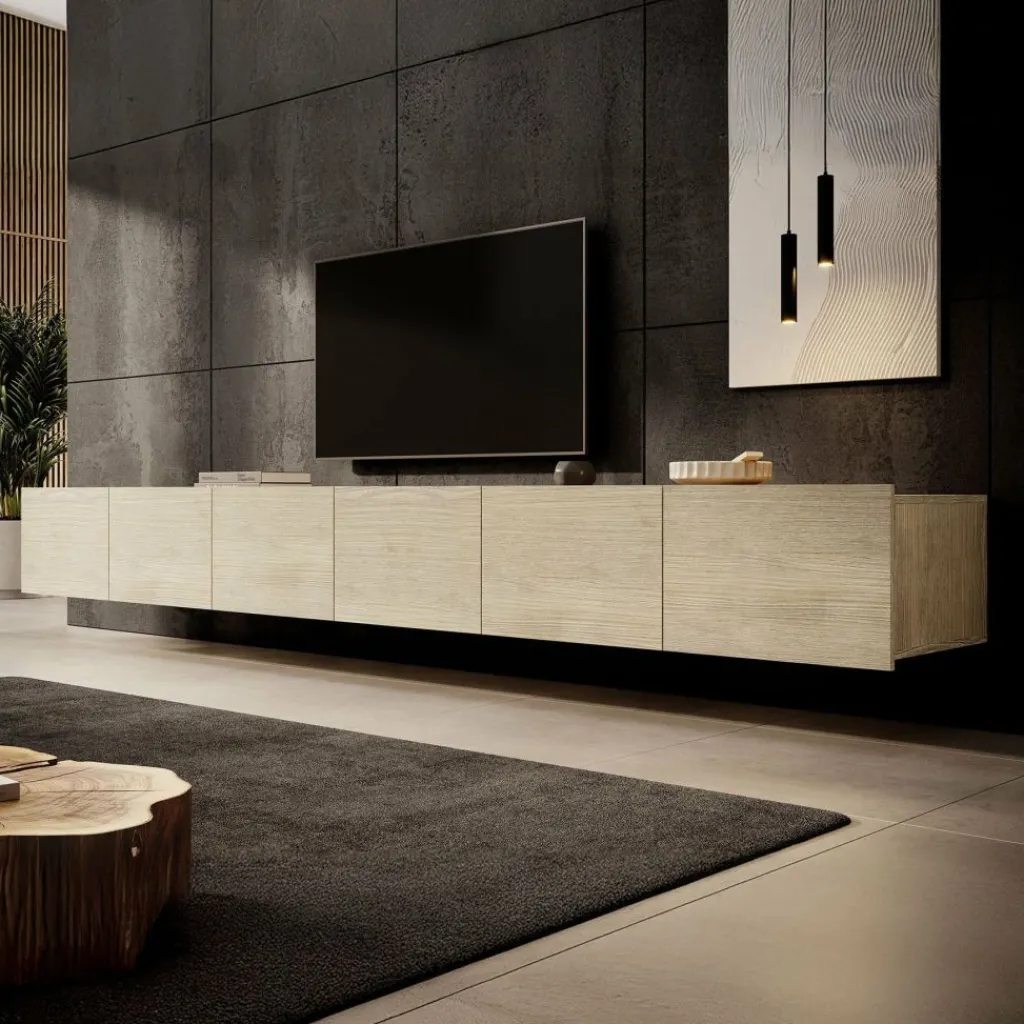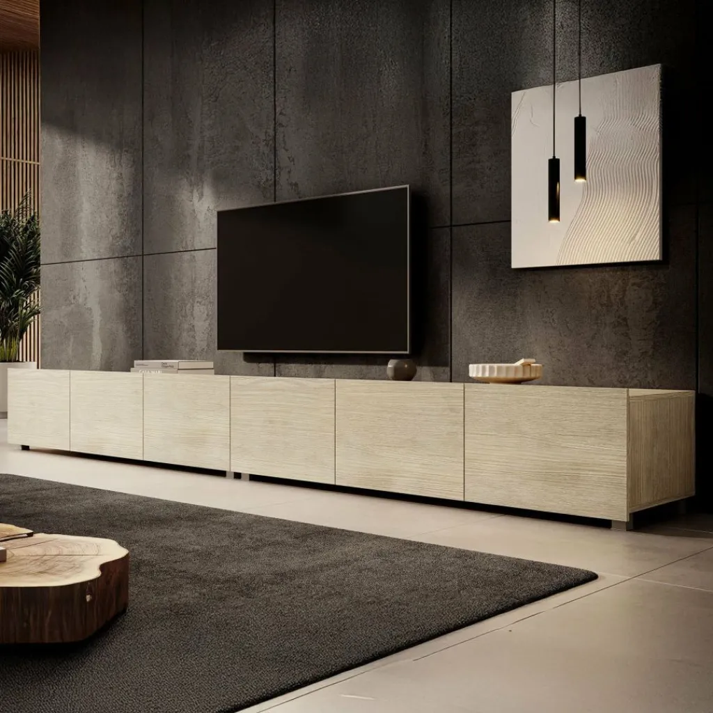 TV-Meubel Calabas is een opbergkast voor onder de tv in moderne stijl. De Calabas is gemaakt van een stevige spaanplaat constructie in een eiken kleur. Het model beschikt over 6 deuren met daarachter 6 opbergvakken. De deuren zijn greeploos en via de boven- of onderkant te openen. Dit meubel bestaat uit 2 delen van 150 cm breed.