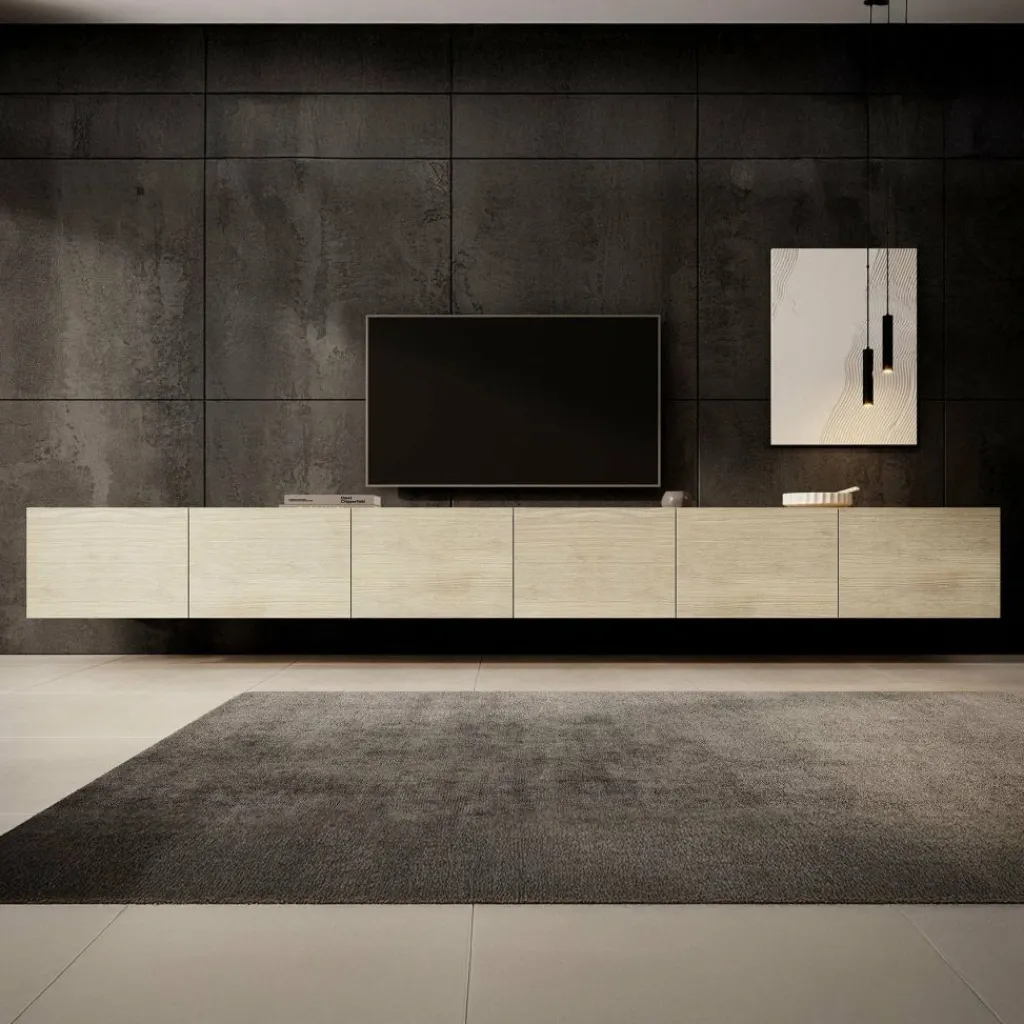 Het tv-meubel Calabas is aan de muur op te hangen. Toch liever een staand model? Dat kan ook, door eenvoudig de bijgeleverde pootjes te monteren onder het meubel. De pootjes zijn zilverkleurig, gemaakt van kunststof en hebben een hoogte van 5 cm.