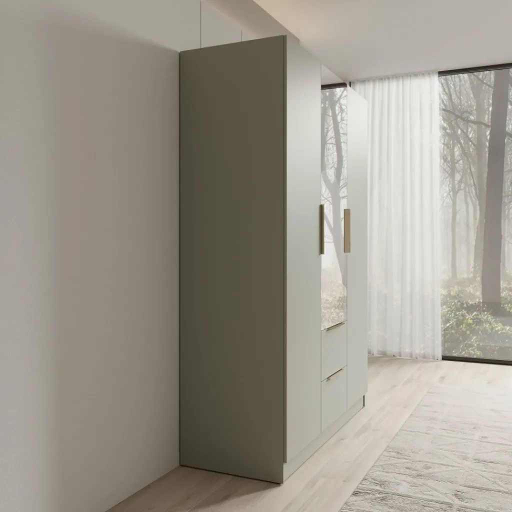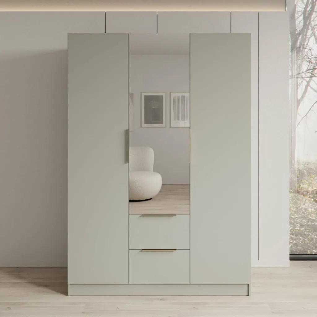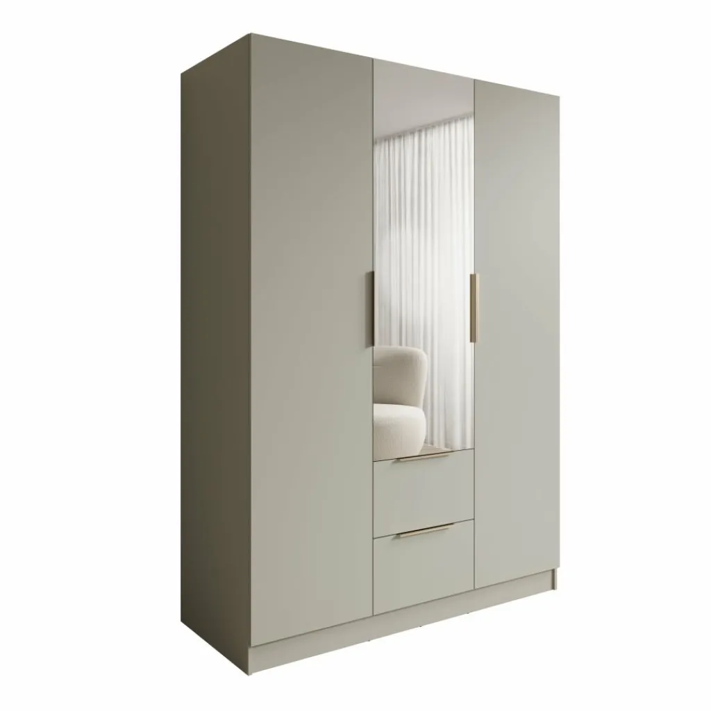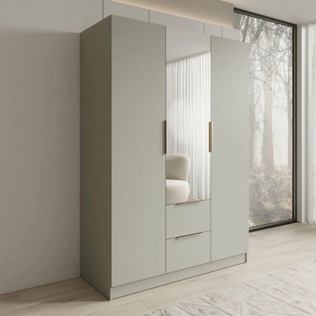 De deuren en lades zijn uitgerust met rechte metalen handgrepen die passen bij het strakke uiterlijk van de kast. De geïntegreerde spiegel op de middelste deur maakt de kast functioneler en zorgt ervoor dat je je outfit direct kunt controleren zonder extra meubel. Dankzij de neutrale beige kleur en de spiegel past deze kast goed in verschillende slaapkamers en interieurstijlen.