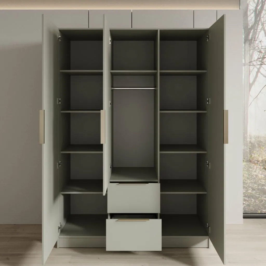 Achter de linker- en rechterdeur bevinden zich meerdere vaste legplanken, ideaal voor opgevouwen kleding, schoenen of opbergdozen. Het middelste gedeelte achter de spiegeldeur is voorzien van een hangroede voor het ophangen van jassen, jurken en overhemden. Onder dit hanggedeelte zijn twee lades geplaatst voor kleinere items zoals ondergoed, sokken of accessoires.