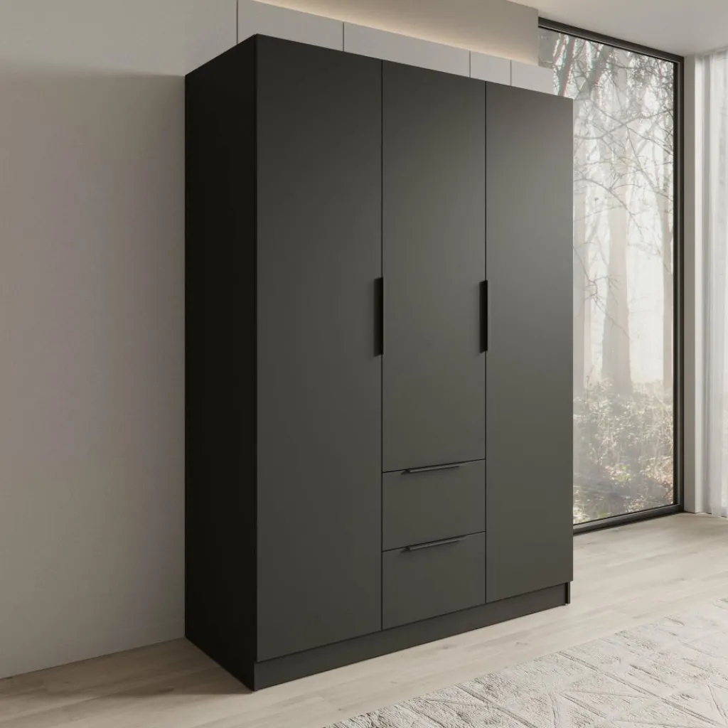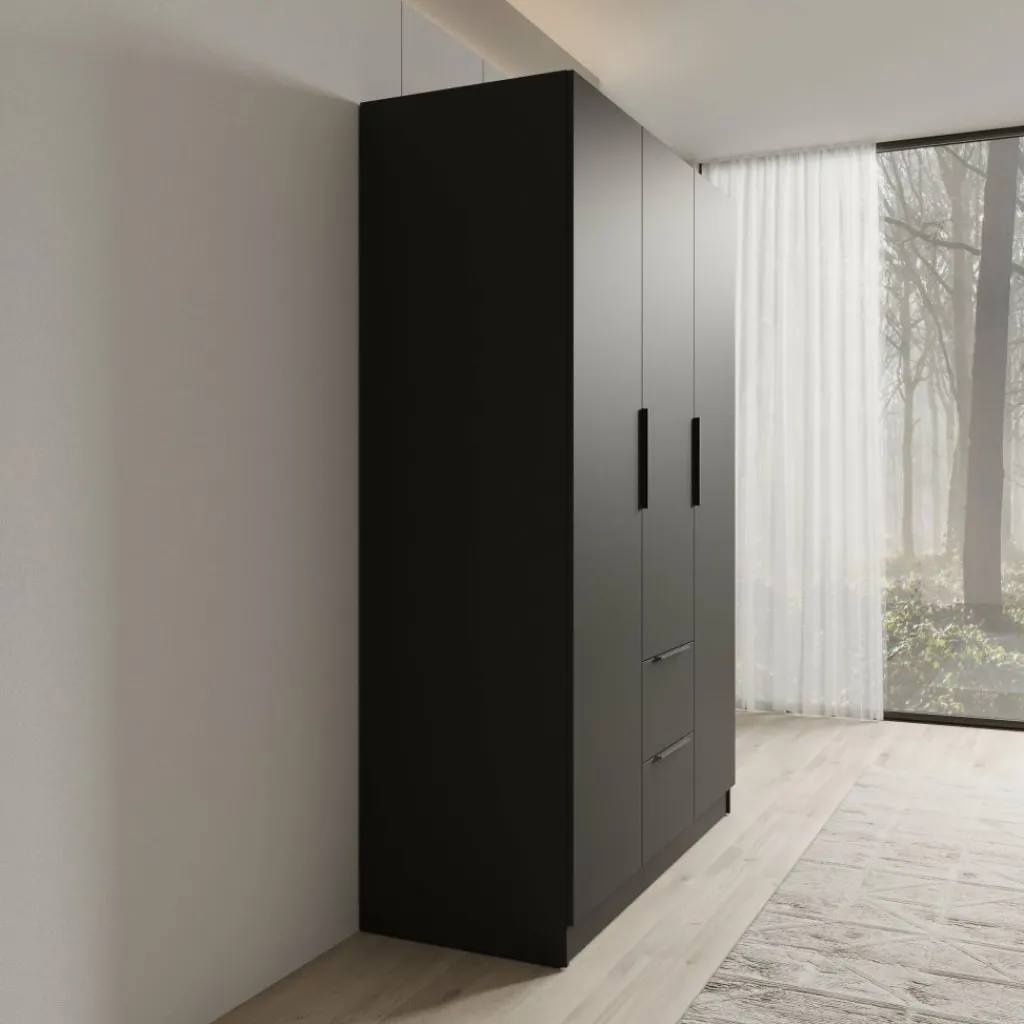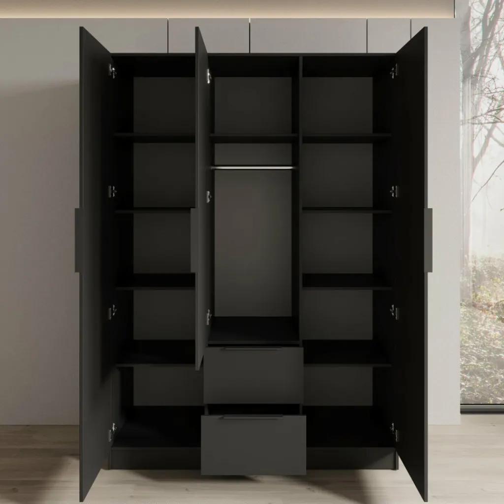 De kledingkast is voorzien van drie deuren, zonder spiegel. Wanneer de deuren geopend zijn, is een overzichtelijke indeling zichtbaar. Aan de linker- en rechterzijde bevinden zich meerdere legplanken voor het opbergen van kleding en accessoires. In het midden is een hanggedeelte met een kledingroede aanwezig. Onder dit hanggedeelte zijn twee lades zichtbaar, geschikt voor kleinere items. De binnenzijde is volledig donker uitgevoerd, passend bij de buitenzijde van de kast.