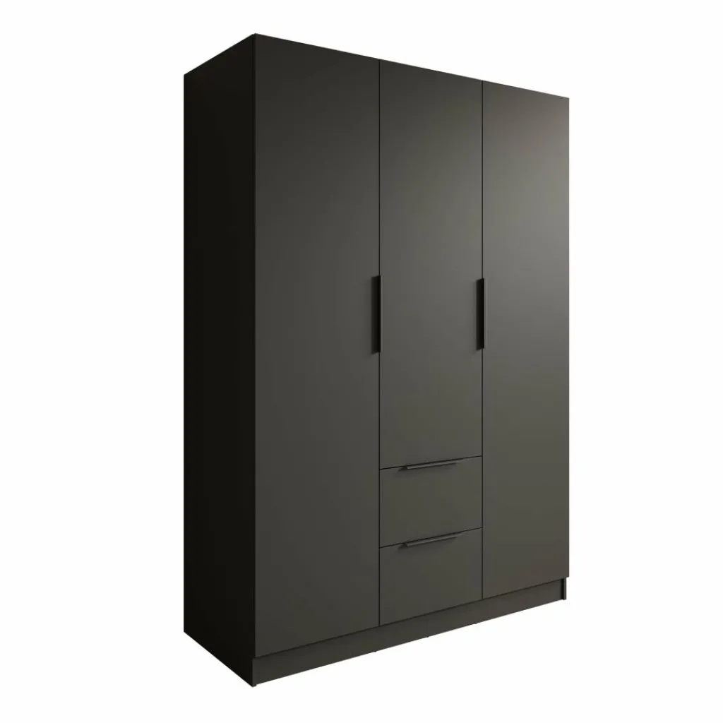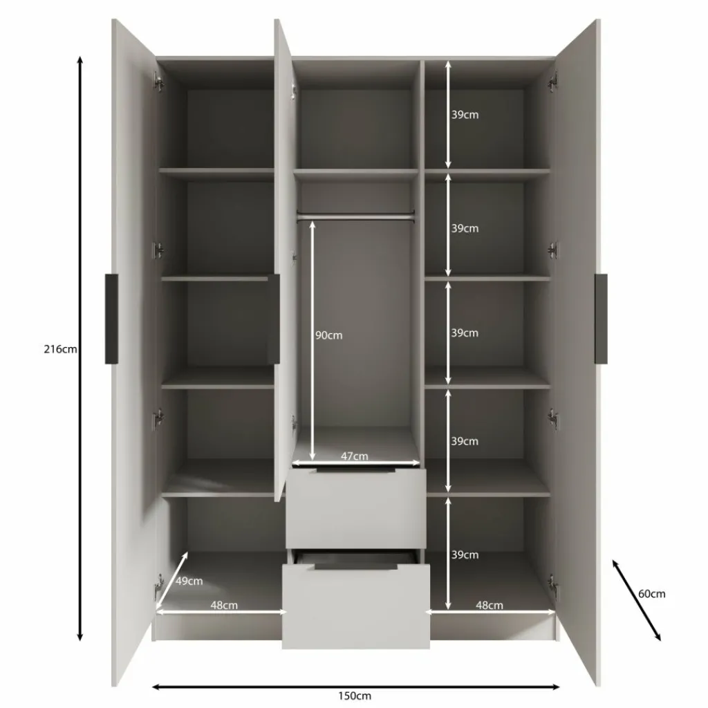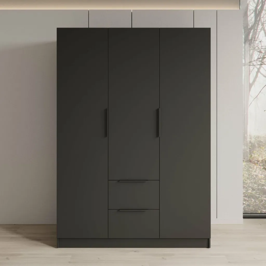 De kledingkast is voorzien van drie deuren, zonder spiegel. Wanneer de deuren geopend zijn, is een overzichtelijke indeling zichtbaar. Aan de linker- en rechterzijde bevinden zich meerdere legplanken voor het opbergen van kleding en accessoires. In het midden is een hanggedeelte met een kledingroede aanwezig. Onder dit hanggedeelte zijn twee lades zichtbaar, geschikt voor kleinere items. De binnenzijde is volledig donker uitgevoerd, passend bij de buitenzijde van de kast.