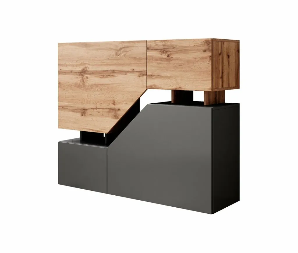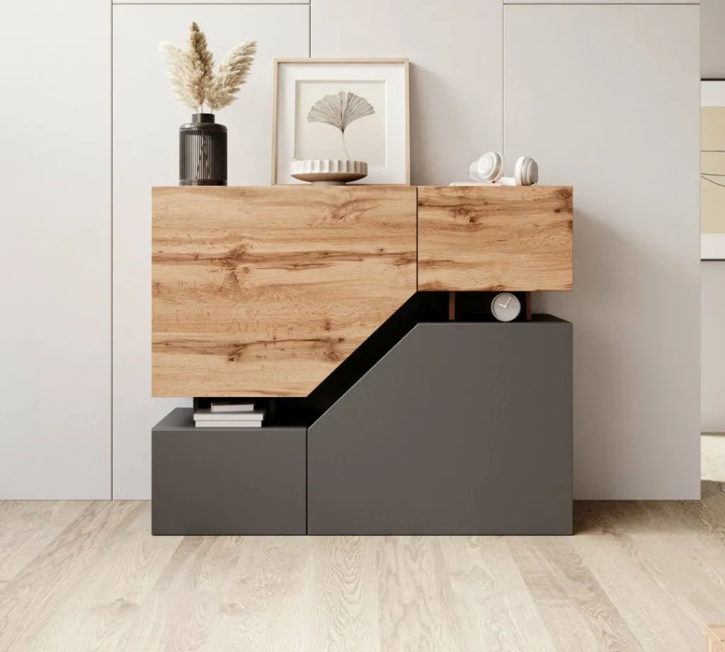 Dressoir Canberra is een opbergkast van 120 cm breed. De Canberra beschikt over 4 deuren en enkele open vakken in het midden. De kast is uitgevoerd in de kleuren antraciet met eiken.