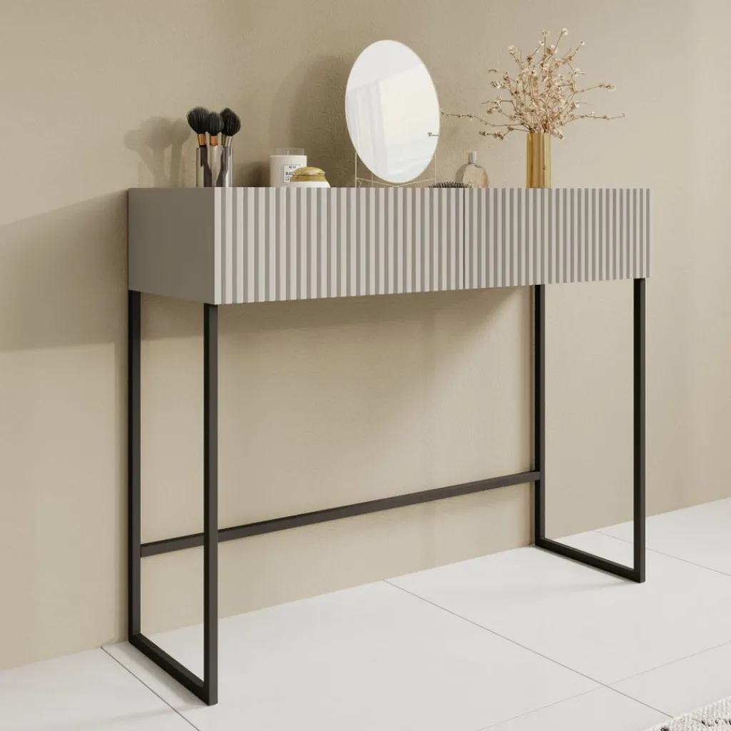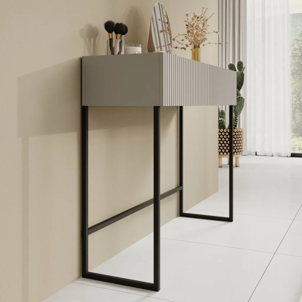 Het slanke zwarte metalen onderstel geeft de tafel een luchtige uitstraling en biedt stabiliteit. De Capri kaptafel is perfect om te gebruiken als make-uptafel of als stijlvolle console in de hal of slaapkamer.