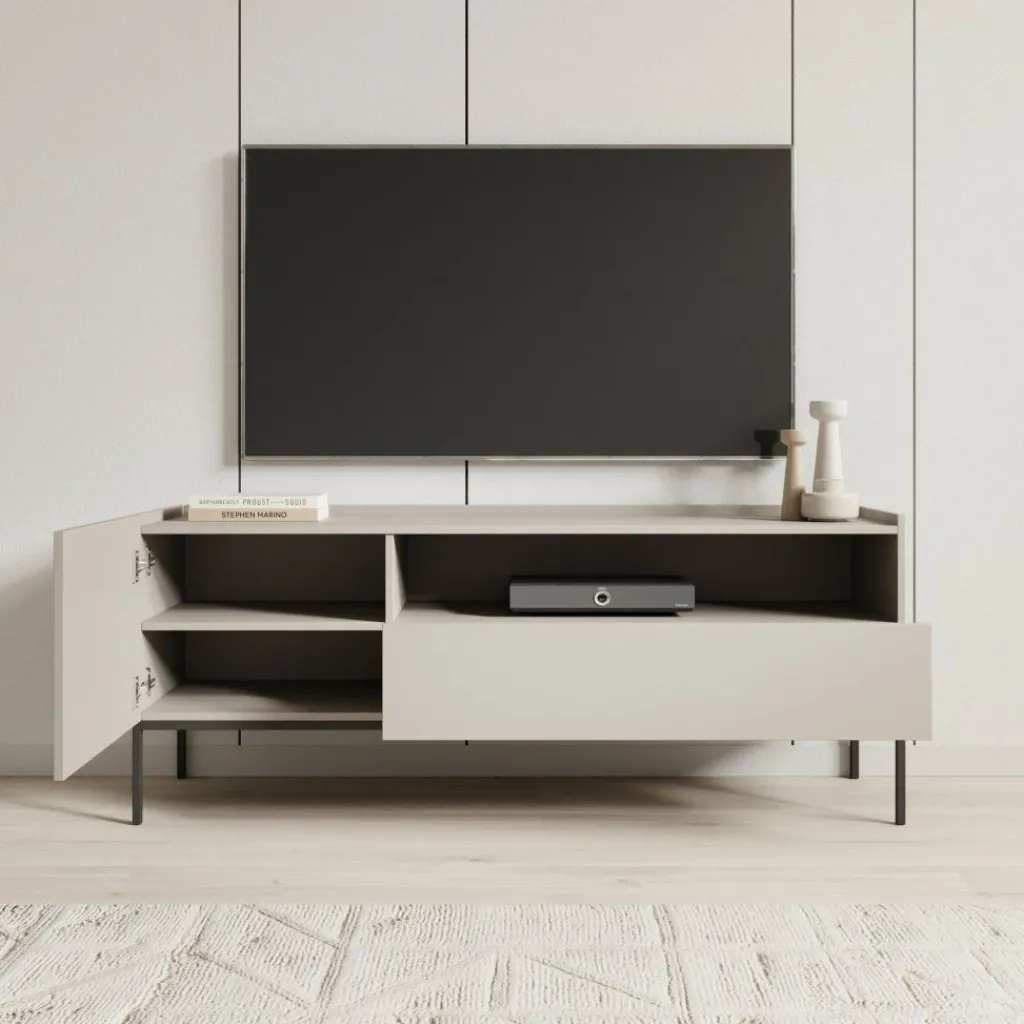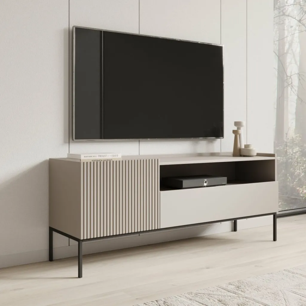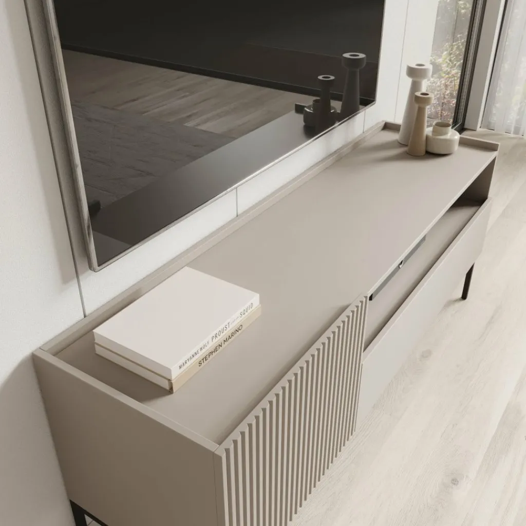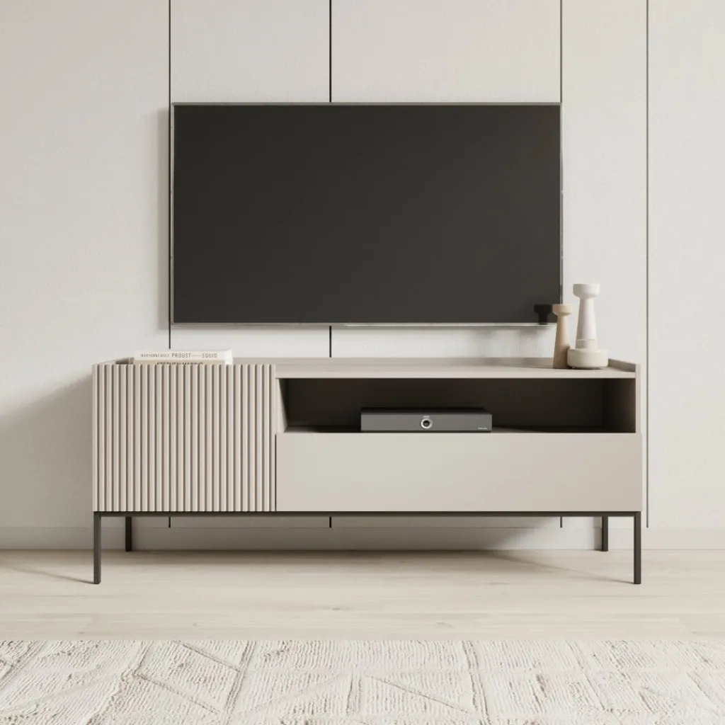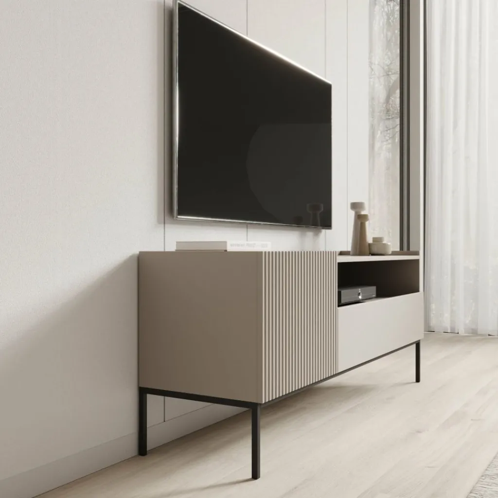 Het Capri TV-meubel in beige combineert een strak ontwerp met subtiele details. De zachte beige kleur en het geribbelde front zorgen voor een moderne en stijlvolle uitstraling.