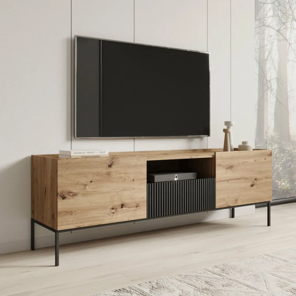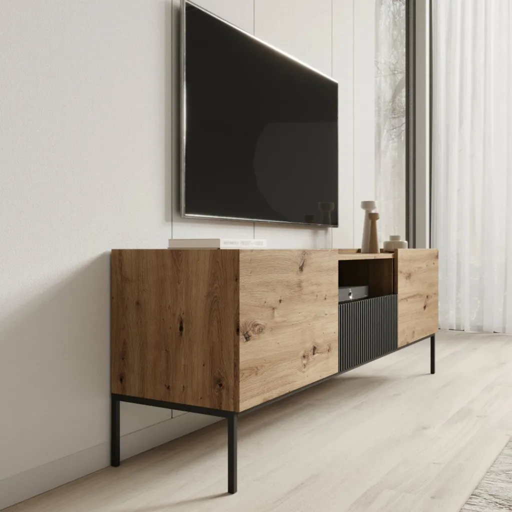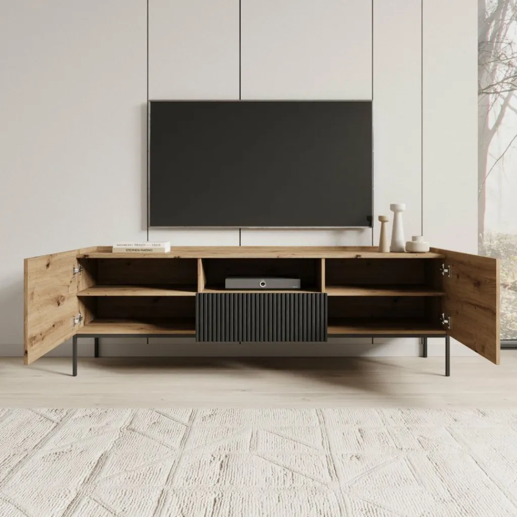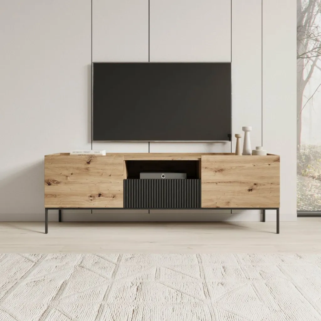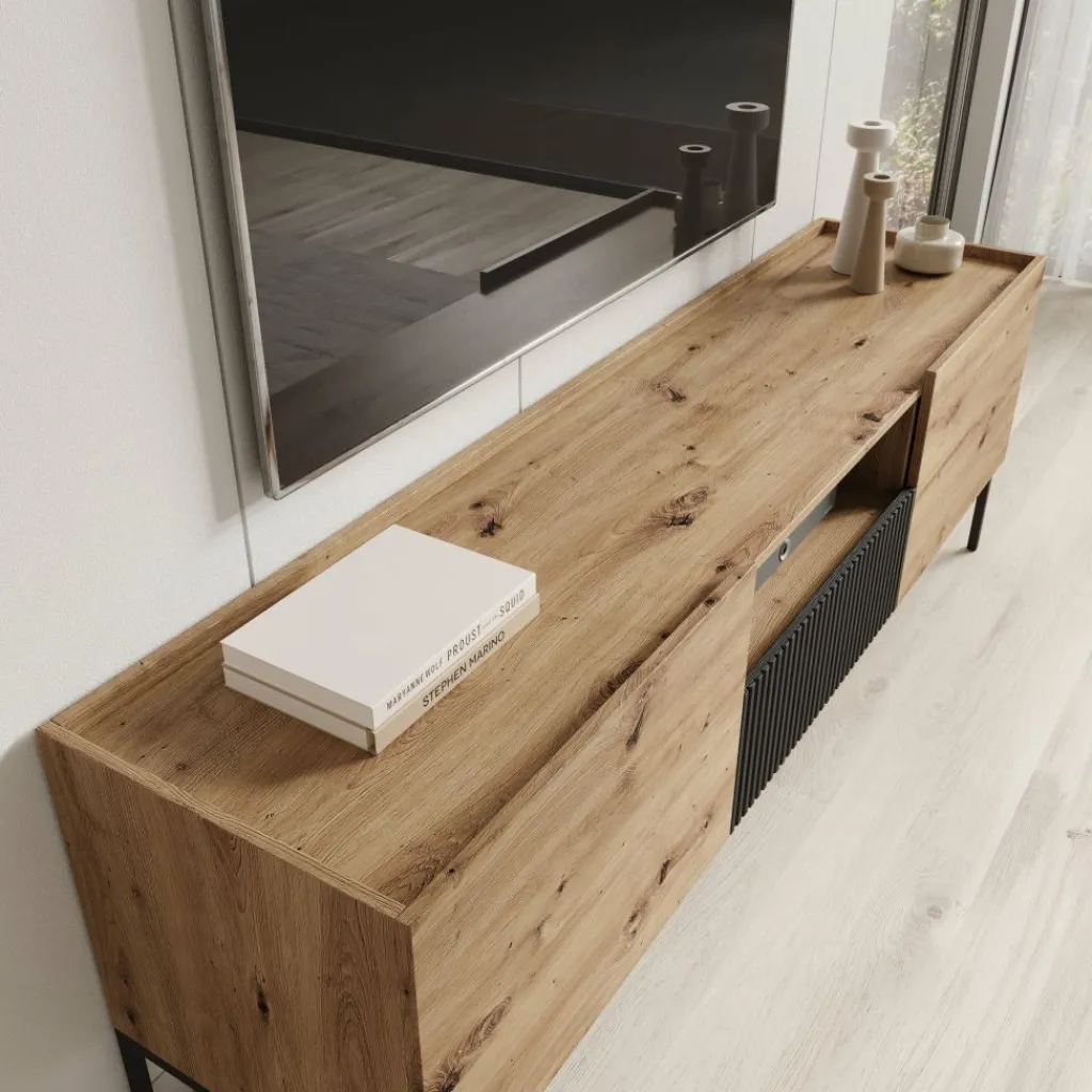 Het Capri TV-meubel in eiken met zwart front is een stijlvolle blikvanger in de woonkamer. De warme houtkleur zorgt voor een natuurlijke uitstraling, terwijl het zwarte geribbelde detail een moderne en verfijnde touch toevoegt.