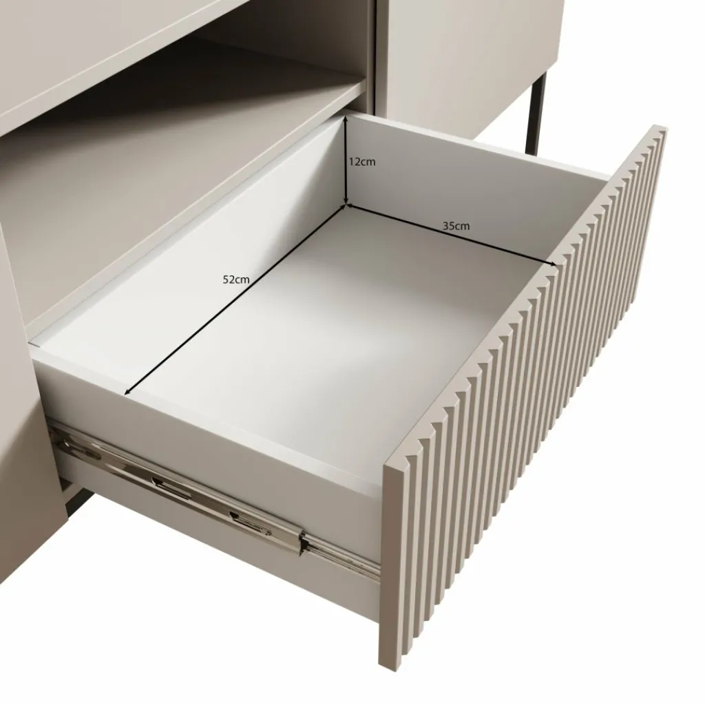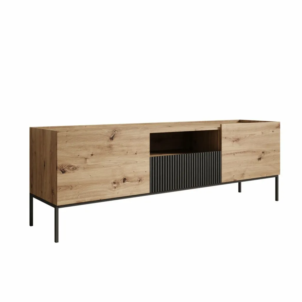 Het meubel biedt voldoende opbergruimte dankzij de twee deuren, een lade en een open vak – perfect voor het opbergen van media-apparatuur en accessoires. Het slanke metalen onderstel geeft het geheel een luchtig en elegant karakter.