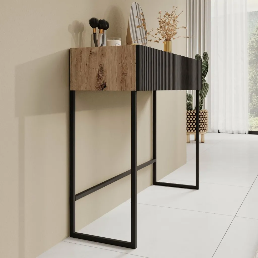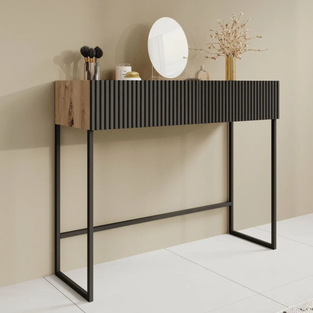 Dankzij het slanke zwarte metalen onderstel oogt de kaptafel luchtig en minimalistisch, terwijl het stevig en stabiel blijft. Het tafelblad biedt voldoende ruimte voor make-up, accessoires of decoratie.