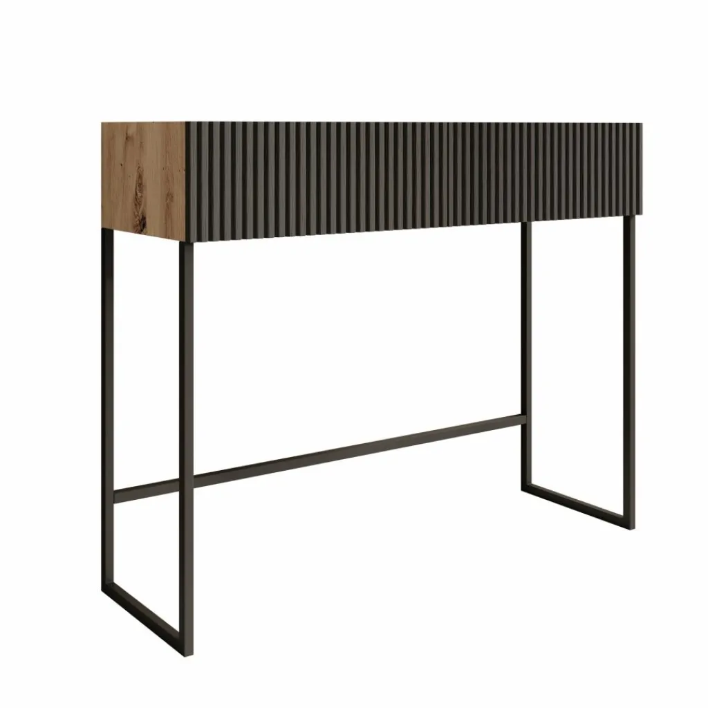 De Capri kaptafel in eiken met zwart front is een stijlvolle toevoeging aan elke slaapkamer of hal. De combinatie van warm eikenhout met een strak, geribbeld zwart front zorgt voor een moderne en elegante uitstraling.