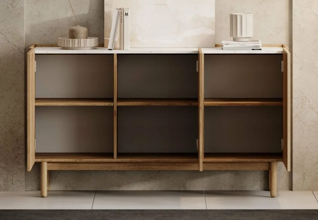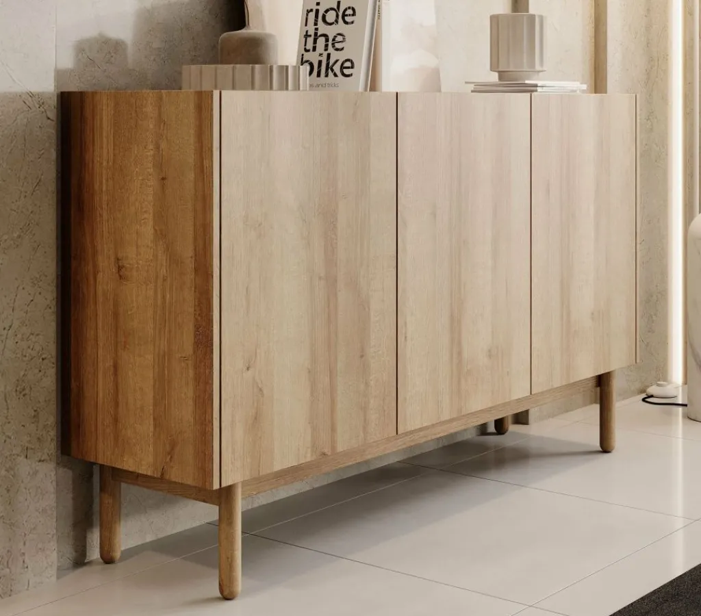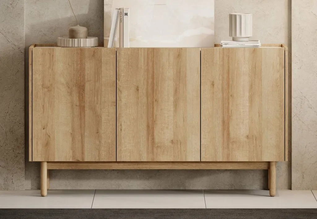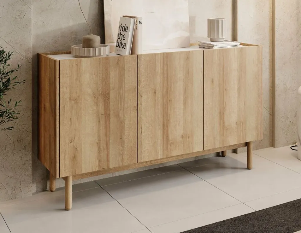 Dressoir Cayenne is een opbergkast in Scandinavische stijl. Het dressoir is gemaakt van een stevige spaanplaat constructie met duurzaam FSC keurmerk. De kast heeft drie deuren met daarachter 6 opbergvakken. De deuren zijn greeploos.