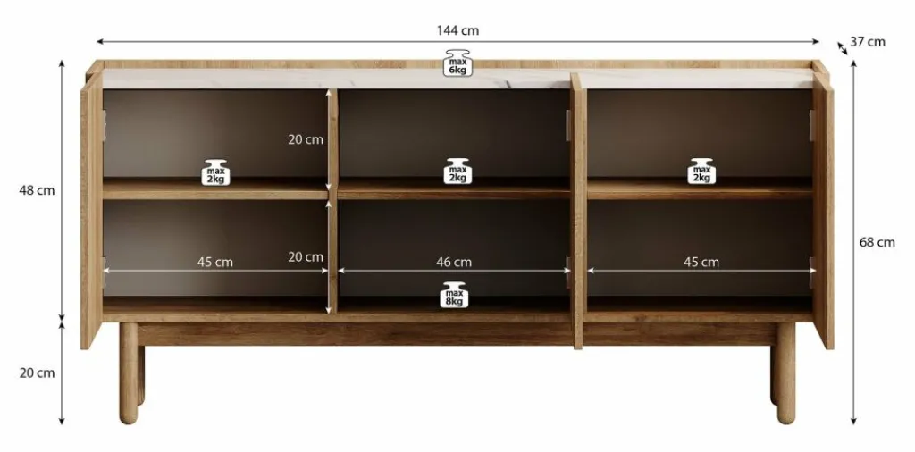 De kast heeft drie deuren met daarachter 6 opbergvakken. De deuren zijn greeploos.
