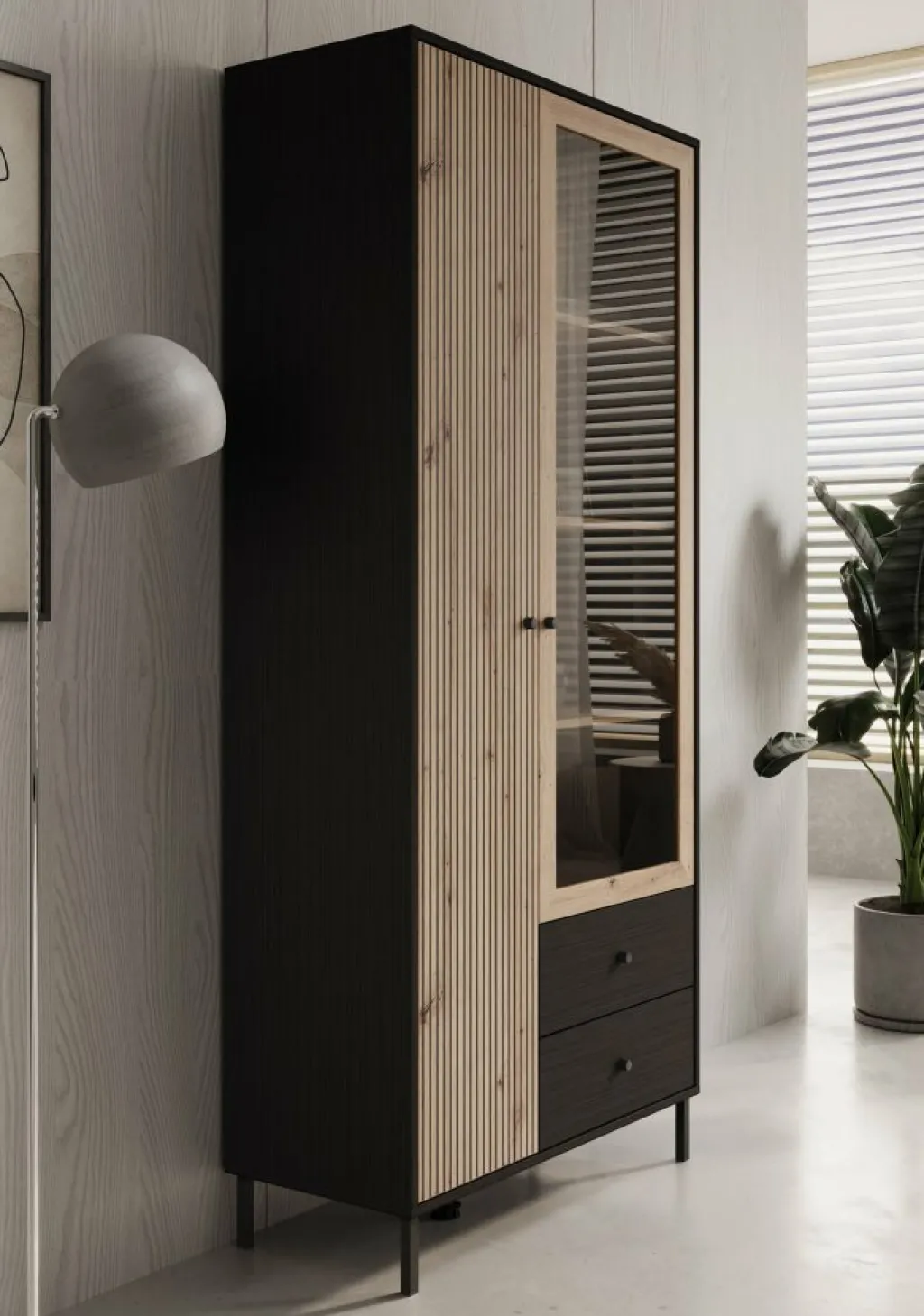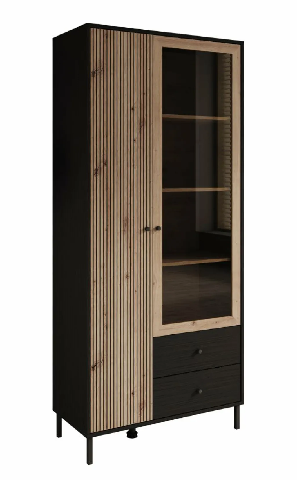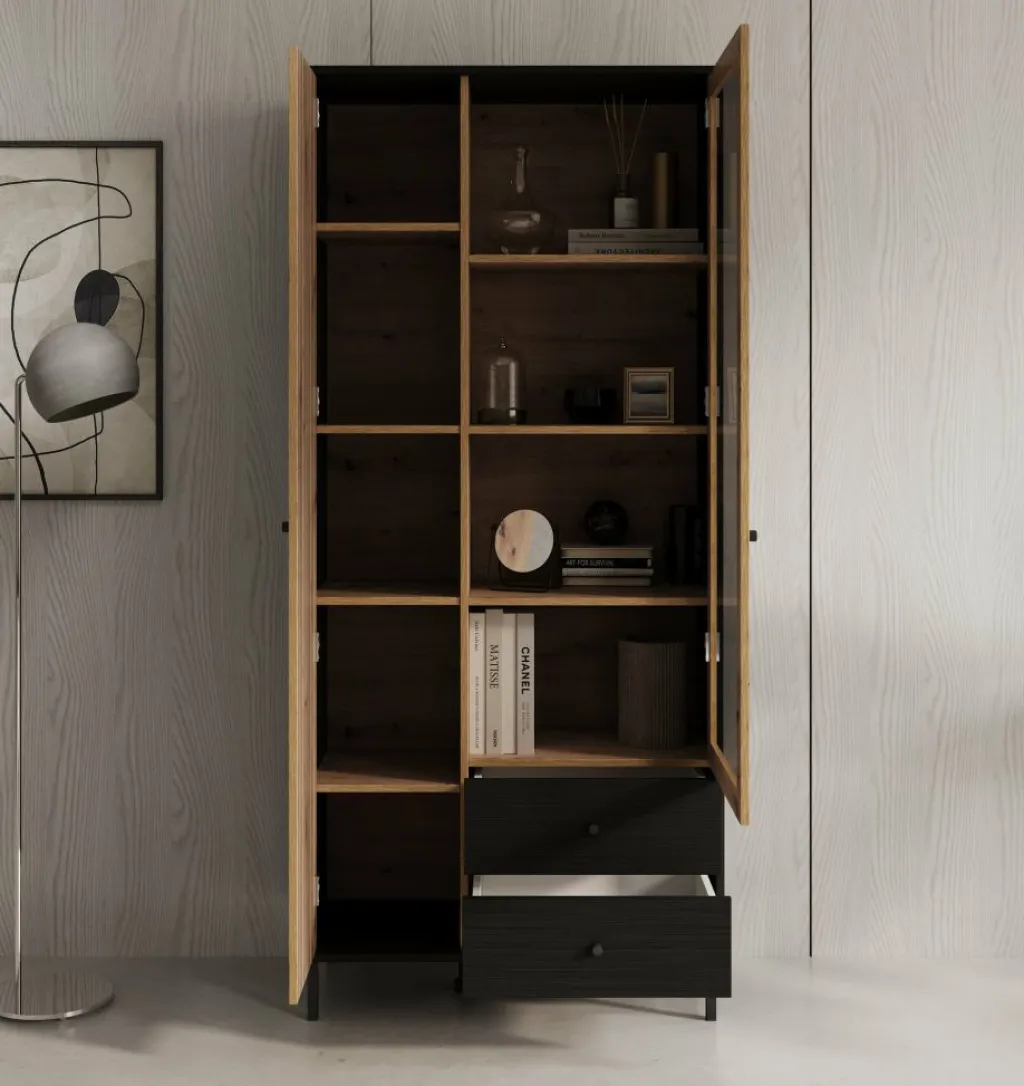 Vitrinekast Charles is een industriële kast die uitgevoerd is in de kleuren eiken met zwart eiken. De opbergkast beschikt over 2 deuren waarvan de rechter uit glas bestaat. Deze deuren zijn te openen met zwarte knoppen en hierachter zitten maar liefst 9 opbergvakken. Om het meubel compleet te maken heeft het ook nog 2 lades. De Charles staat op metalen pootjes en 1 ondersteunende poot.