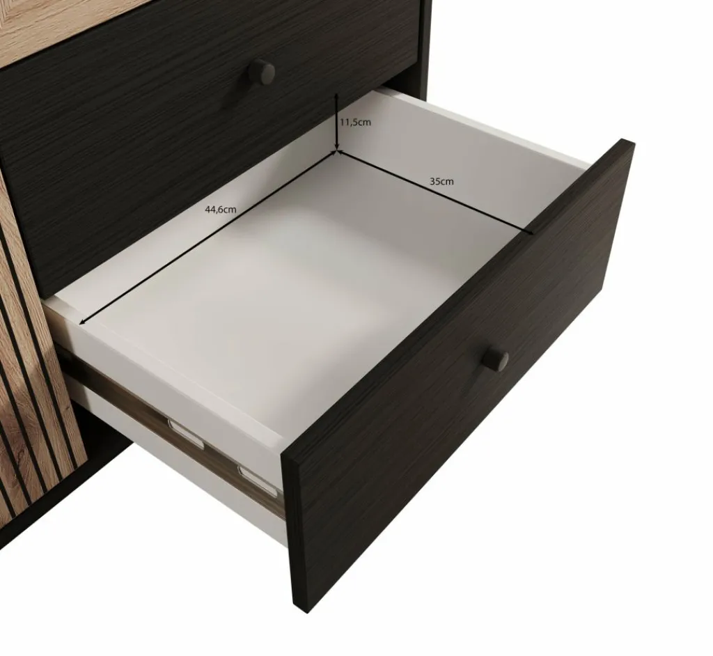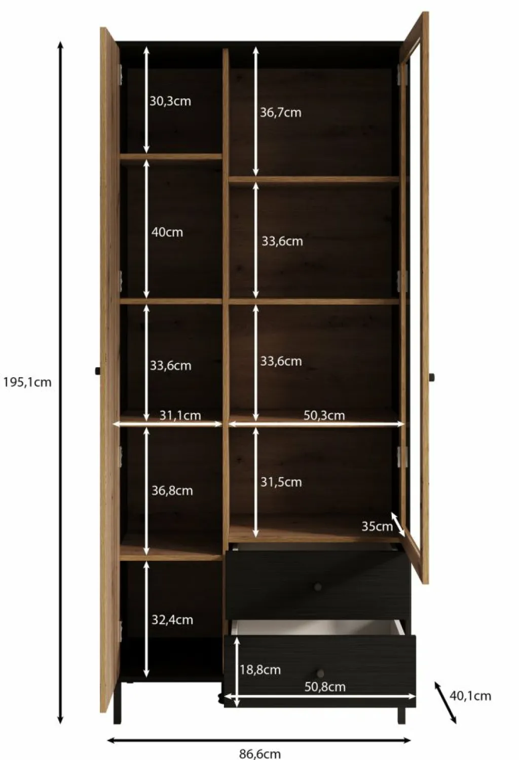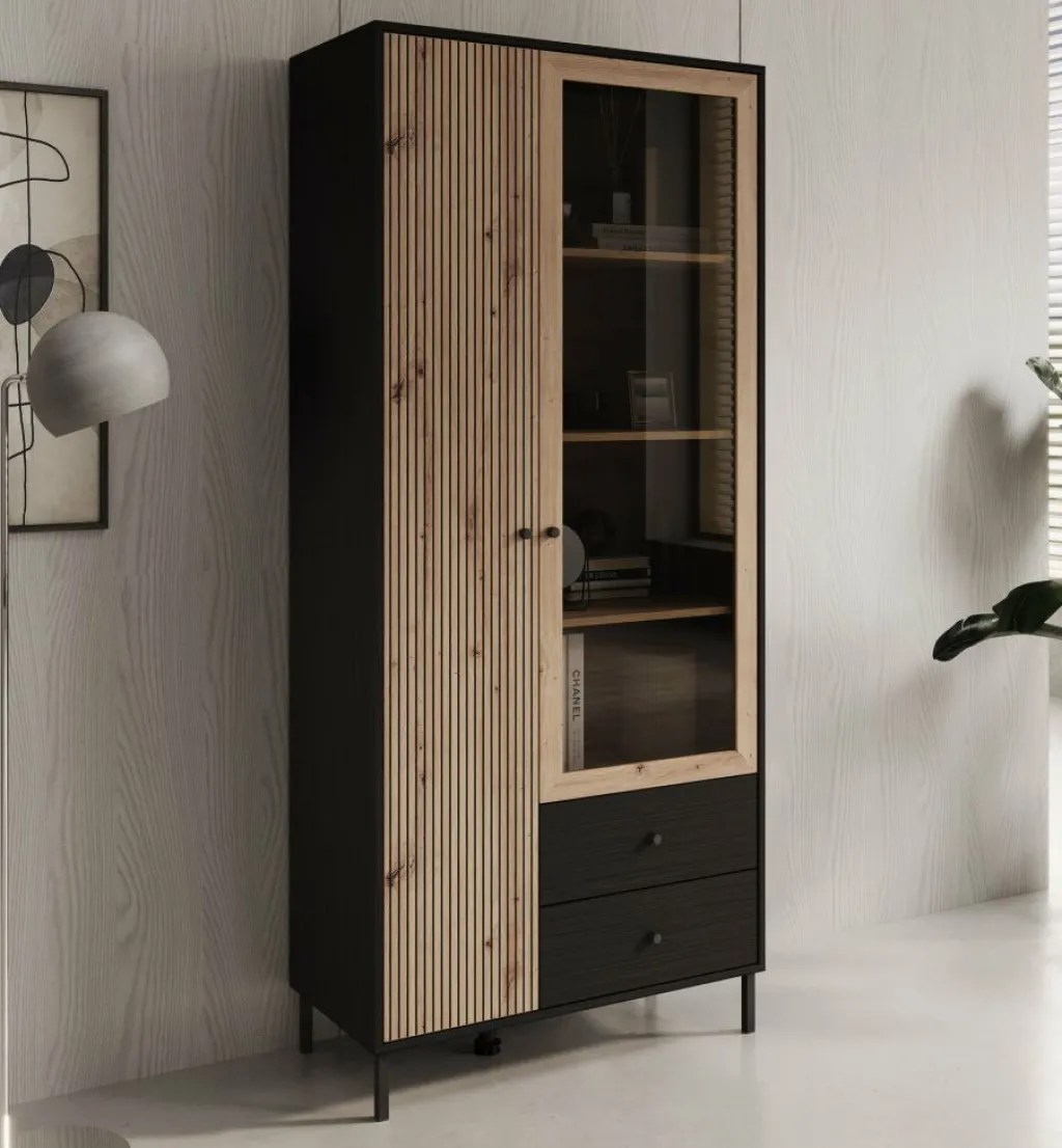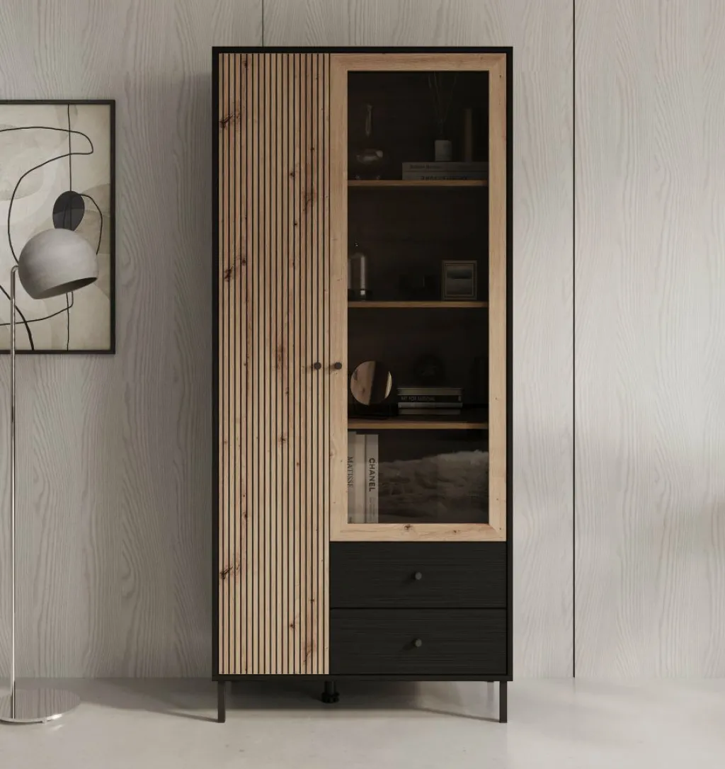 Vitrinekast Charles is een industriële kast die uitgevoerd is in de kleuren eiken met zwart eiken. De opbergkast beschikt over 2 deuren waarvan de rechter uit glas bestaat. Deze deuren zijn te openen met zwarte knoppen en hierachter zitten maar liefst 9 opbergvakken. Om het meubel compleet te maken heeft het ook nog 2 lades. De Charles staat op metalen pootjes en 1 ondersteunende poot.