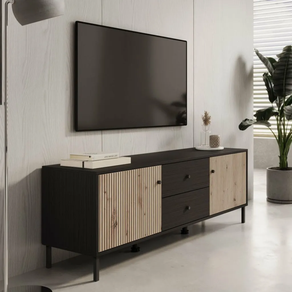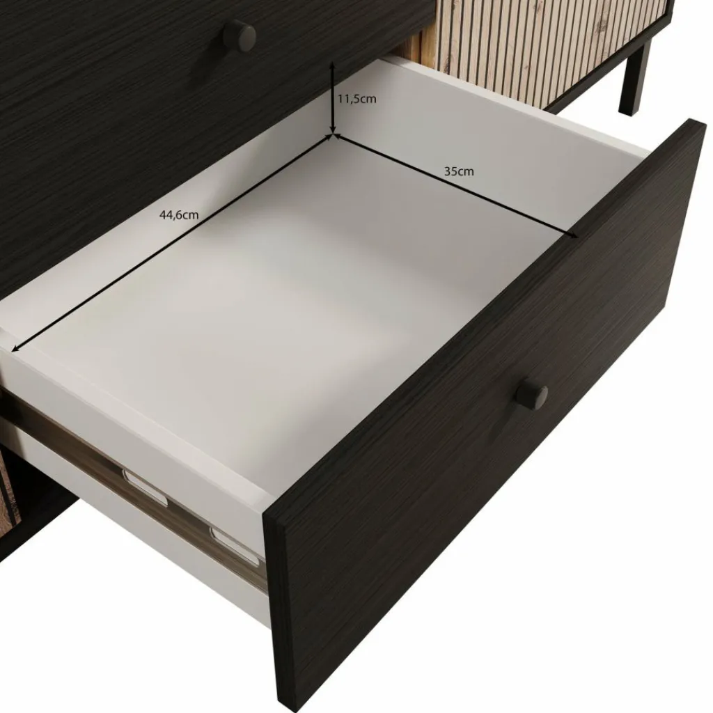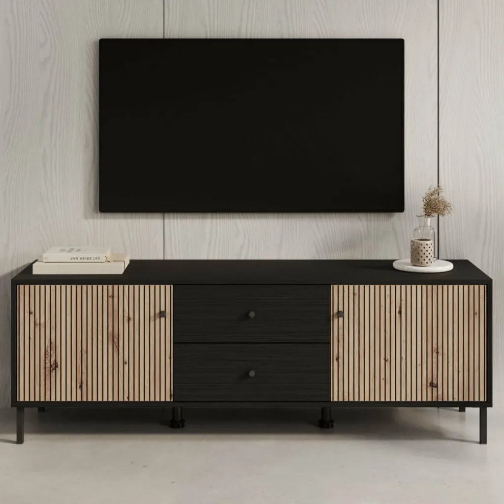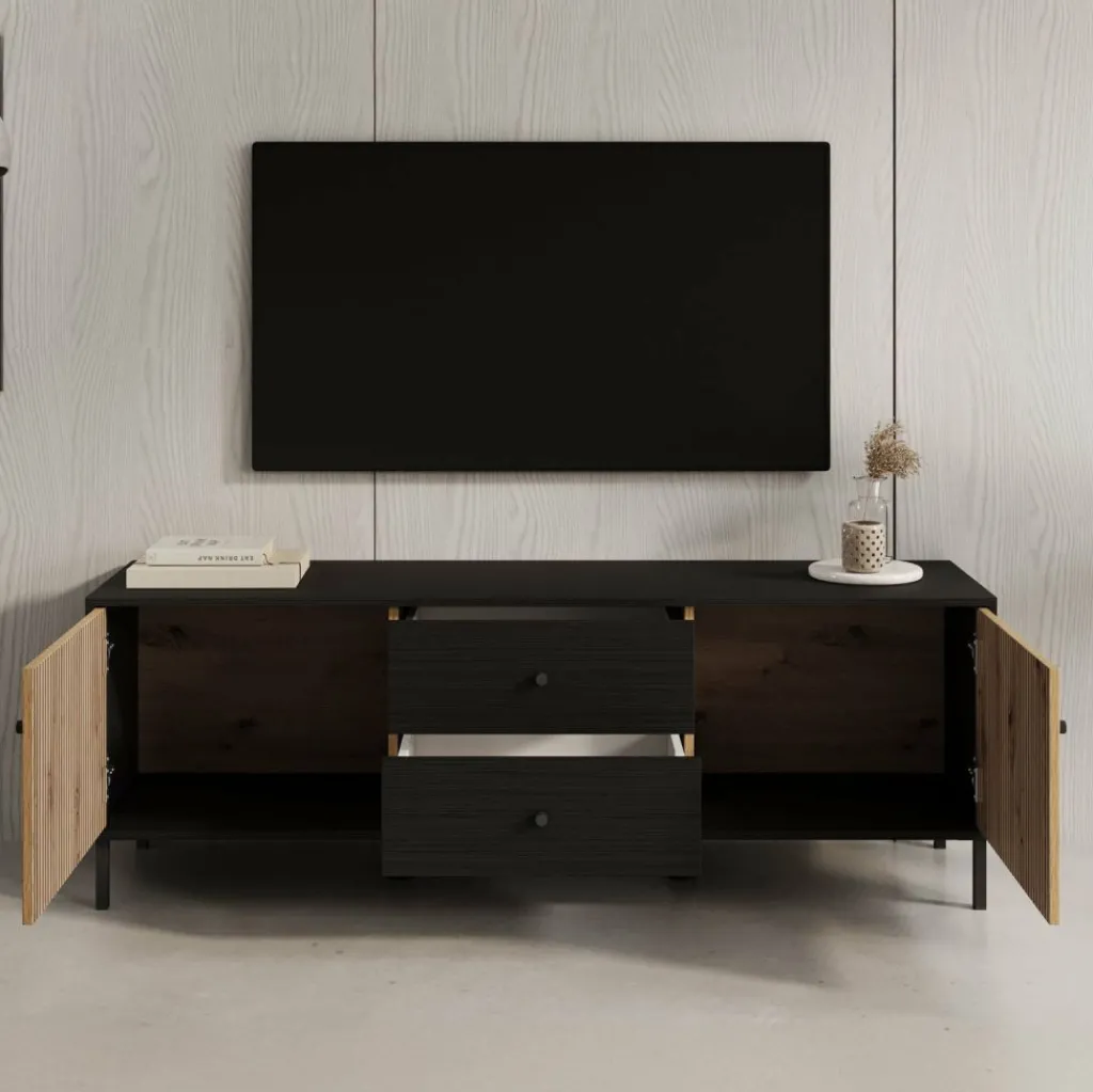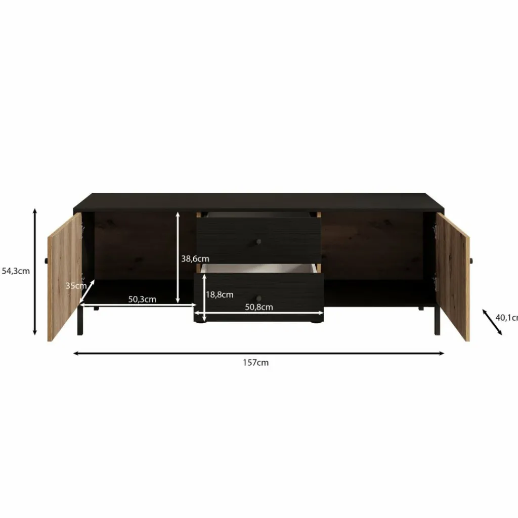 TV-Meubel Charles is een opbergkast voor onder de tv in een moderne, industriële stijl. De kast beschikt over 2 lades en 2 deuren die openen met zwarte knoppen. Achter de deuren zijn in totaal 2 opbergvakken te vinden. Het meubel is uitgevoerd in een zwart eiken met eiken kleur en staat op metalen poten met in het midden 2 extra pootjes.