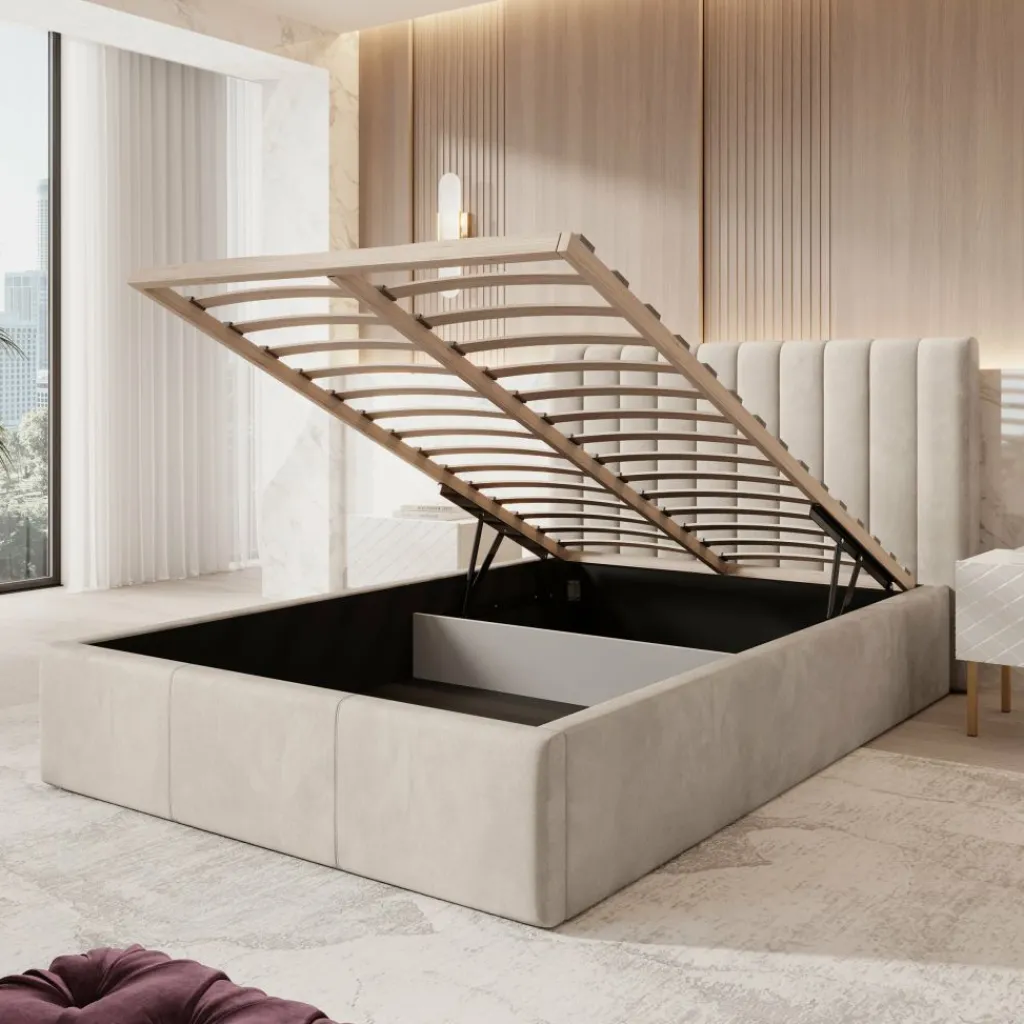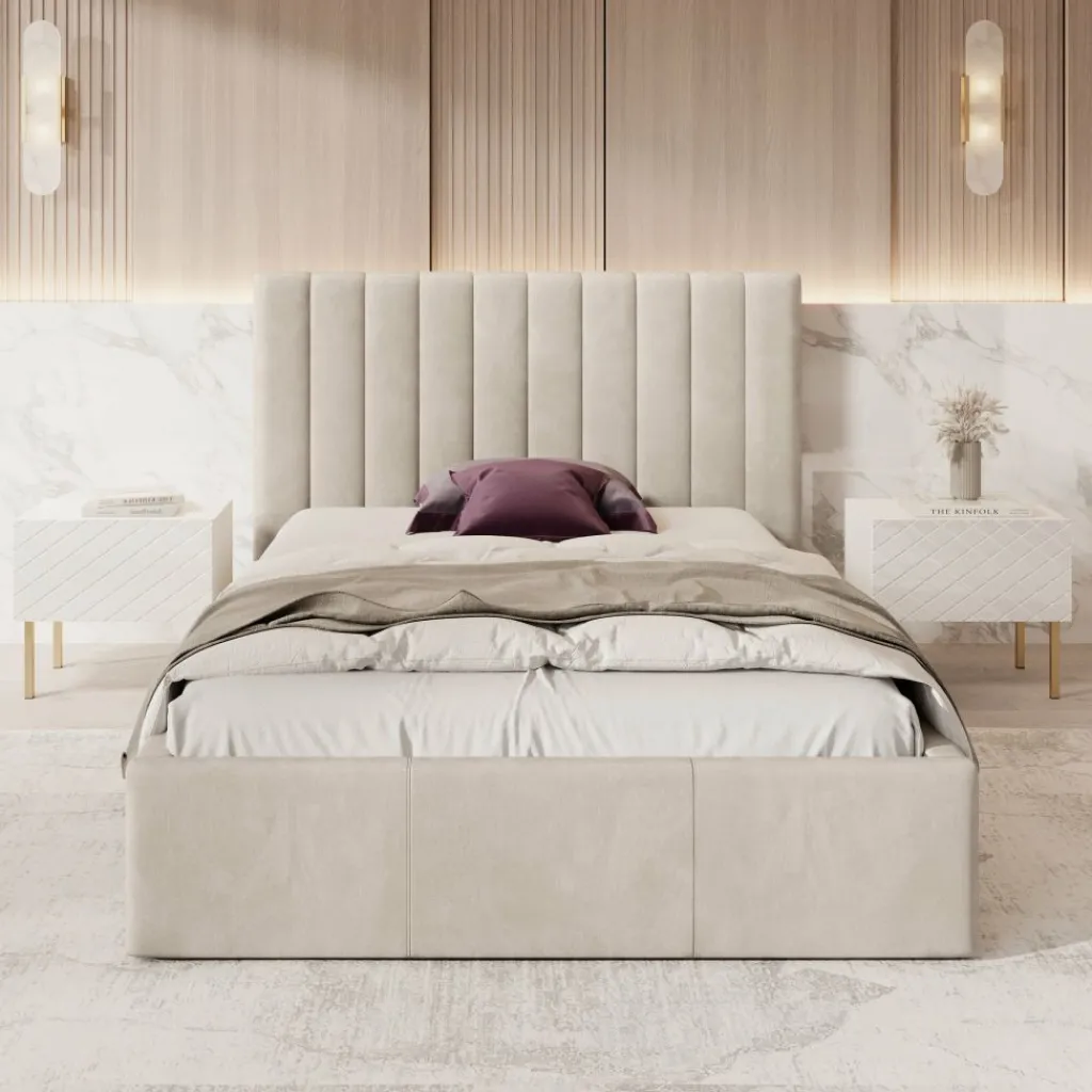 Tweepersoonsbed Chief is een modern bed in beige kleur, volledig bekleed met een sterke en onderhoudsvriendelijke velvet stof. Het hoofdbord is afgewerkt met verticale siernaden, wat het geheel een elegante uitstraling geeft.