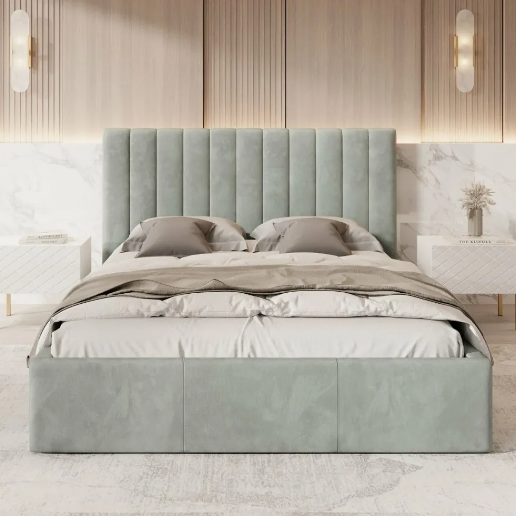 Tweepersoonsbed Chief is een modern bed in grijze kleur, volledig bekleed met een sterke en onderhoudsvriendelijke velvet stof. Het hoofdbord met verticale siernaden geeft het bed een stijlvolle en luxe uitstraling.