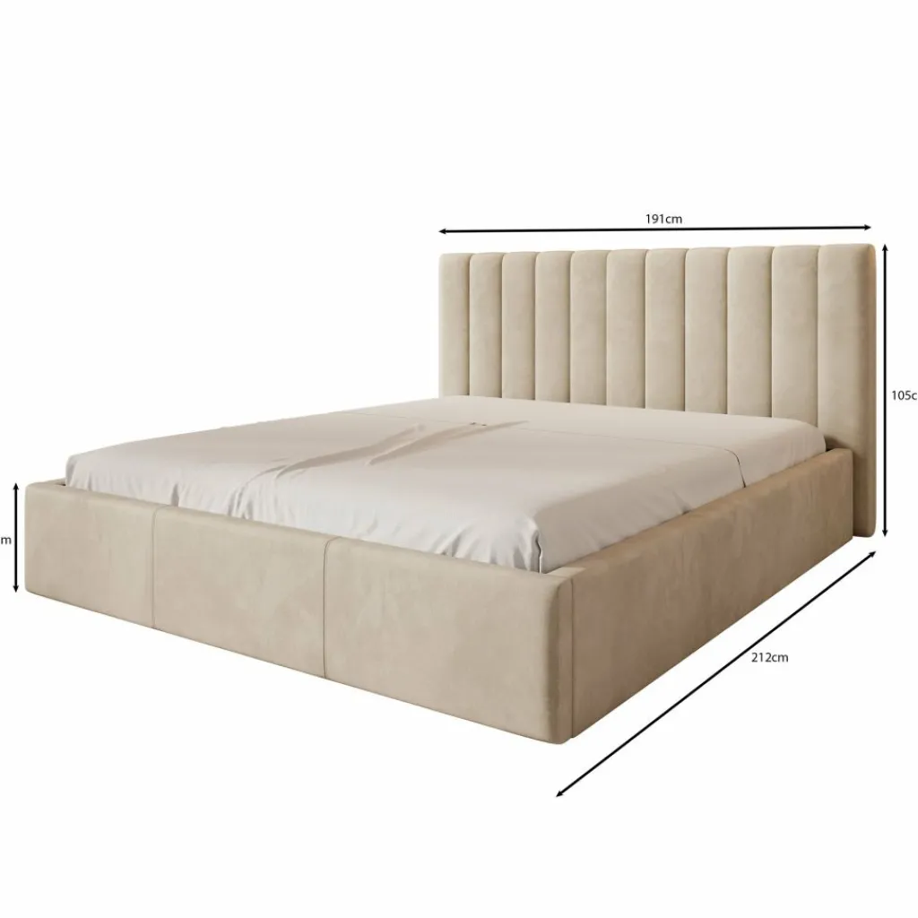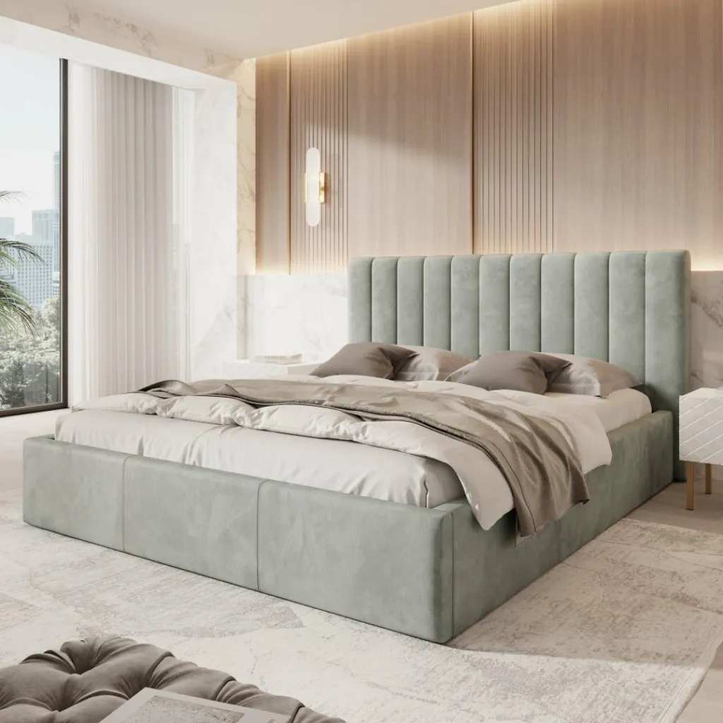 Tweepersoonsbed Chief is een modern bed in grijze kleur. Het model is volledig bekleed met een sterke en onderhoudsvriendelijke velvet stof. Het hoofdbord met verticale siernaden geeft het bed een luxe en tijdloze uitstraling.