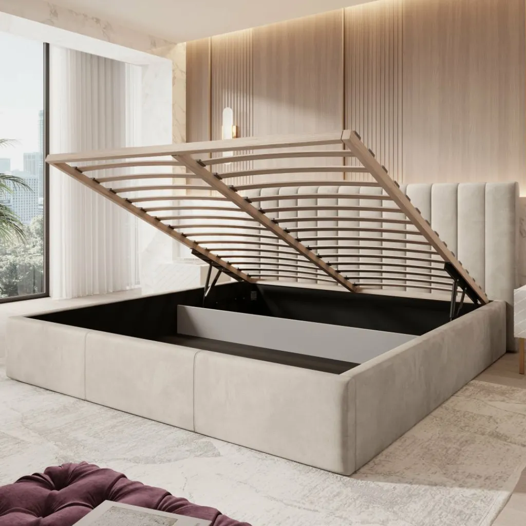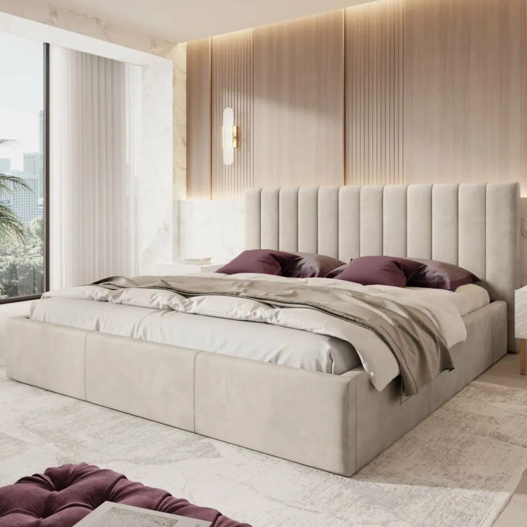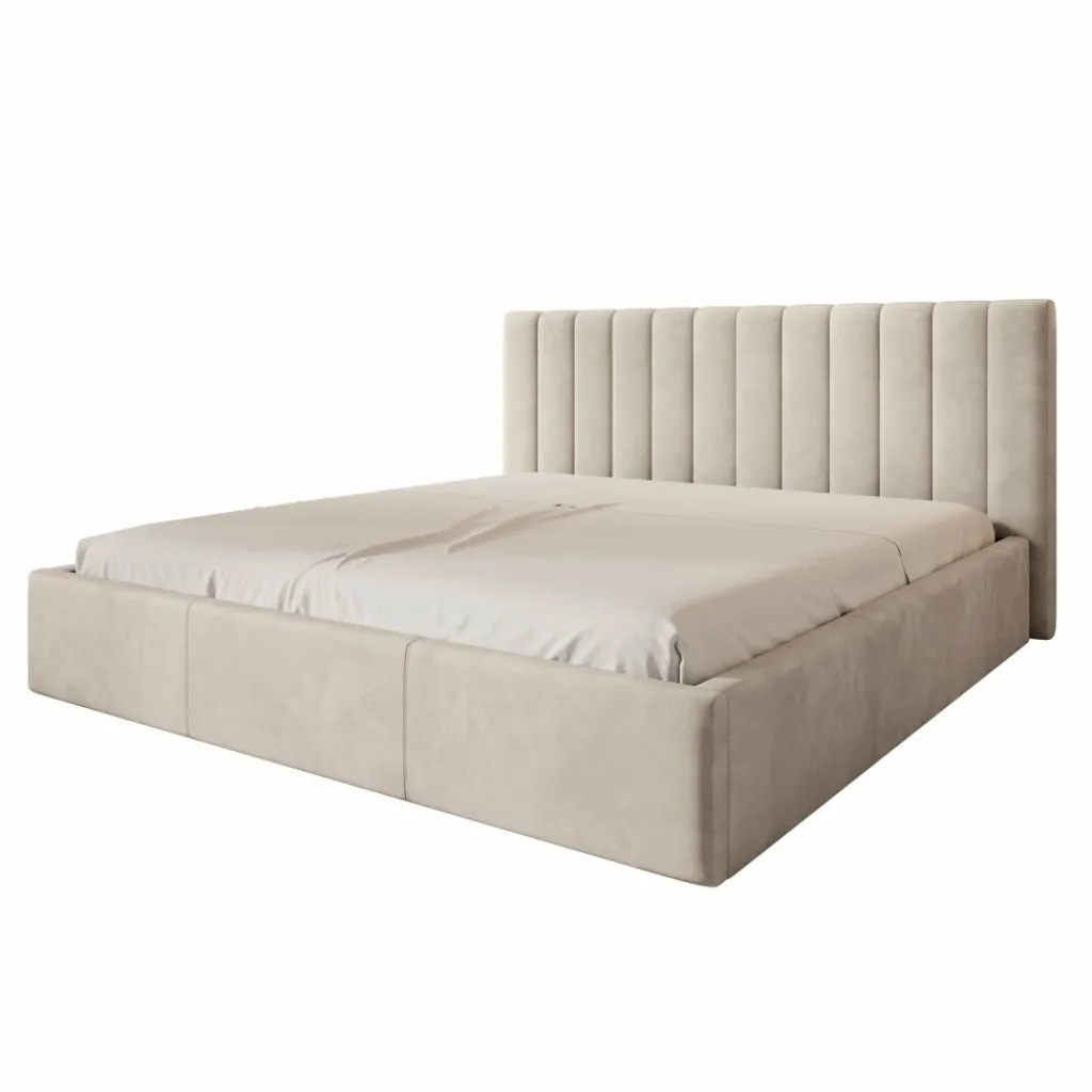 Tweepersoonsbed Chief is een modern bed in beige kleur, volledig bekleed met een sterke en onderhoudsvriendelijke velvet stof. Het hoofdbord is afgewerkt met verticale siernaden, wat het bed een stijlvolle en luxueuze uitstraling geeft.