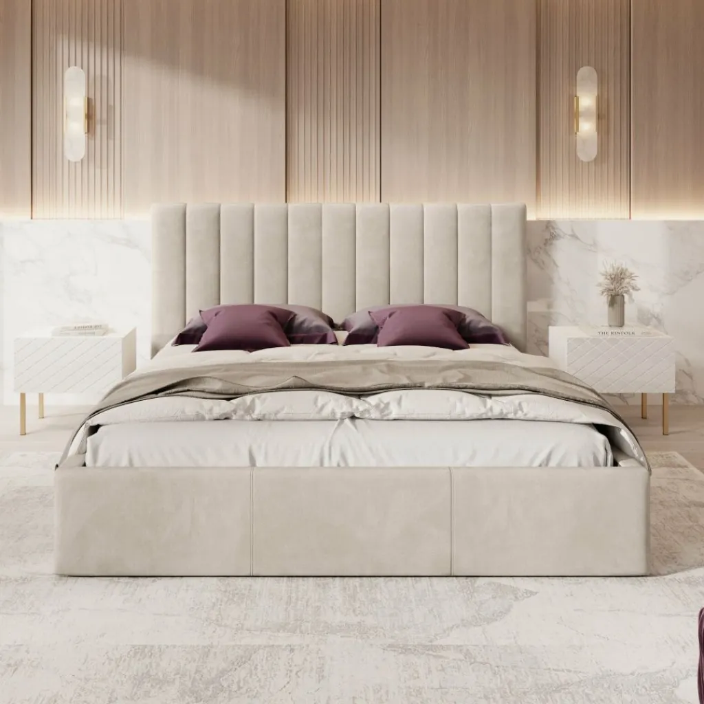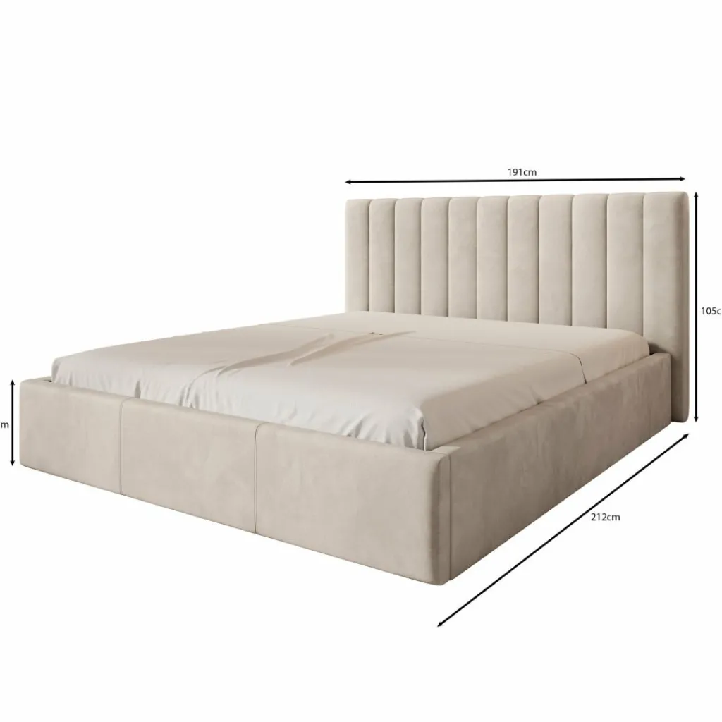 Tweepersoonsbed Chief is een modern bed in beige kleur, volledig bekleed met een sterke en onderhoudsvriendelijke velvet stof. Het hoofdbord is afgewerkt met verticale siernaden, wat zorgt voor een stijlvolle uitstraling.