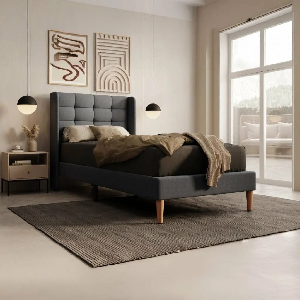 Eenpersoonsbed Christ is een bed geschikt voor matrasmaat 90×200 cm. Het meubel is gemaakt van stof in de kleur grijs. Het bed wordt geleverd zonder matras. De lattenbodem is wel inbegrepen. Het bed staat op hoge, eikenkleurige pootjes en heeft een gecapitonneerd hoofdbord.