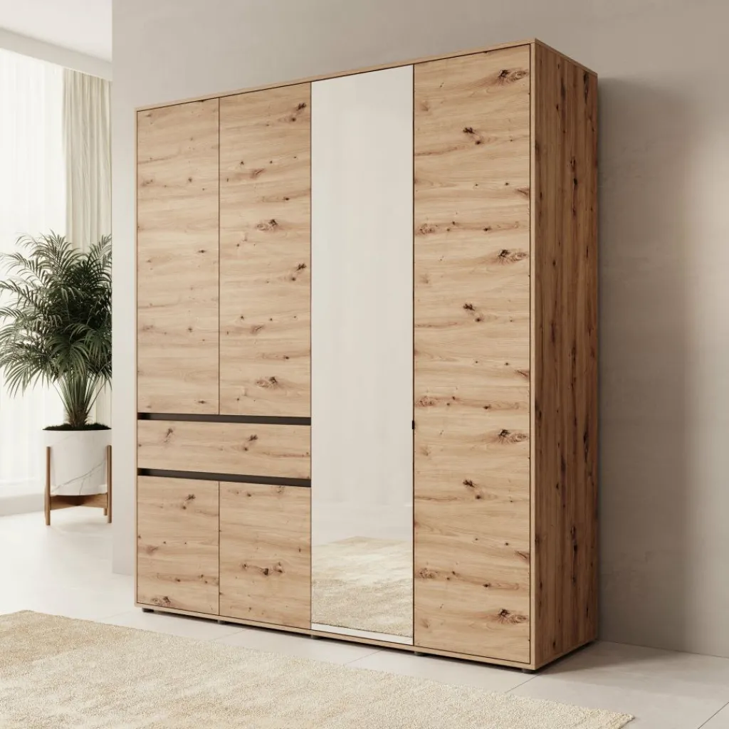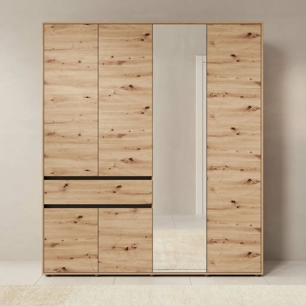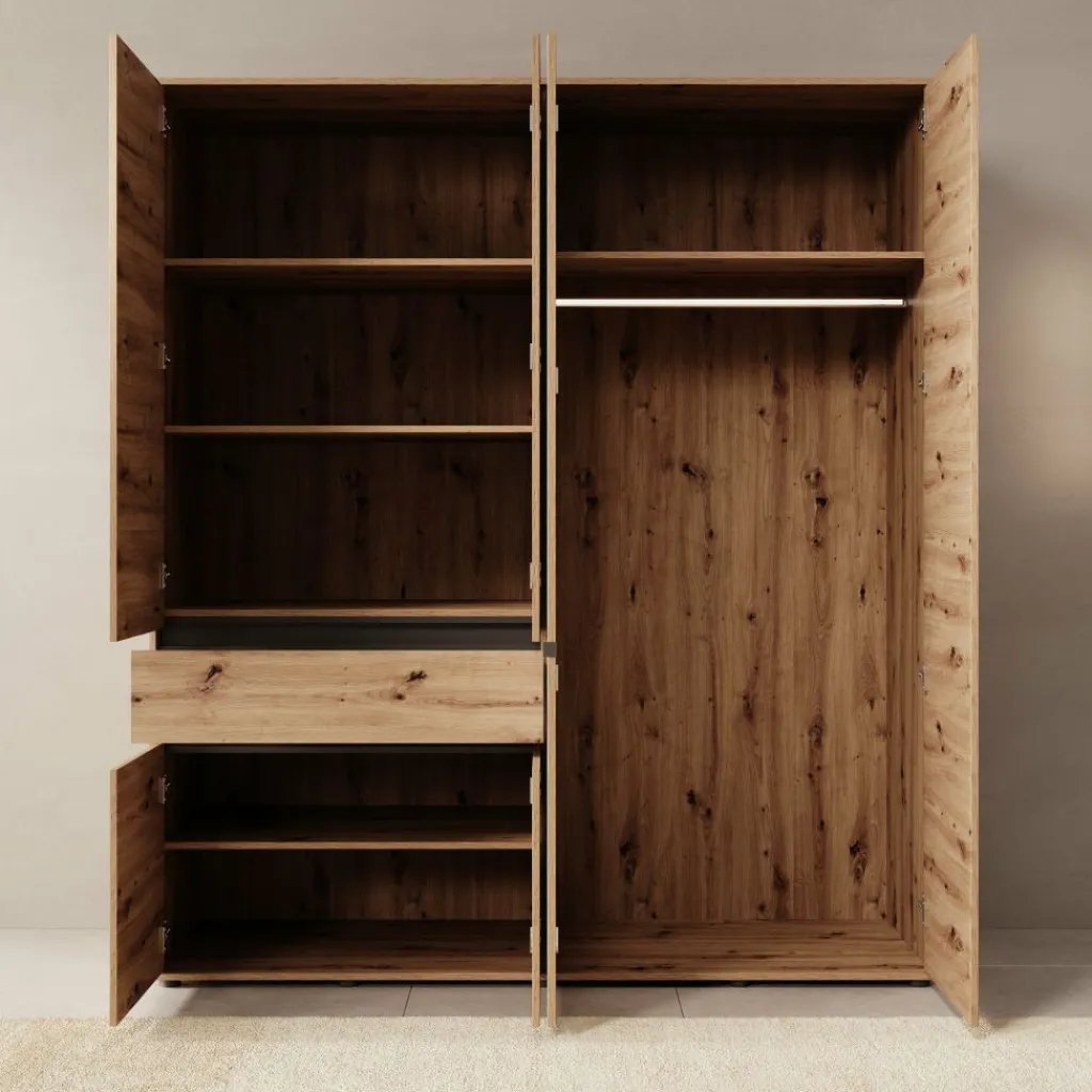 Achter de vier deuren bevindt zich een praktische indeling met meerdere legplanken en een hanggedeelte met roede. Hierdoor kun je kleding overzichtelijk ophangen en gevouwen opbergen. In het onderste gedeelte zijn lades geïntegreerd voor kleinere kledingstukken en accessoires, zodat alles netjes gescheiden blijft.
