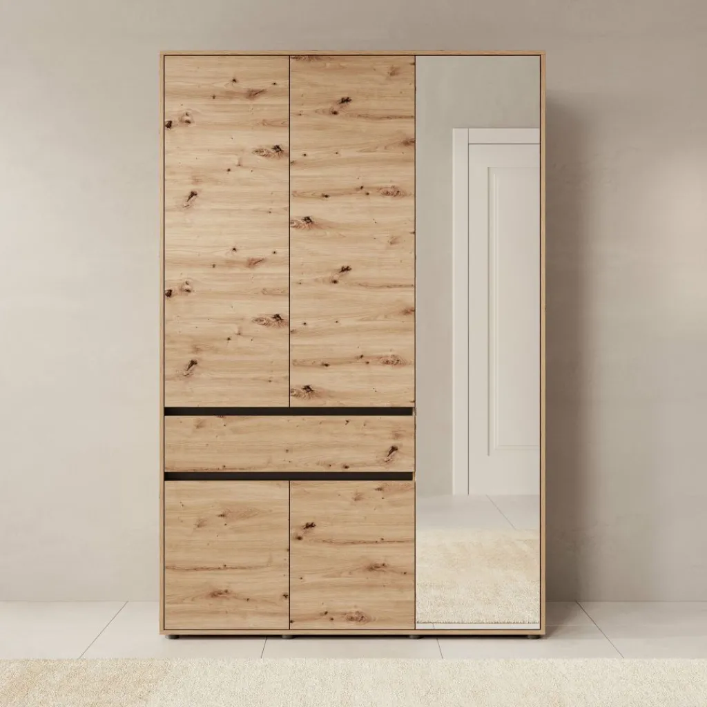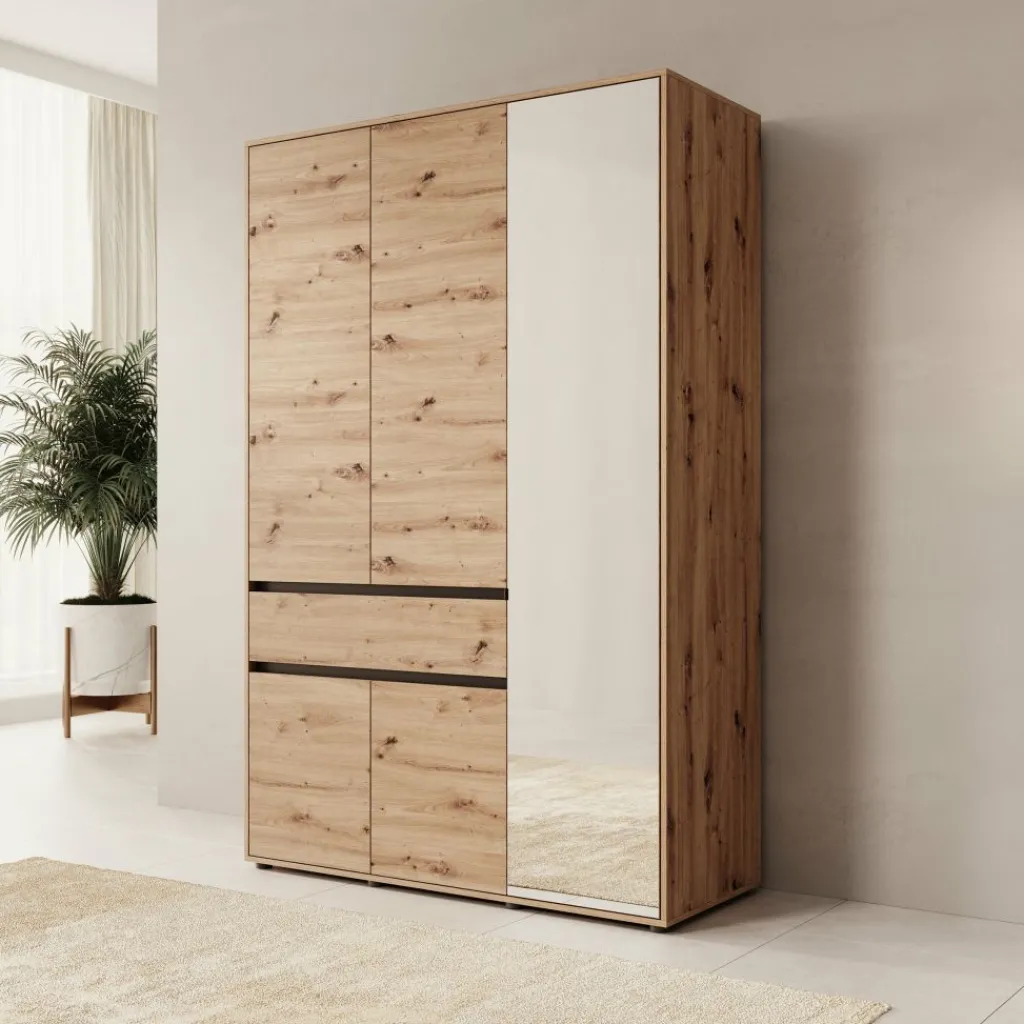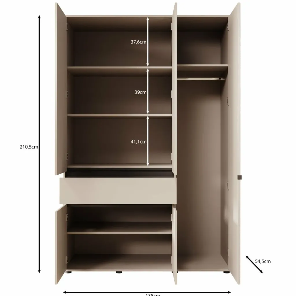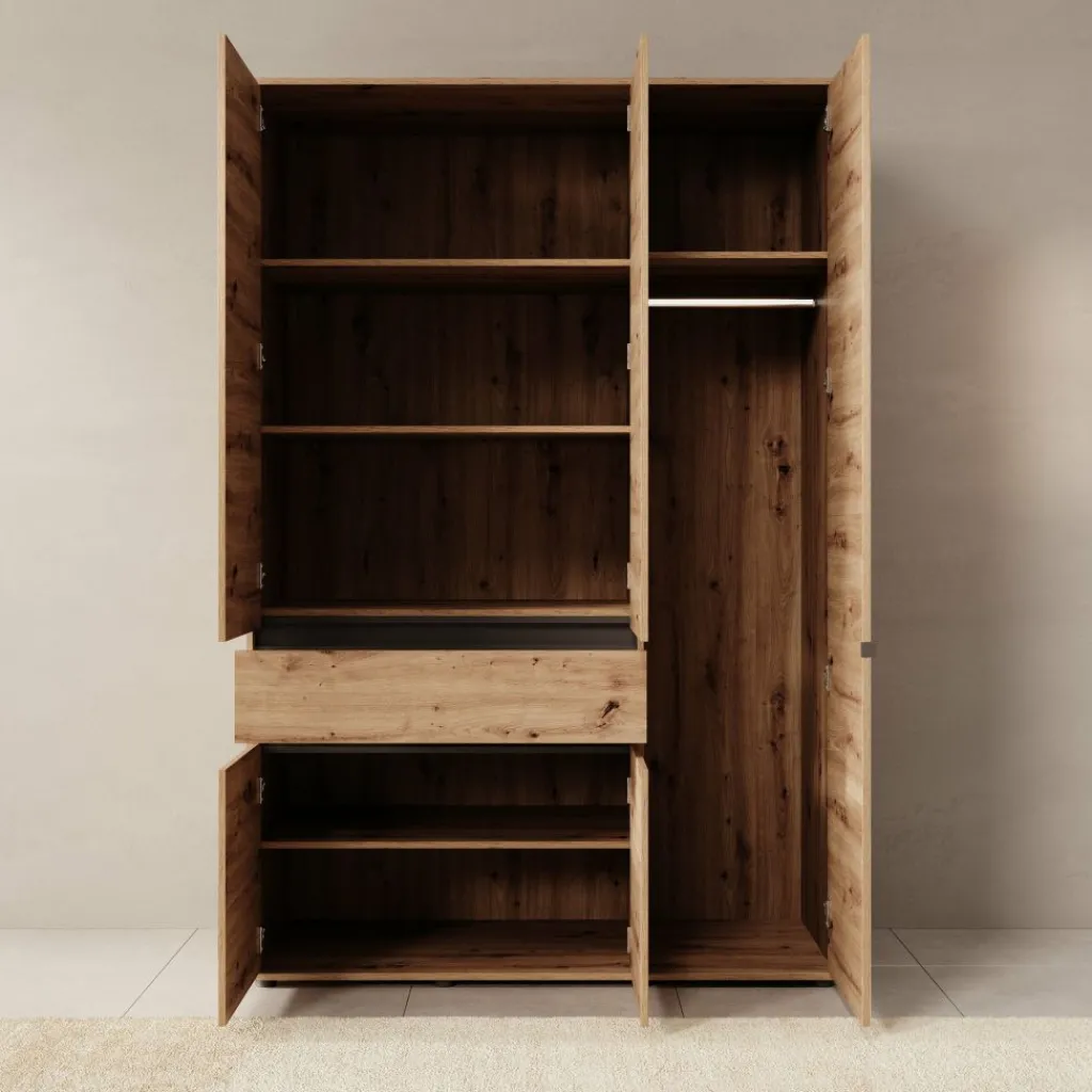Achter de drie deuren bevindt zich een praktische indeling met meerdere legplanken en een hanggedeelte met roede voor het ophangen van jassen, blouses en jurken. De legplanken hebben een maximaal draagvermogen van 5 kg per plank en zijn geschikt voor gevouwen kleding of opbergboxen. De twee geïntegreerde lades in het midden zorgen voor extra opbergruimte voor kleinere items en hebben een maximaal draagvermogen van 5 kg per lade.