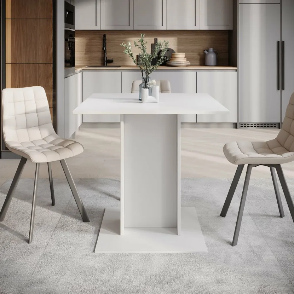 Het tafelblad en de voet zijn uitgevoerd in wit, wat zorgt voor een strakke en neutrale uitstraling die eenvoudig te combineren is met verschillende stoelen en interieurkleuren. De centrale kolompoot zorgt voor vrije beenruimte rondom, waardoor stoelen eenvoudig aangeschoven kunnen worden zonder hinder van tafelpoten op de hoeken.