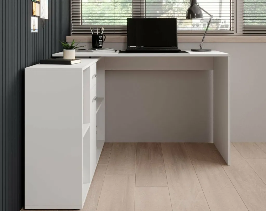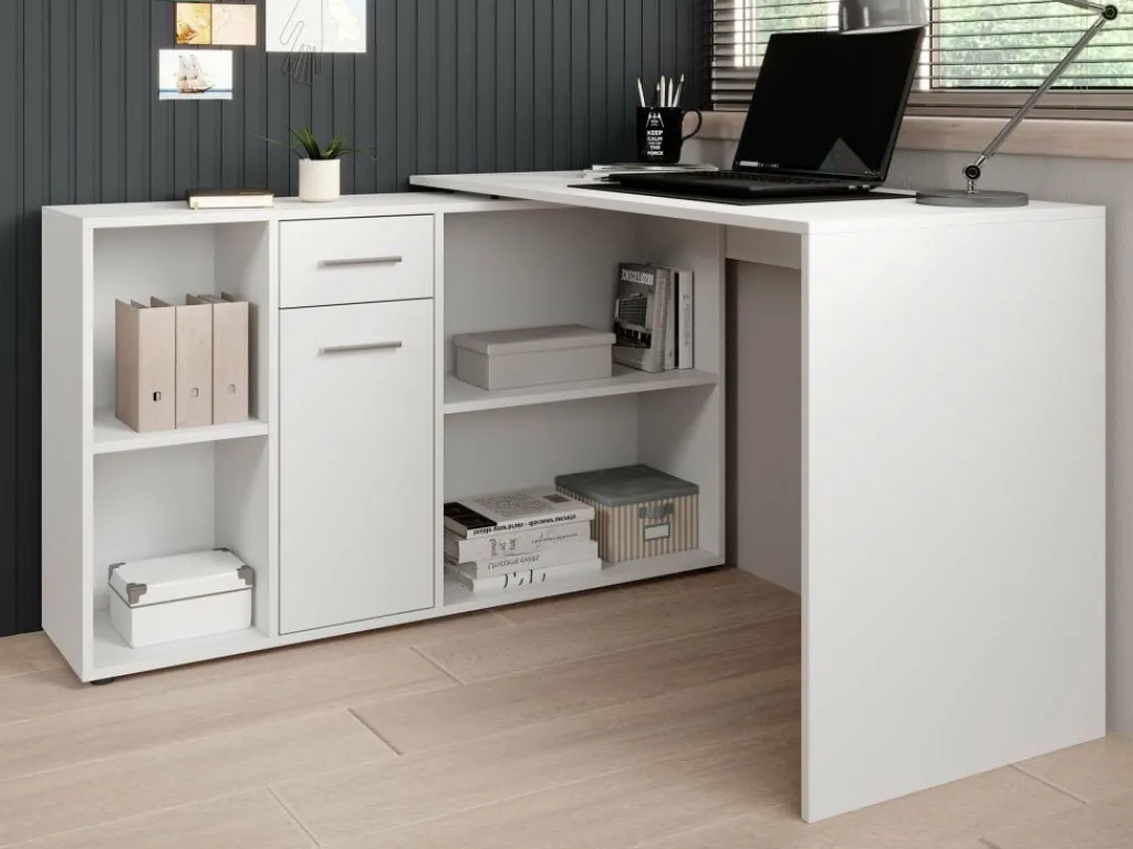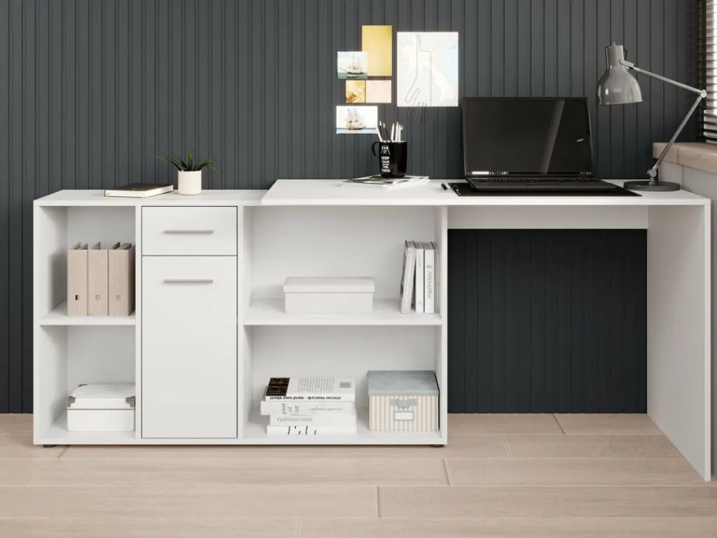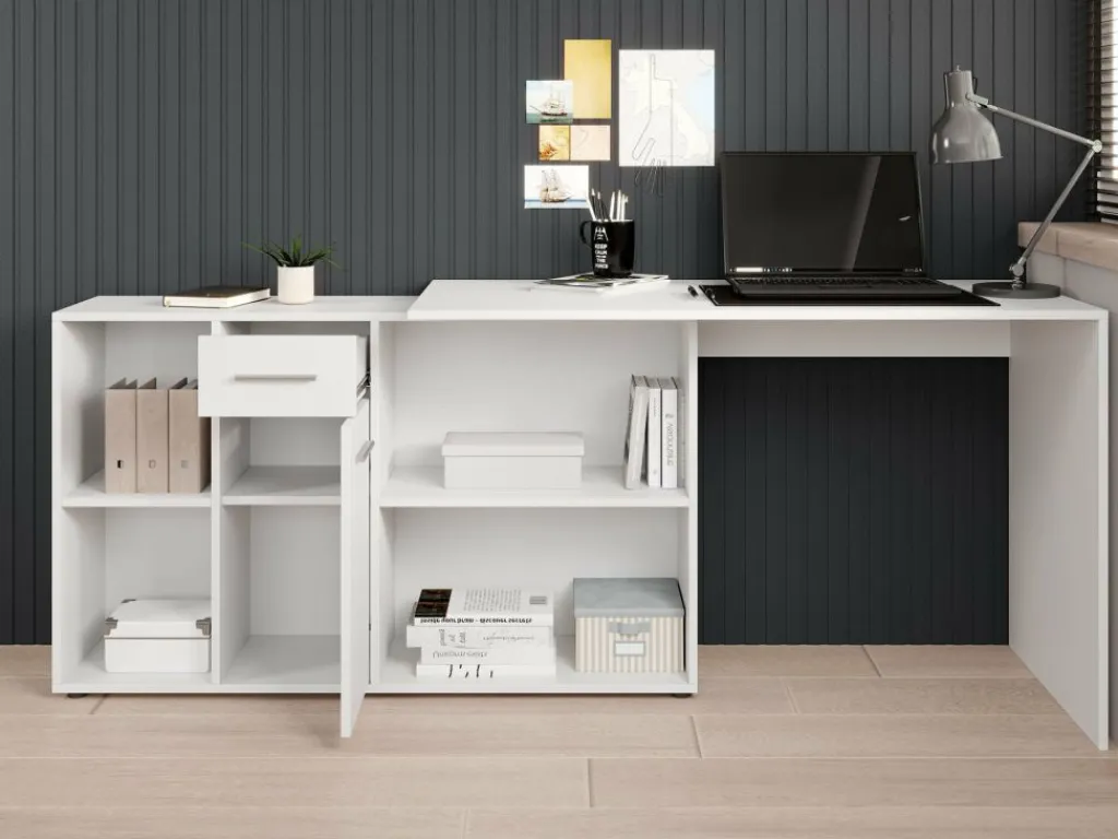 Het bureau beschikt over 1 lade en 1 deur, die je opent met grijze handgrepen. Daarnaast bevinden zich 4 open vakken. De module met opbergkasten is van positie te veranderen: plaats deze recht naast het blad, of schuin voor een hoekbureau.