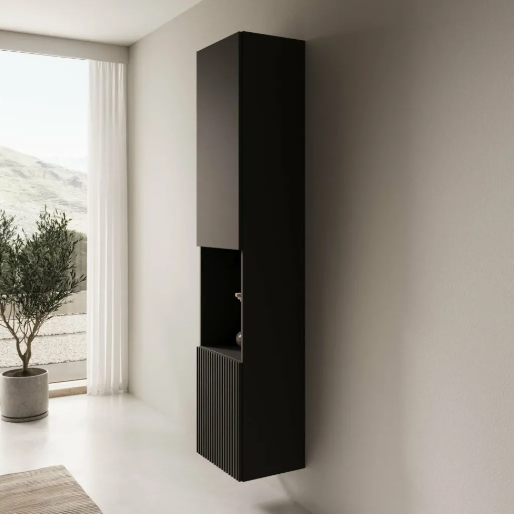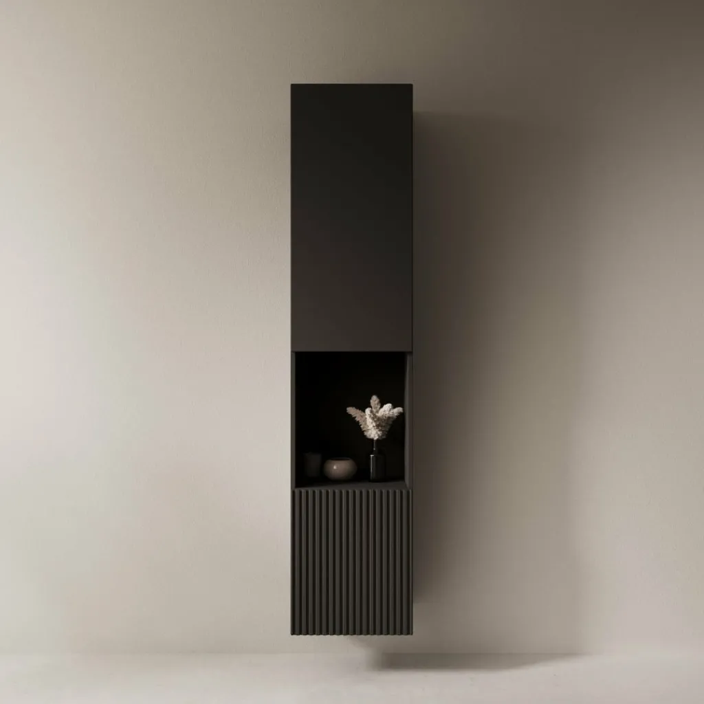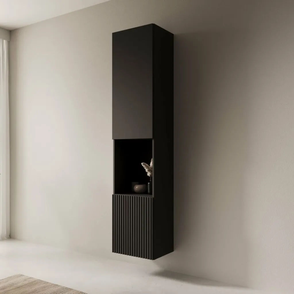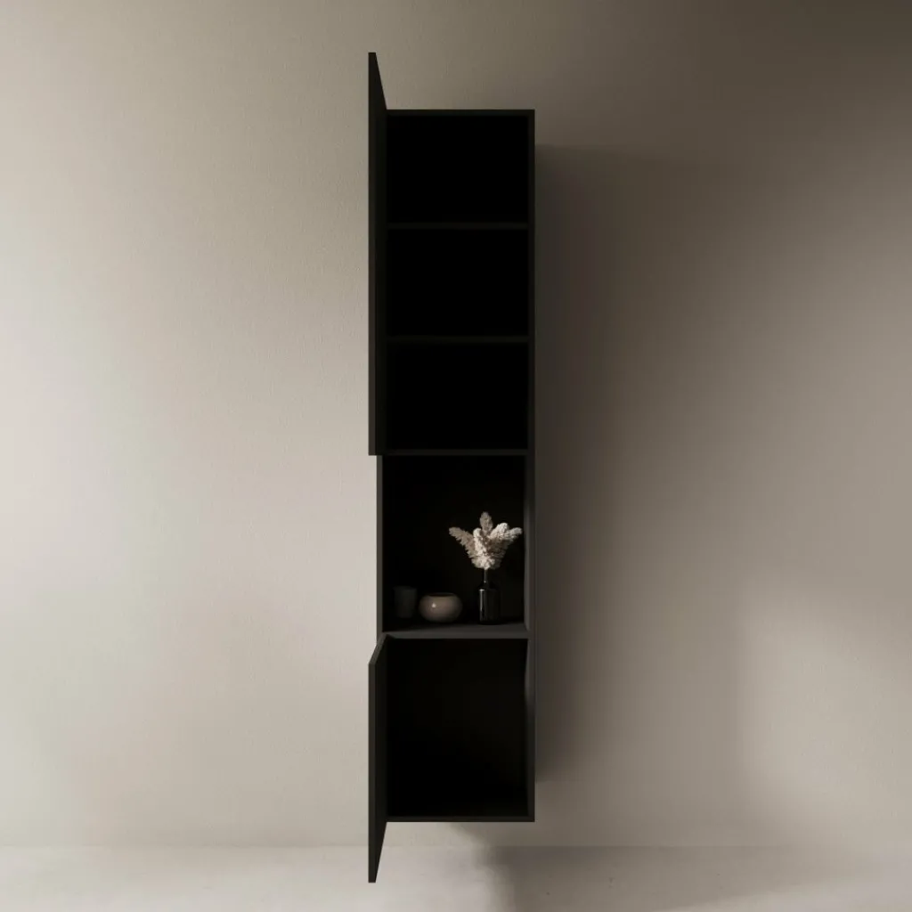 De Cruzar 2 vitrinekast in zwart heeft een strakke, verticale vormgeving met een combinatie van gesloten opbergruimte en een open middenvak. De volledig zwarte uitvoering zorgt voor een rustige uitstraling die goed past binnen moderne en industriële interieurs. Het onderste front is afgewerkt met een verticale lamelstructuur, wat het ontwerp een subtiel detail geeft.