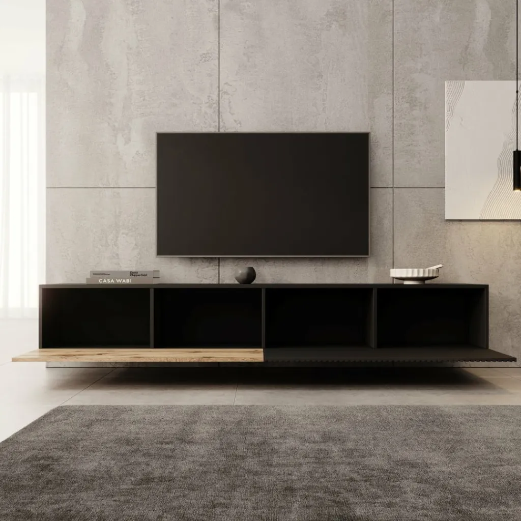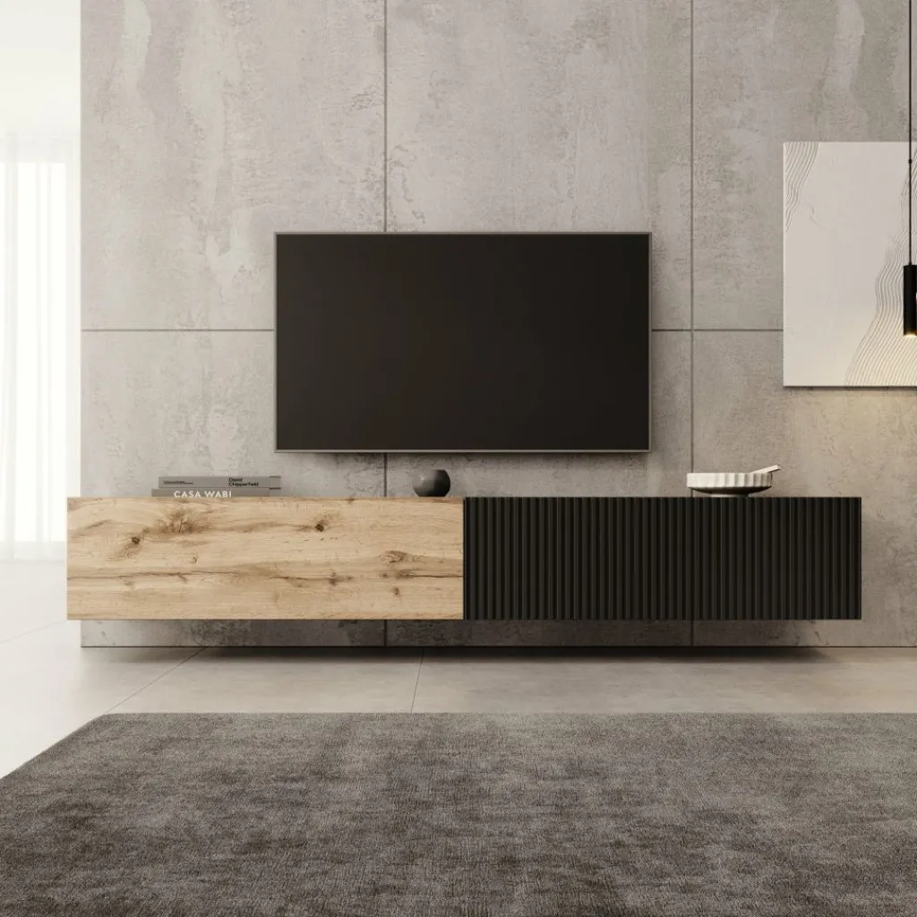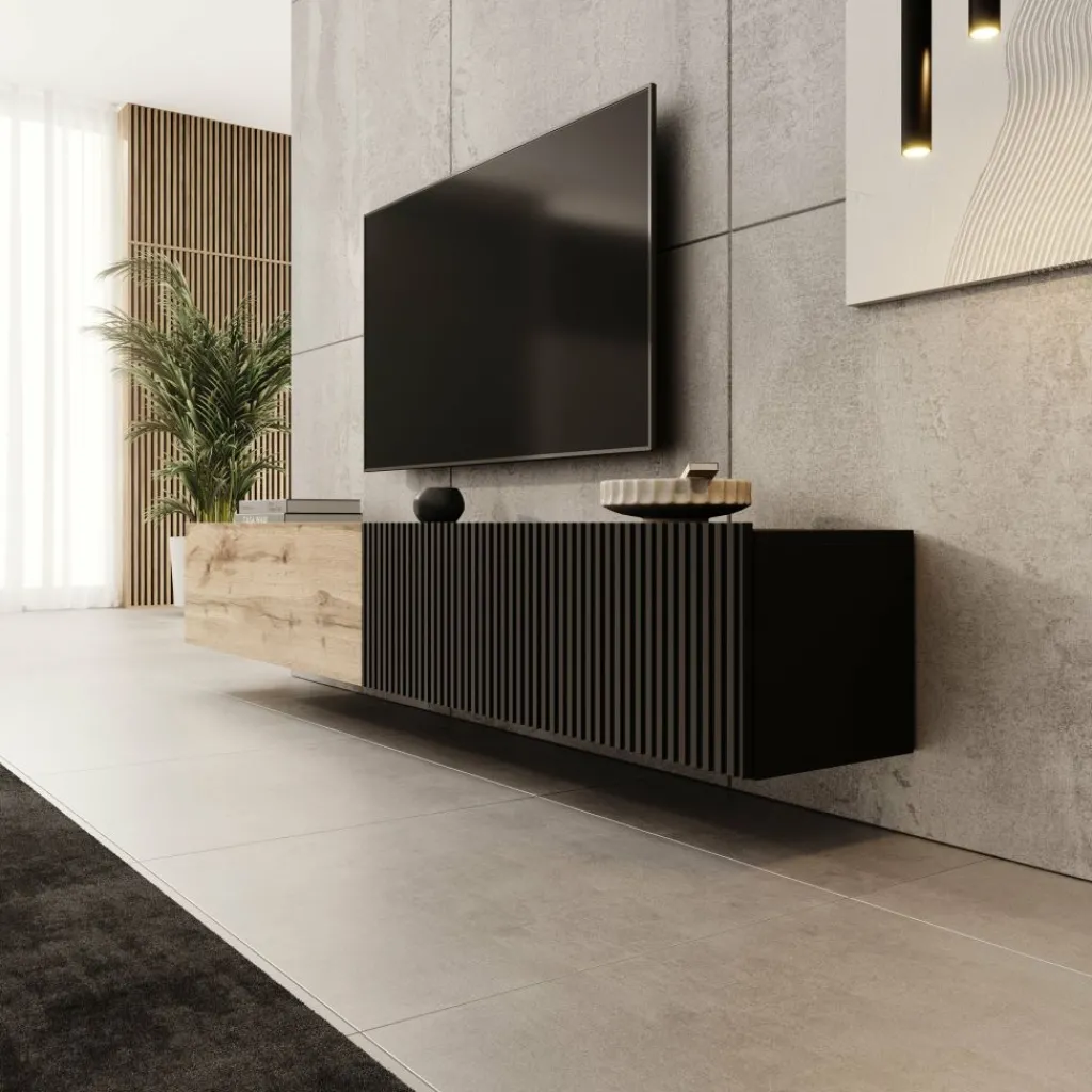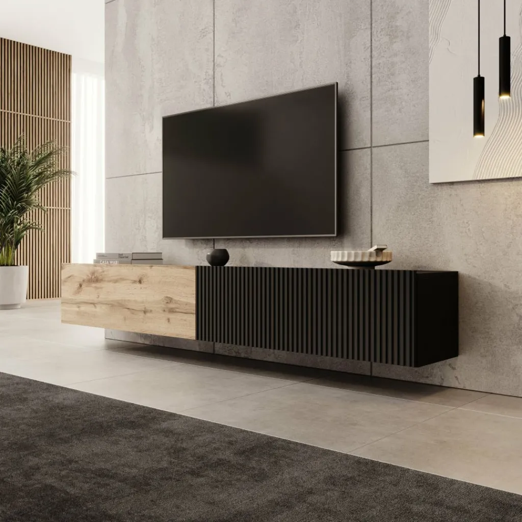 Achter de kleppen bevinden zich opbergvakken waarin je apparatuur en kleinere items kunt opbergen. De greeploze afwerking en het zwevende montagesysteem zorgen voor een opgeruimd geheel en maken vloeroppervlak vrij, wat het meubel geschikt maakt voor zowel compacte als ruime woonkamers.