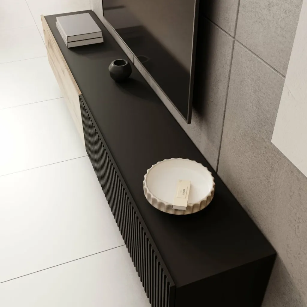 Het Cruzar TV-meubel in zwart/eiken is ontworpen als een strak en functioneel meubel. De combinatie van een matzwarte basis met een eiken front geeft het ontwerp een moderne, rustige uitstraling die goed past bij uiteenlopende interieurs. Met een breedte van 200 cm biedt het meubel voldoende ruimte voor een televisie en accessoires.