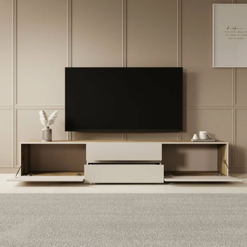 Het meubel beschikt over twee klepdeuren aan de buitenzijden en twee centrale lades. Achter de kleppen bevindt zich per zijde een ruim vak van circa 62,6 cm breed en 30,4 cm diep. De binnenhoogte van deze vakken bedraagt ongeveer 30,4 cm. De lades in het midden hebben een binnenmaat van circa 62,8 cm diep, 28,5 cm breed en 8,6 cm hoog, geschikt voor kleinere accessoires zoals afstandsbedieningen, kabels of handleidingen.