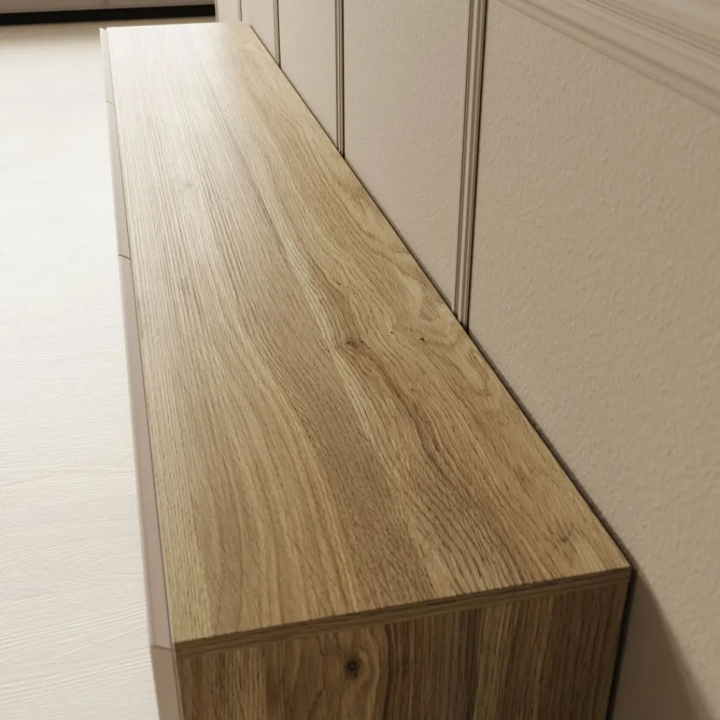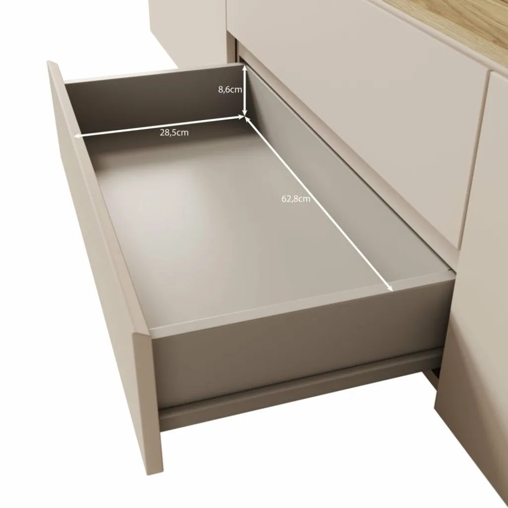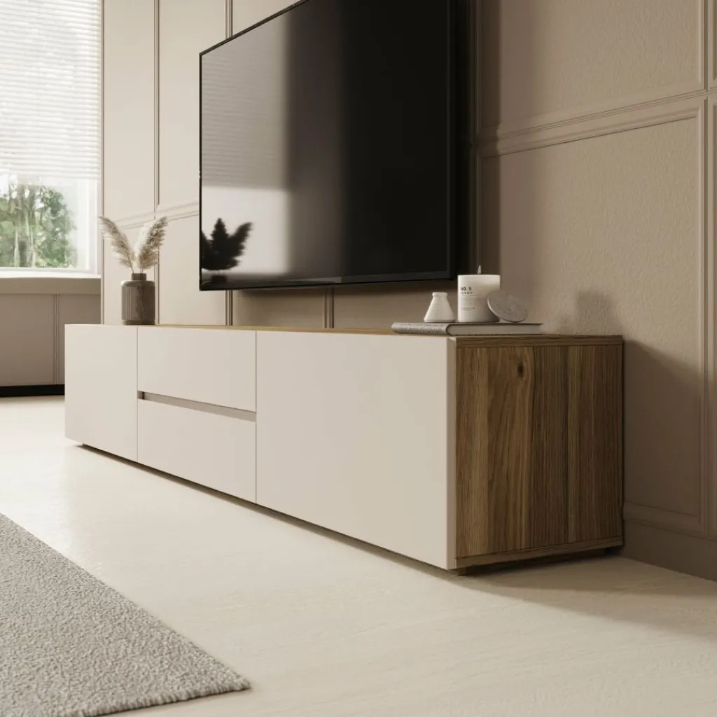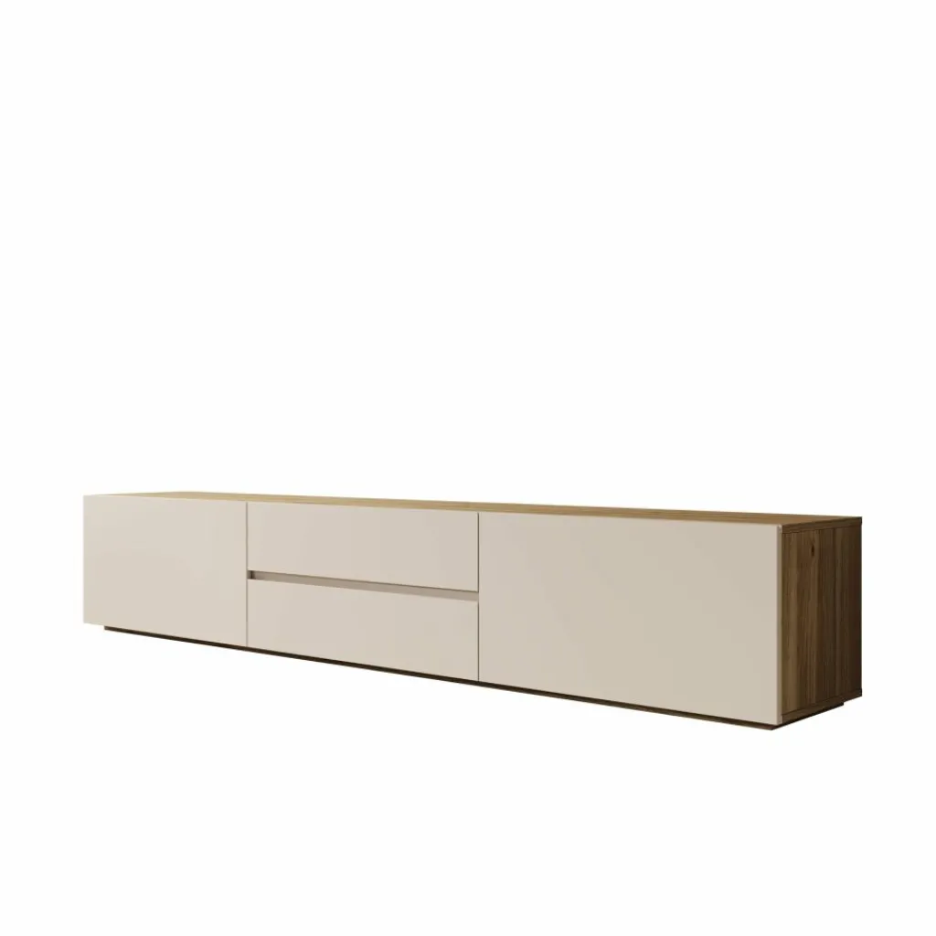 Dit tv-meubel heeft een strak en laag ontwerp en is uitgevoerd in beige met een eikenpatroon aan de bovenzijde en zijkanten. Met een breedte van 200 cm biedt het voldoende ruimte voor een televisie en bijbehorende apparatuur, terwijl de diepte van 34 cm zorgt voor een slank profiel tegen de wand.