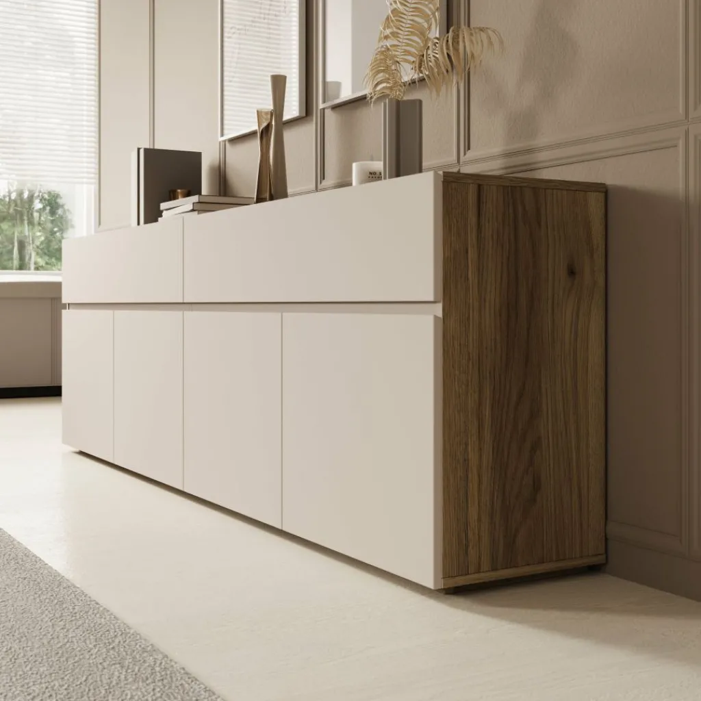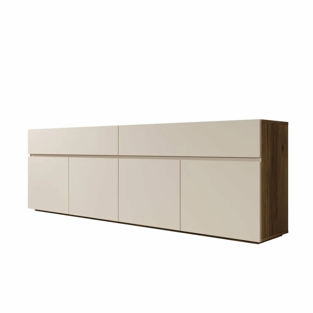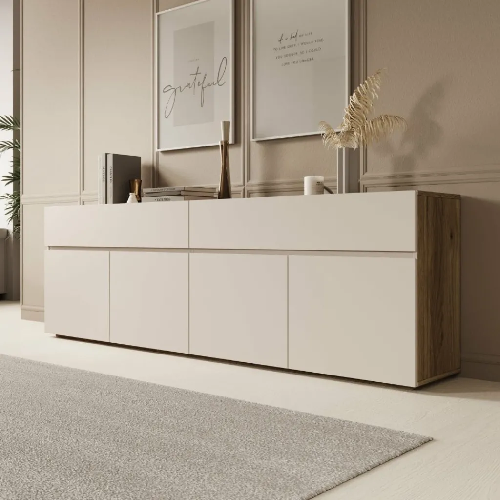Het Cumi dressoir is uitgevoerd in een combinatie van beige en eikenpatroon. De beige fronten zorgen voor een strak geheel, terwijl het eikenpatroon aan de zijkanten en het bovenblad een duidelijk houtaccent toevoegt.