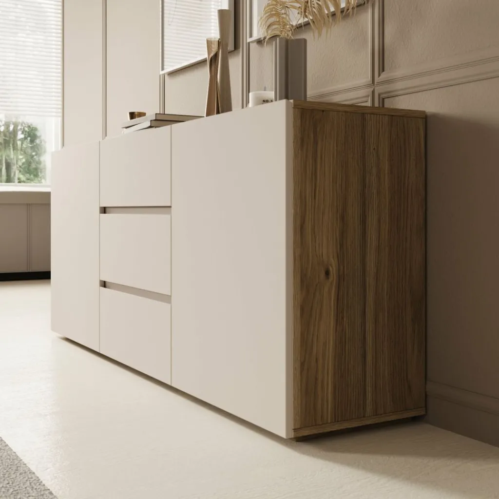 Het dressoir is voorzien van twee ruime kastdelen met legplanken en drie centrale lades. Hierdoor kun je eenvoudig afwisselen tussen gesloten opbergruimte en overzichtelijke lade-opslag. Servies, documenten of andere spullen berg je netjes uit het zicht op, terwijl het bovenblad geschikt is voor decoratie of dagelijkse items.
