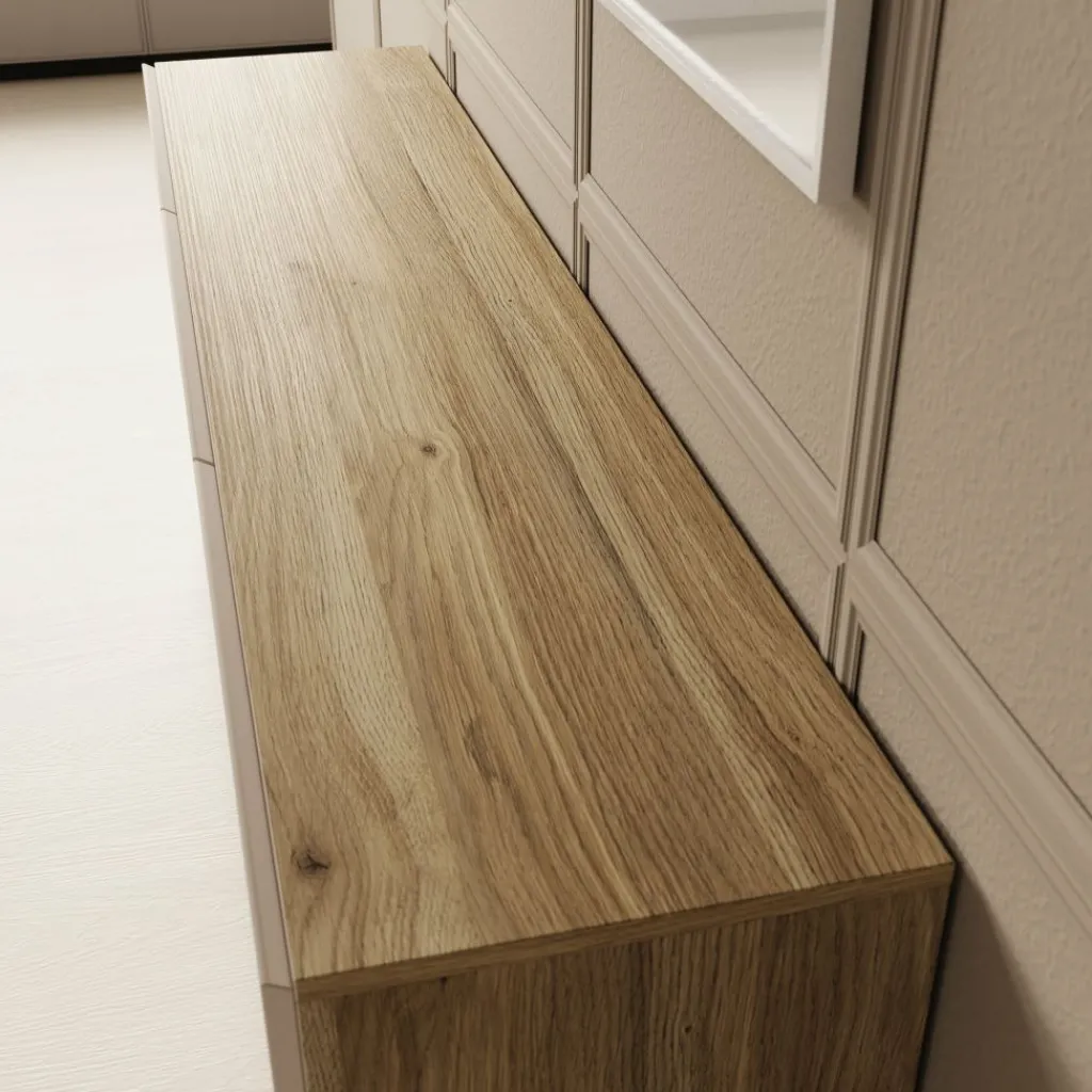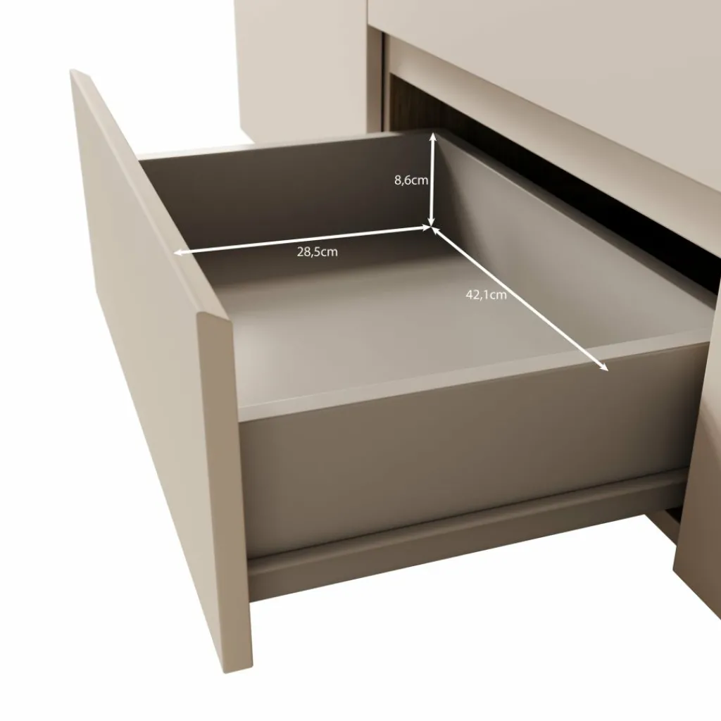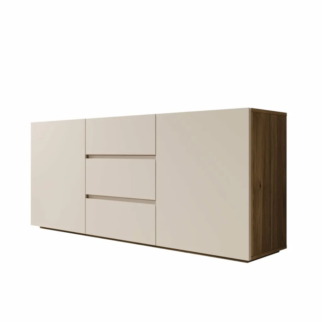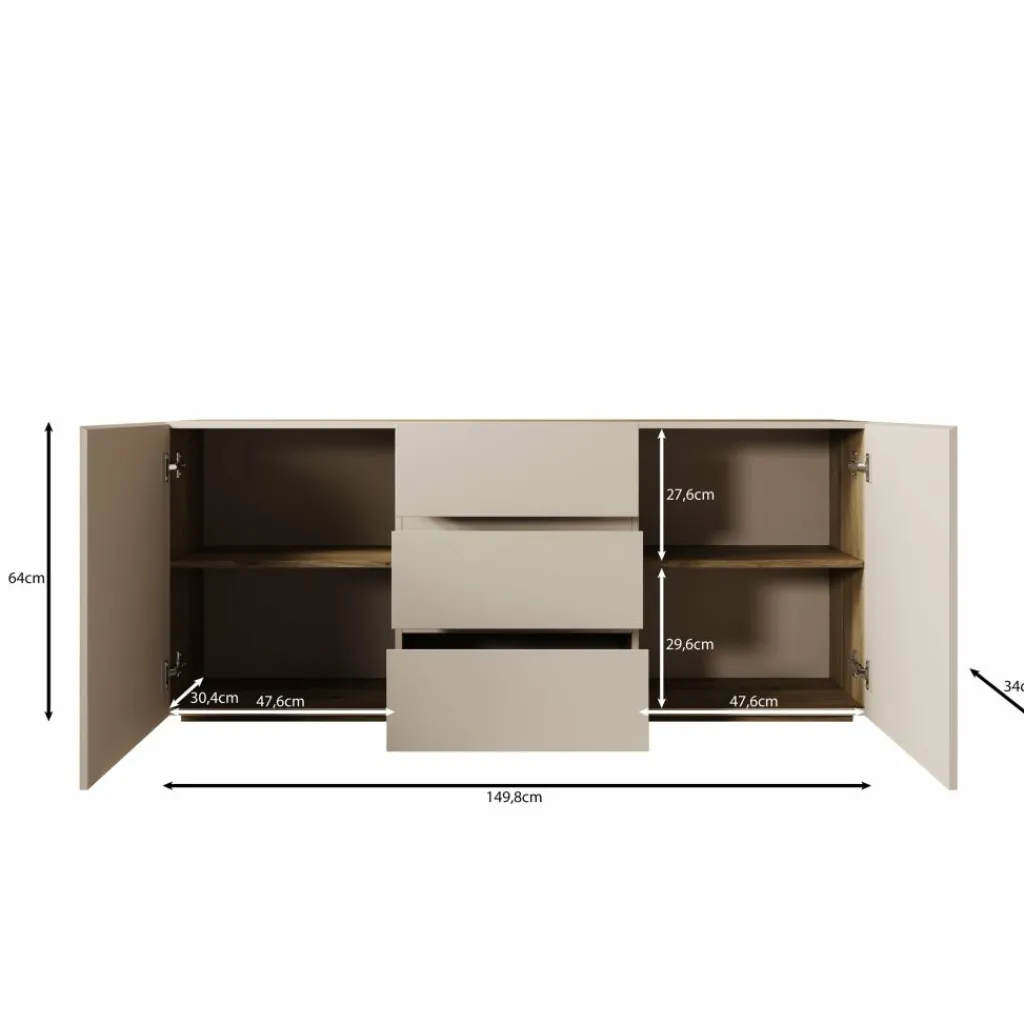 Het Cumi dressoir in beige met eikenpatroon is een strak en functioneel meubel met een moderne uitstraling. Het meubel is vervaardigd uit gelamineerd spaanplaat. De combinatie van het matte beige front en de houtlook aan de zijkanten en binnenzijde zorgt voor een eigentijds geheel dat goed past in diverse interieurs.