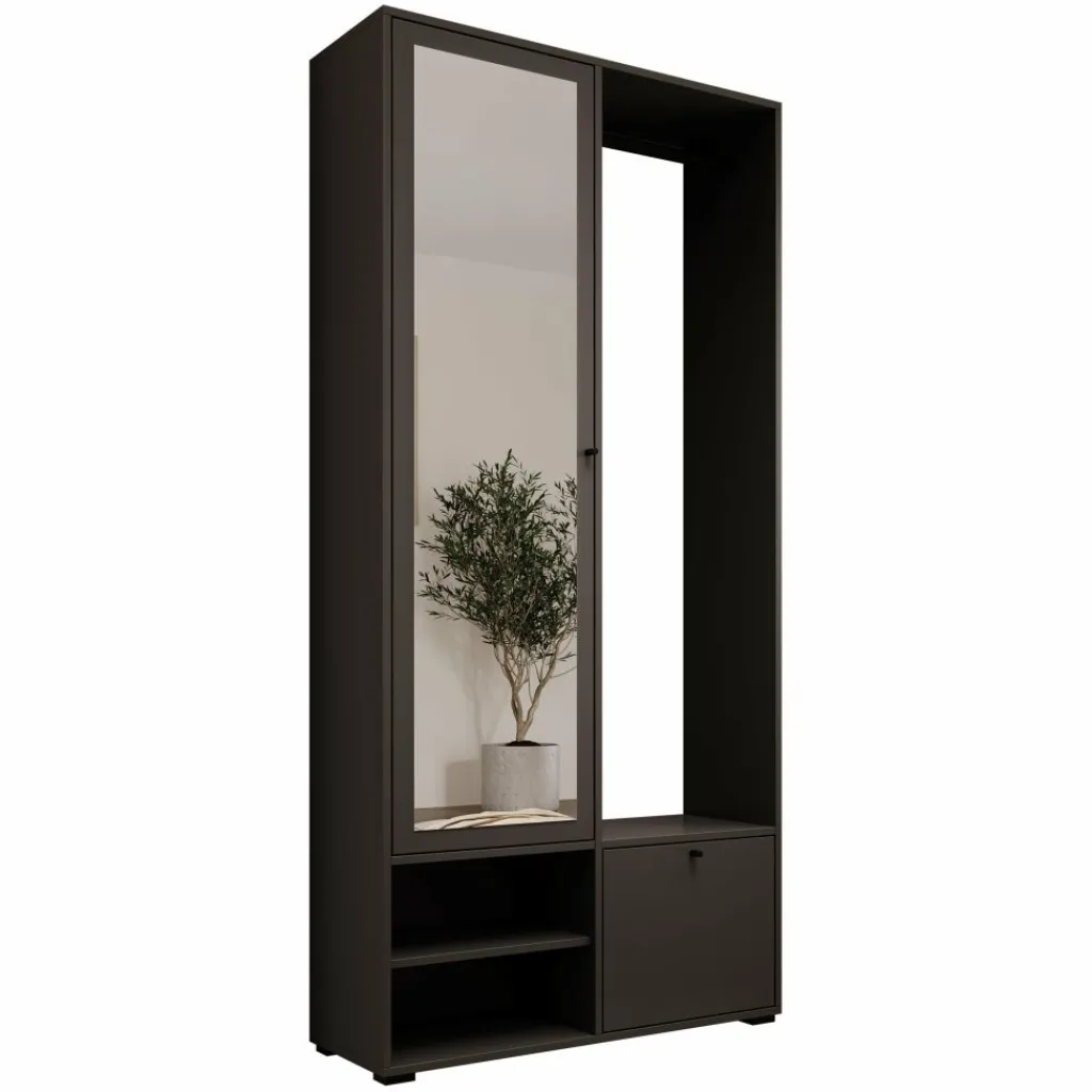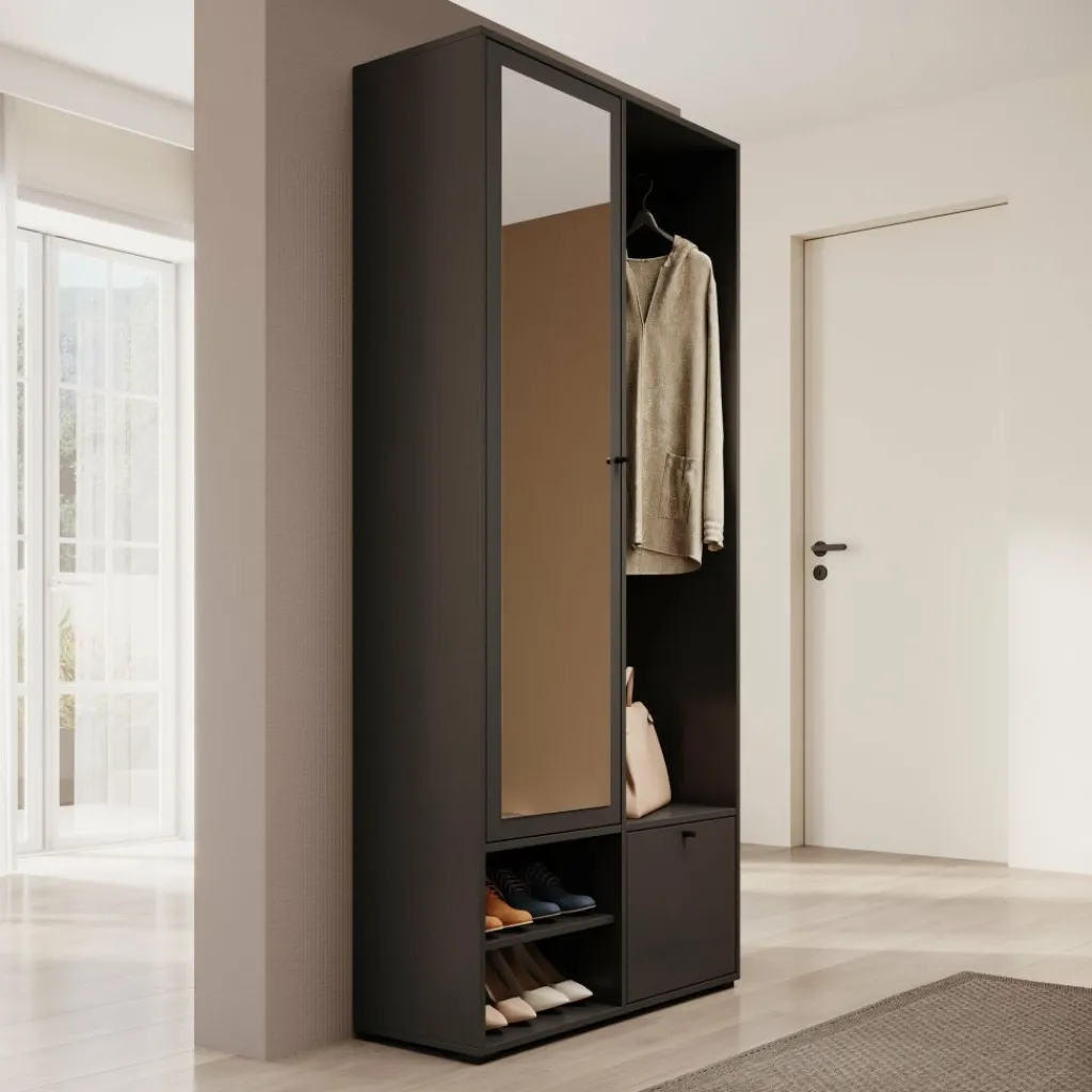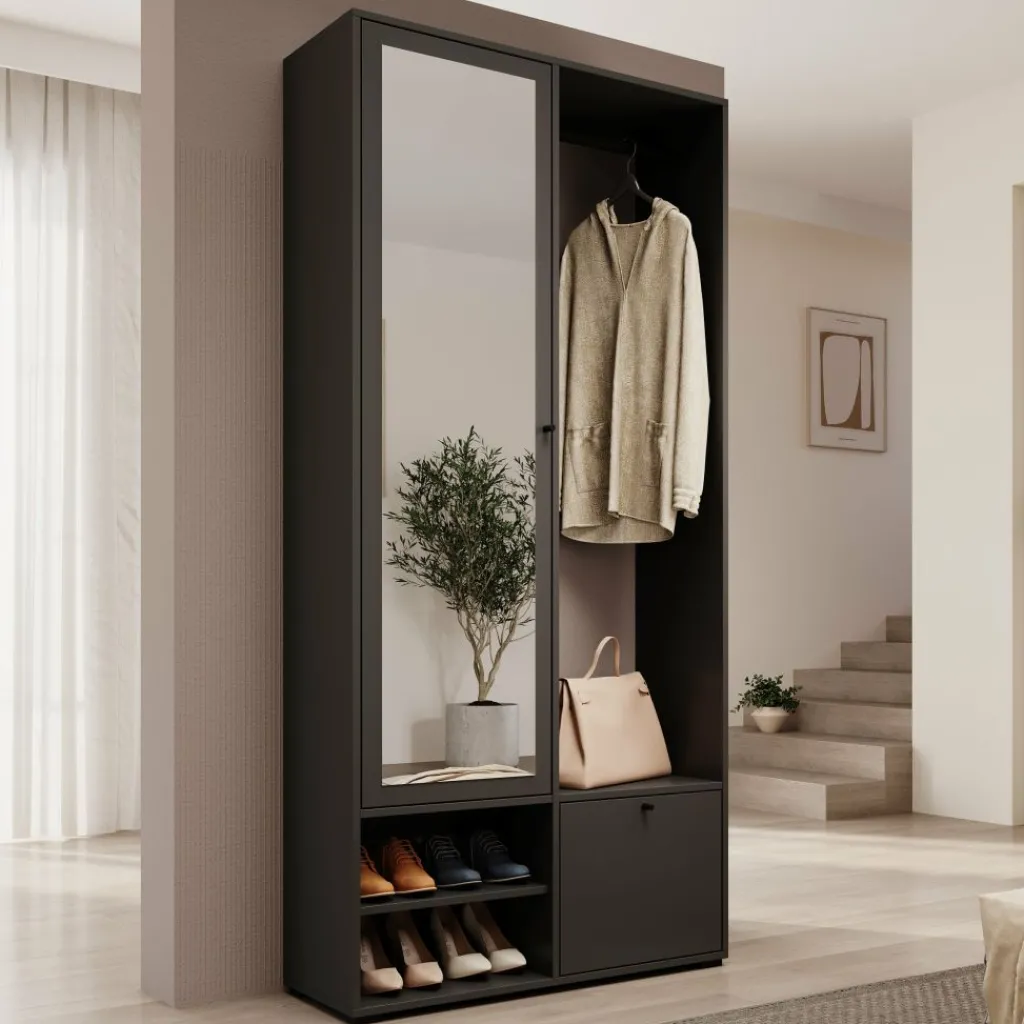 Halkast Deacon combineert een strakke uitstraling met slimme opbergruimte. Deze moderne kast in zwarte kleur is perfect voor de hal of gang en helpt je om alles overzichtelijk te houden. Achter de spiegeldeur zitten vijf ruime vakken, ideaal voor het opbergen van sjaals, handschoenen of andere accessoires. Aan de rechterzijde vind je een kledingroede voor jassen, een handig zitvlak met open vakken voor schoenen, en onderin een klepkastje voor extra opbergruimte. De zwarte knopgrepen geven de kast een strak accent.